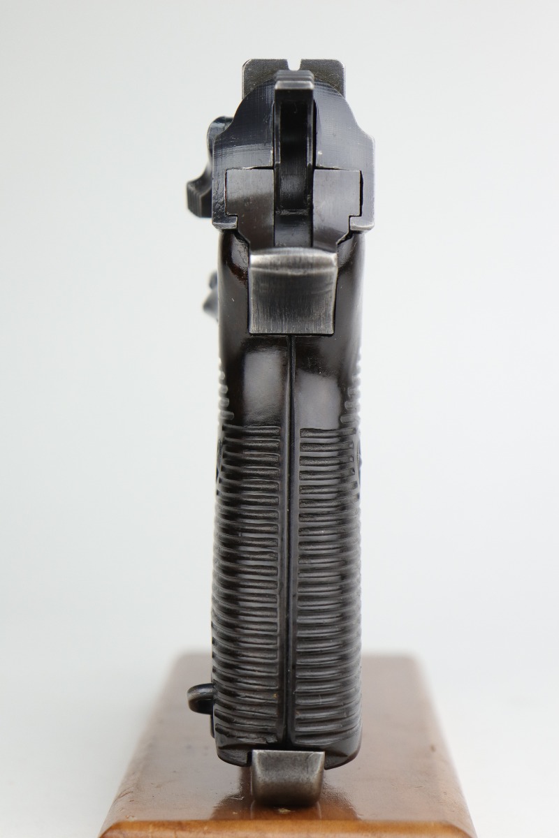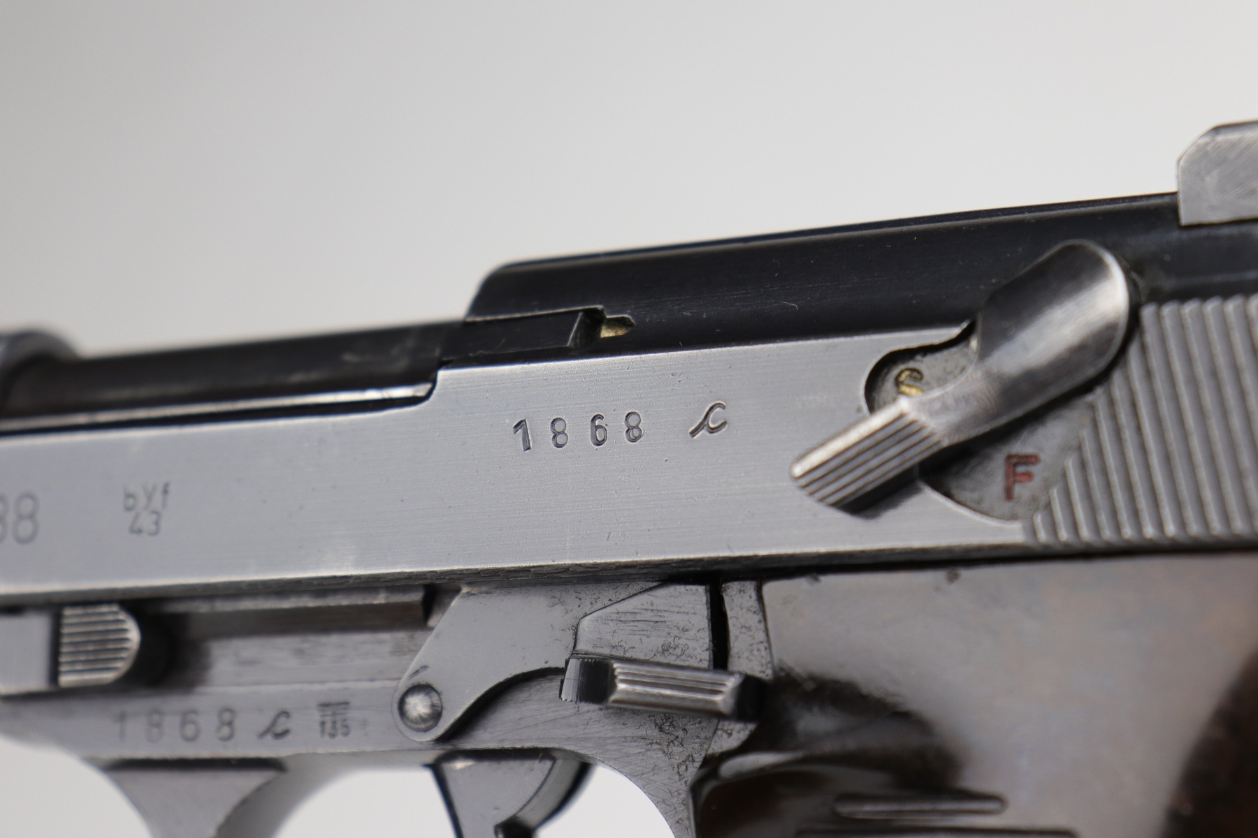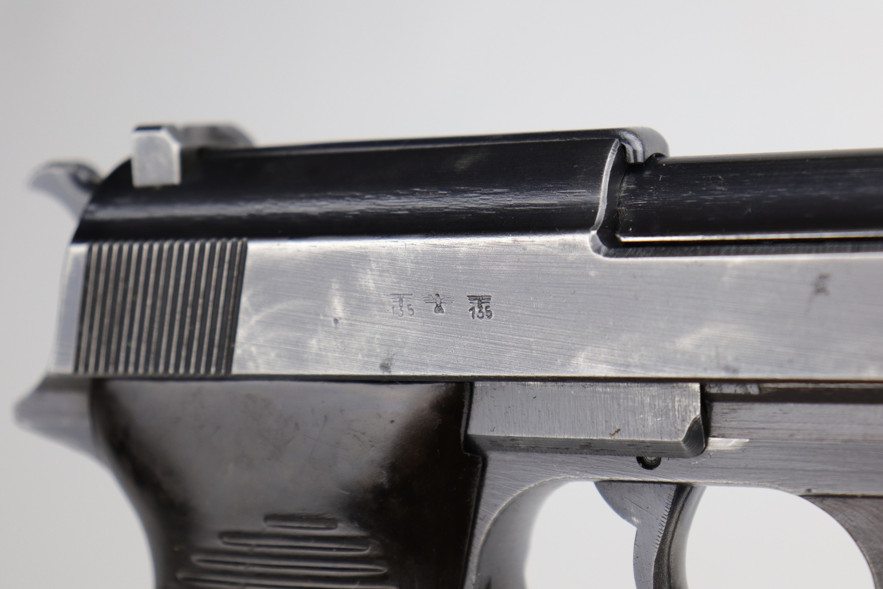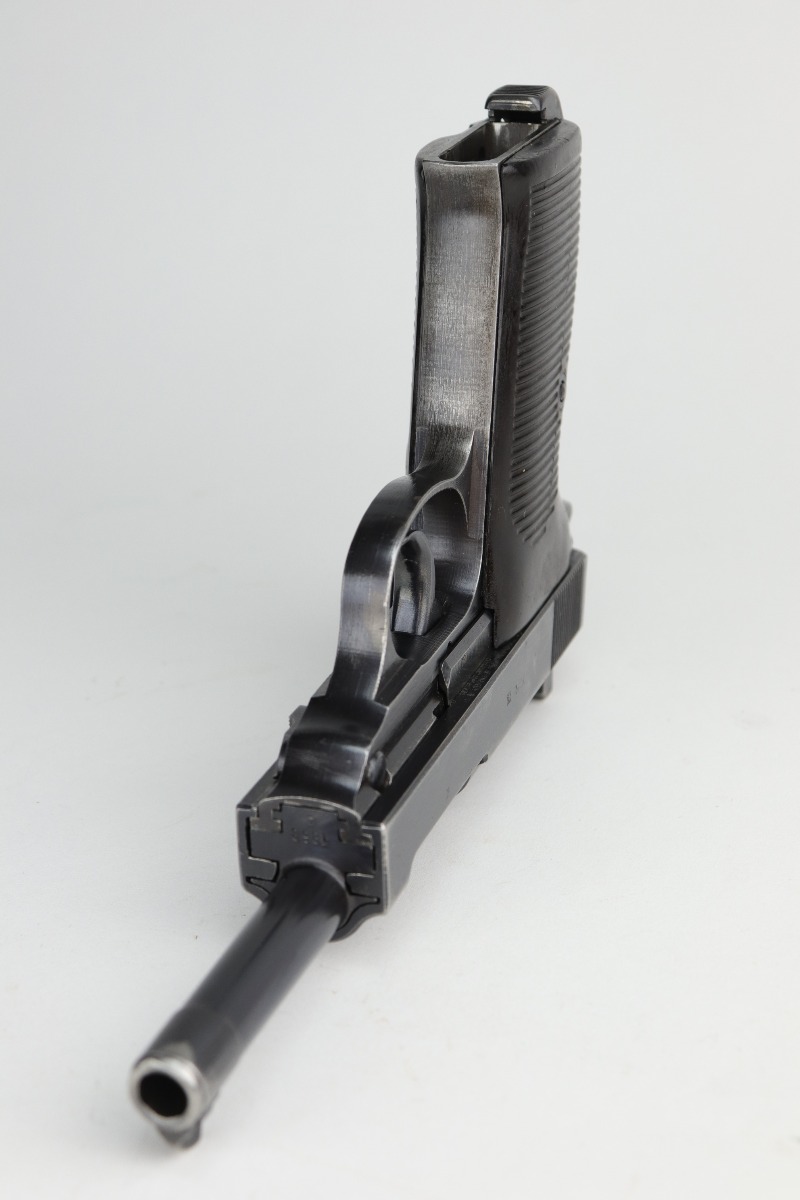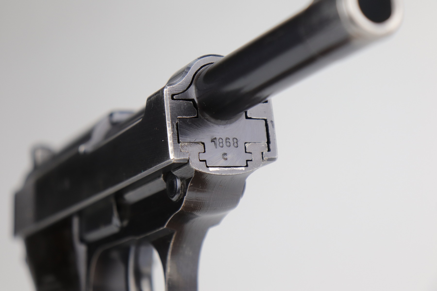 10/2/20 – This is a very nice example of a Mauser P.38 issued to the Nazi military in 1943. The gun is all matching and has the proper “Eagle 135” Nazi military proofs. It is fully functional, including the de-cocker. It has retained roughly 85% of its original bluing. Generally, there is muzzle wear and high edge wear throughout. There is spotty wear on the barrel, on the right side of the slide, and on the top plate. There is thinning on the front strap and on the tang. It has excellent grips and comes with one period-correct magazine. The bore has great rifling, but there is light freckling in the grooves.