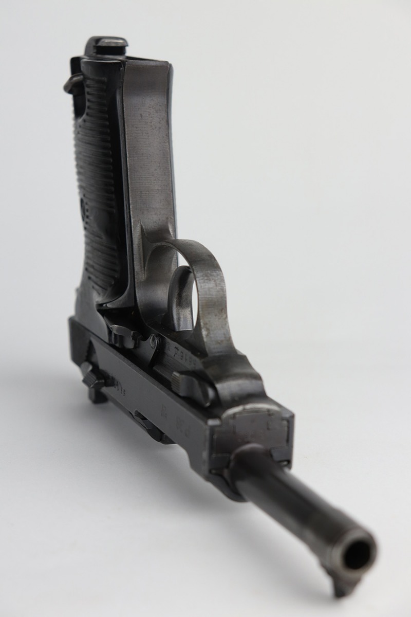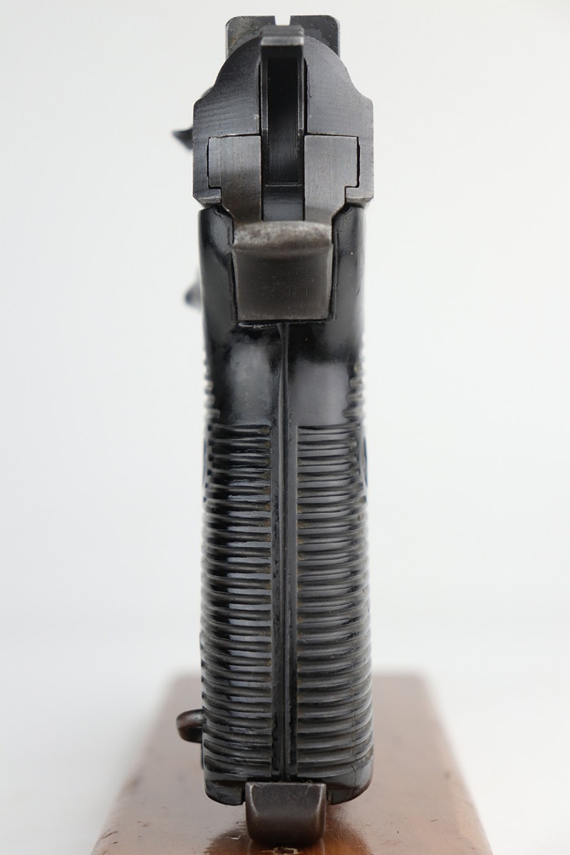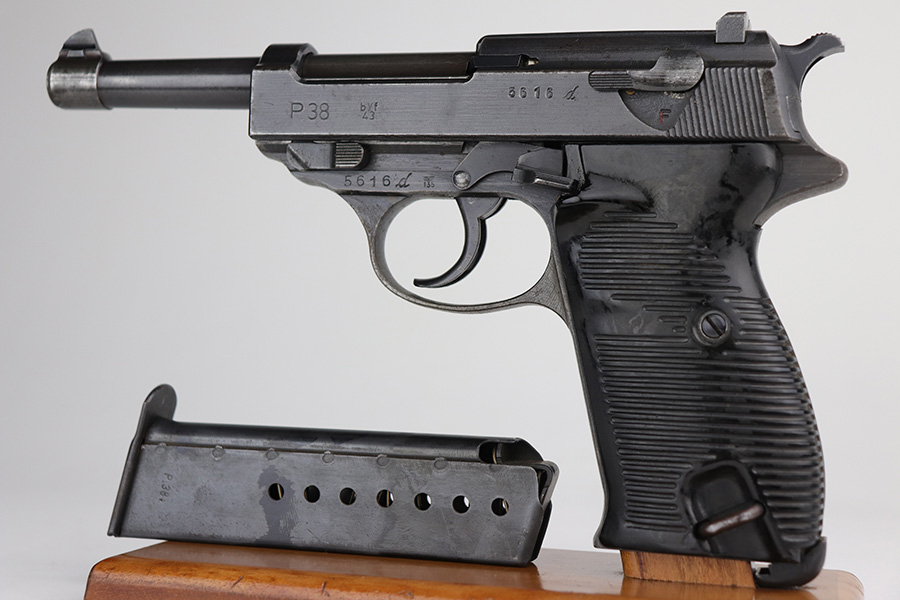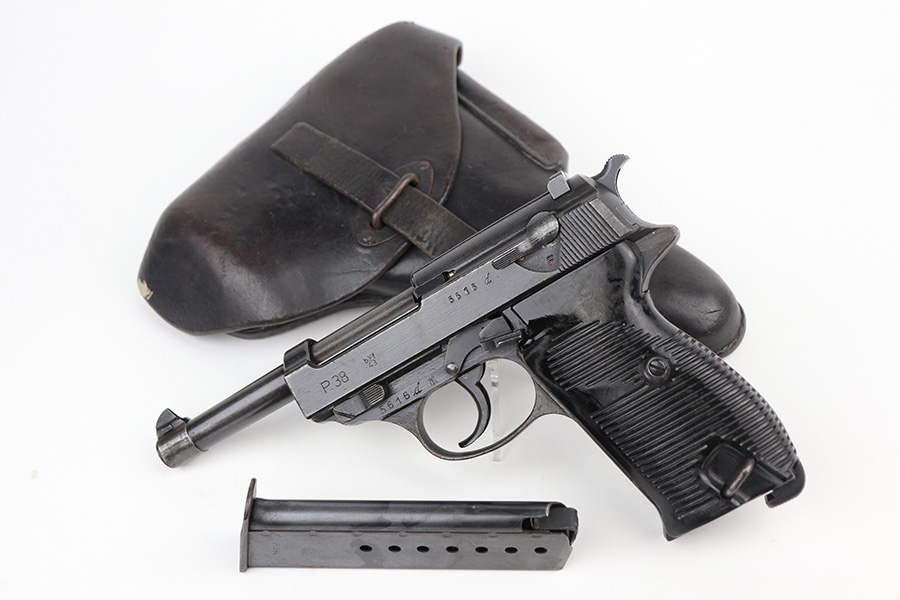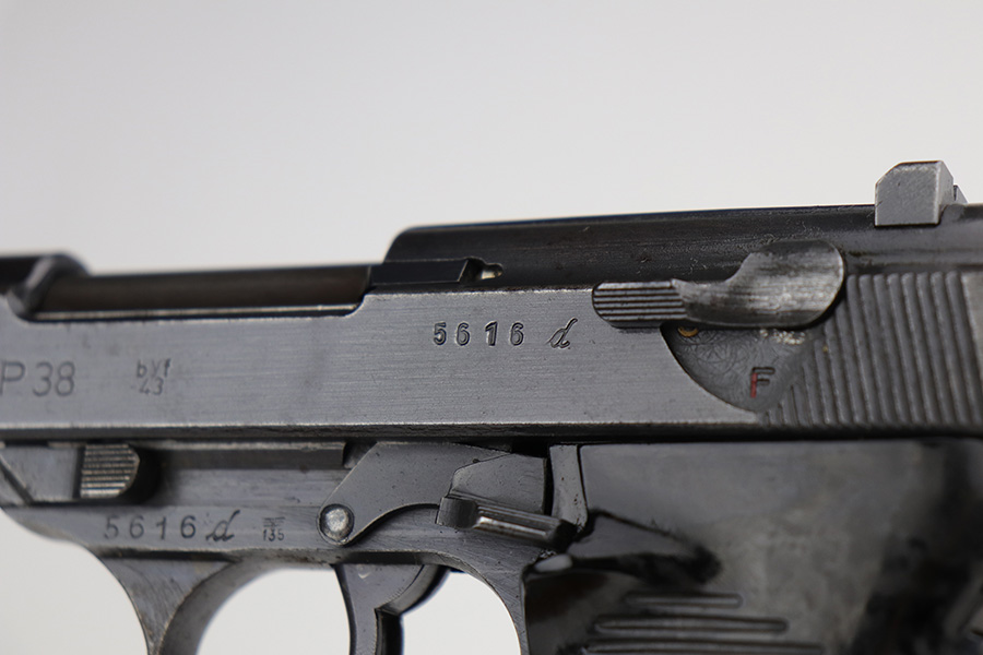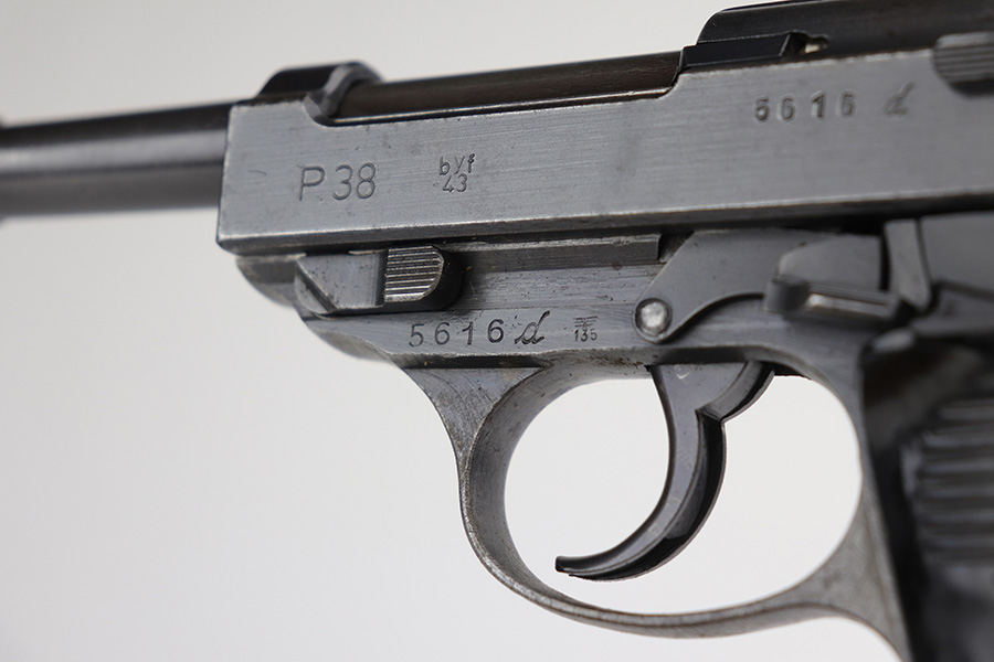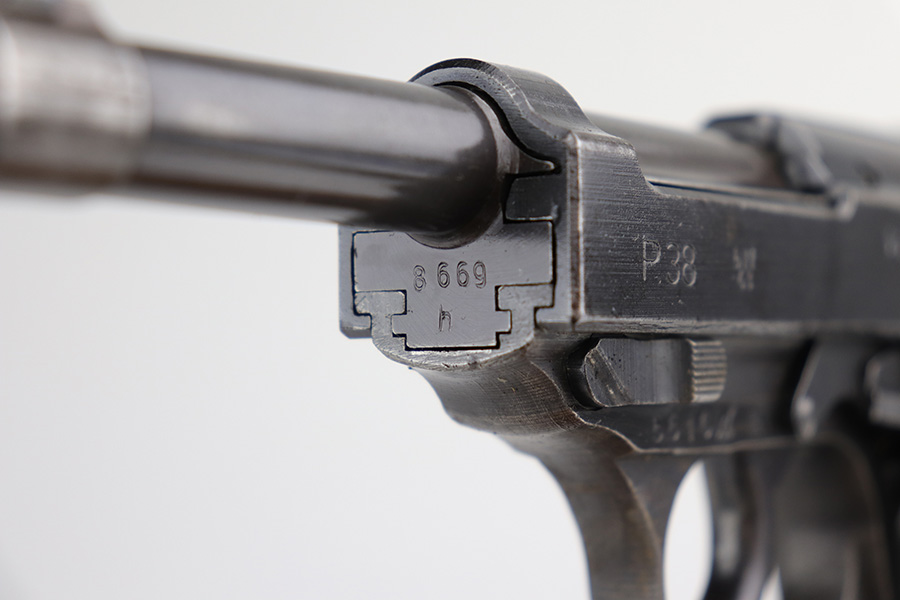 9/29/21 – This is a nice example of a Mauser P.38 rig issued to the Nazi military in 1943. The barrel is mismatched, the rest of the gun is matching and has the proper “Eagle 135” military acceptance proofs. The rig comes with a period-correct hard shell and a proper Mauser magazine. The gun has retained about 85% of its original dusty-blue finish. There is thinning on the barrel and minor wear around the muzzle and around the high edges in general. Spotty wear and splotchy discoloration on the underside of the frame and trigger guard. Dark brown patina on the front strap and spotty oxidation throughout. The bore has good rifling with spotty freckling throughout. De-cocker is functional.