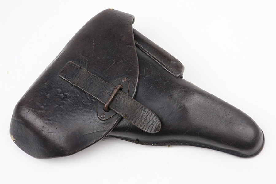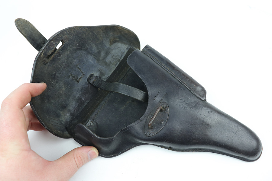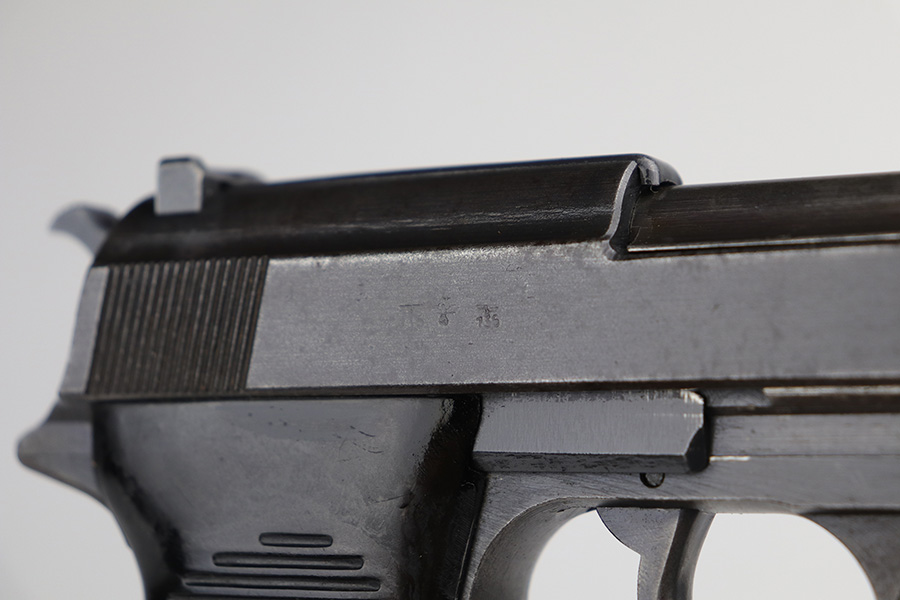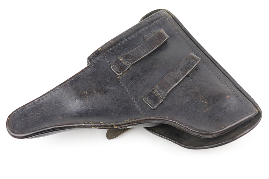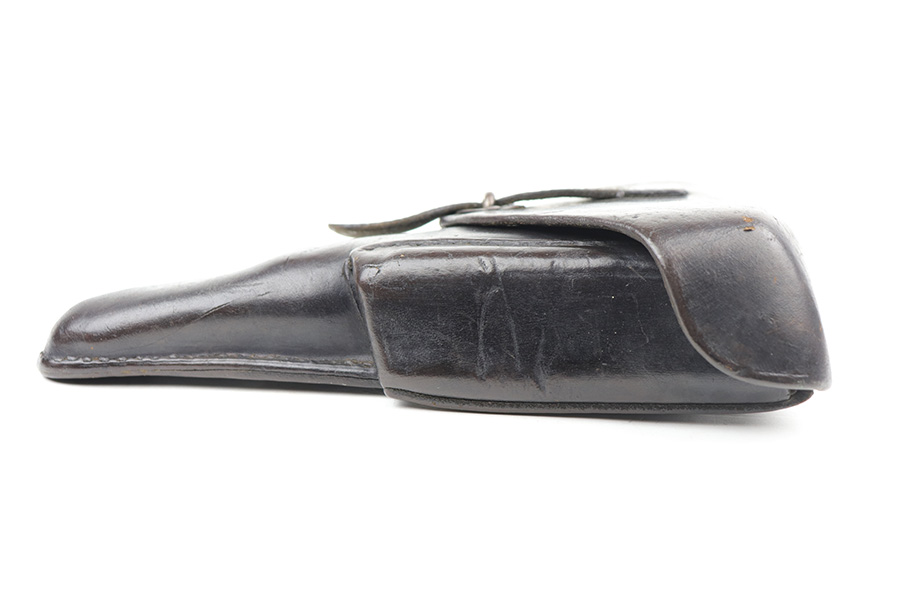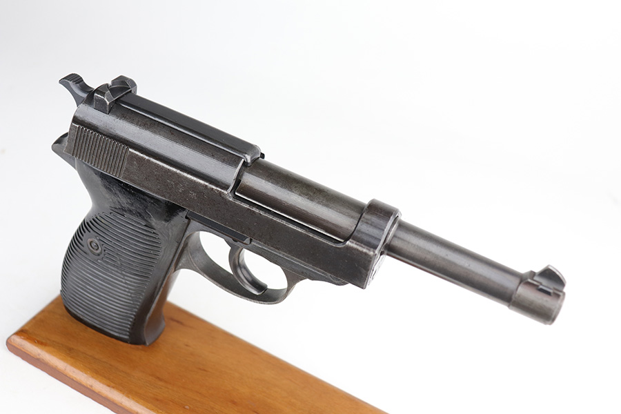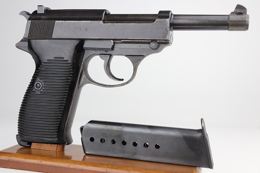 9/29/21 – This is a nice example of a Mauser P.38 rig issued to the Nazi military in 1943. The barrel is mismatched, the rest of the gun is matching and has the proper “Eagle 135” military acceptance proofs. The rig comes with a period-correct hard shell and a proper Mauser magazine. The gun has retained about 85% of its original dusty-blue finish. There is thinning on the barrel and minor wear around the muzzle and around the high edges in general. Spotty wear and splotchy discoloration on the underside of the frame and trigger guard. Dark brown patina on the front strap and spotty oxidation throughout. The bore has good rifling with spotty freckling throughout. De-cocker is functional.
