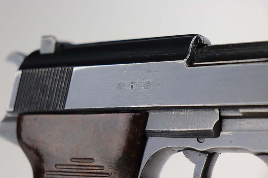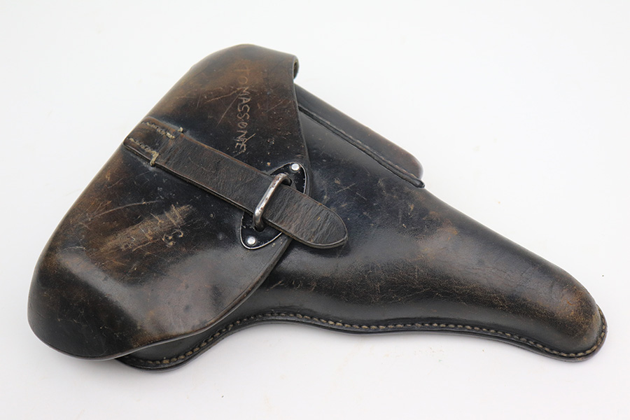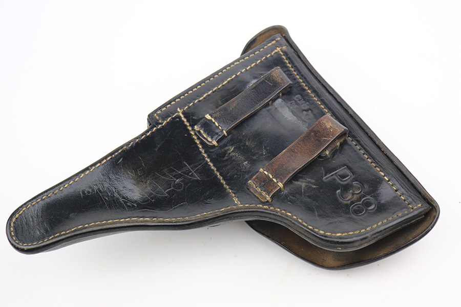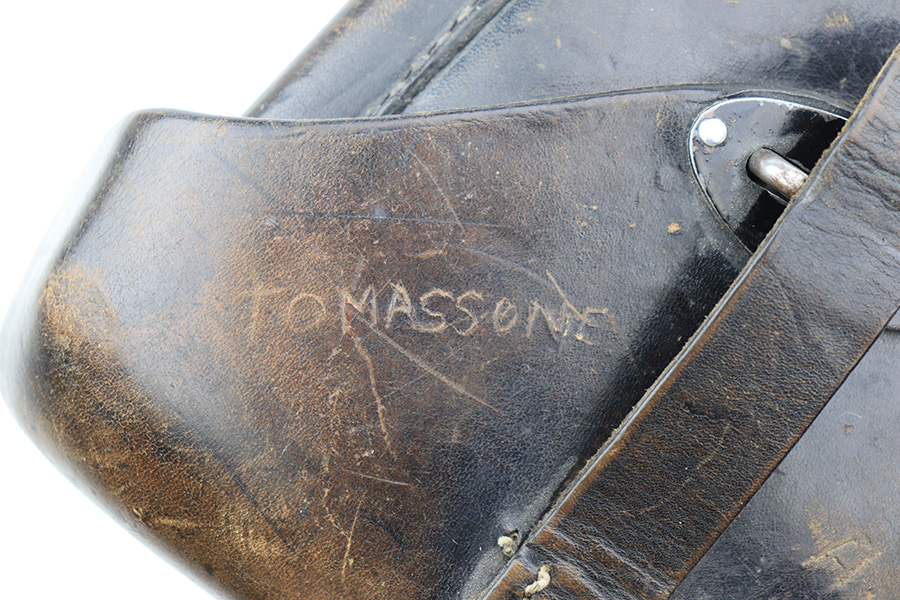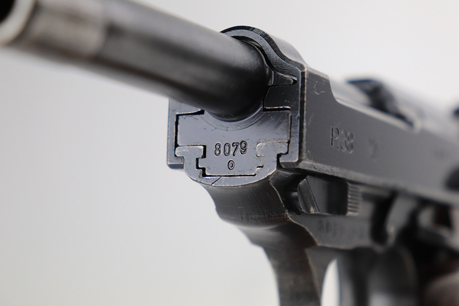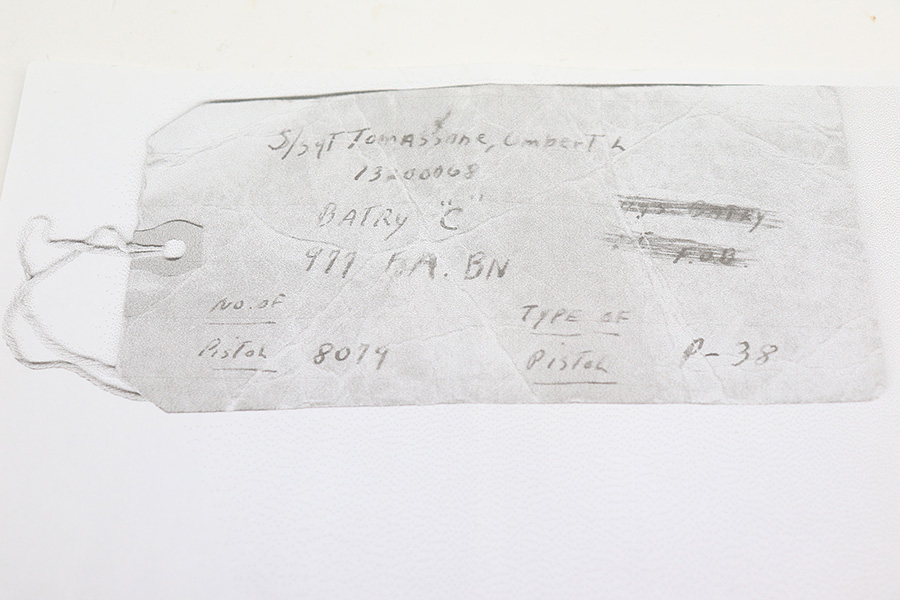 12/3/21 – This is a very nice example of a Mauser P.38 issued to the Nazi military in 1943. It is all matching and has the proper “Eagle 135” Nazi military acceptance proofs throughout. It comes as a rig with a nice 1941-dated waffen-proofed holster and a period-correct Mauser magazine. The names “Ardry Tomassone” are scratched into the leather of the holster in a few places. The seller was able to find some information about this vet, Umbert Tomassone. This information includes his honorable discharge, a summary of his military career, and what looks like a tag that was originally on the gun when it was brought home. Photocopies of these documents are included. The gun has retained roughly 85% of its original bluing. The majority of the finish loss is on the front strap and the barrel. But there are also areas of minor wear on the high edges of the slide and around the muzzle. There are a few very light scratches/handling marks on the right side of the slide. Comes with excellent period-correct reddish grips. The bore is shiny with strong rifling, but there are areas of freckling throughout. De-cocker is functional.