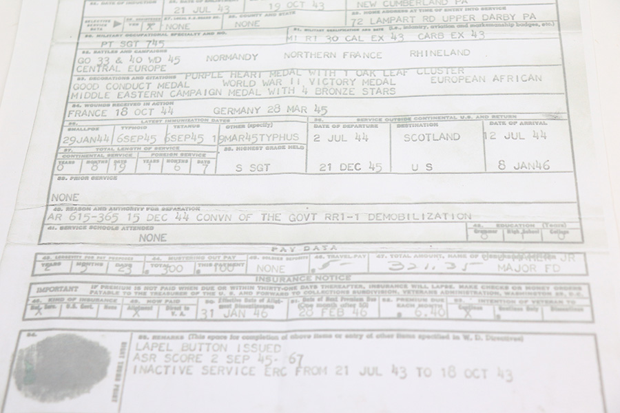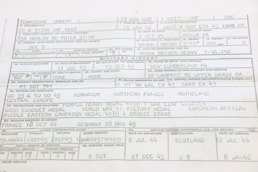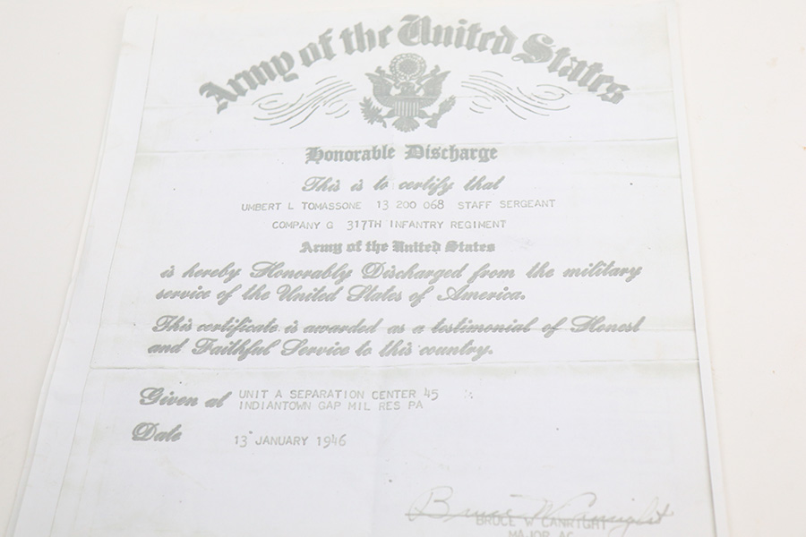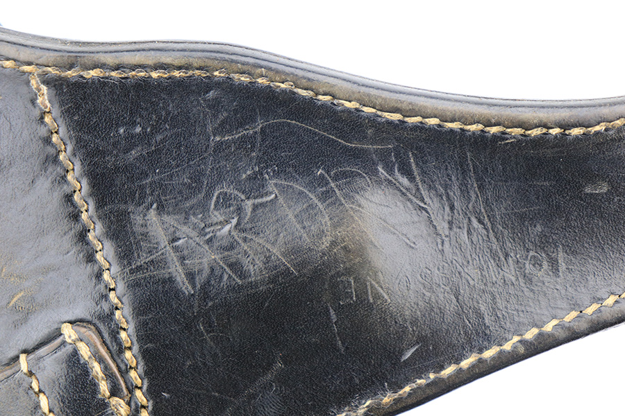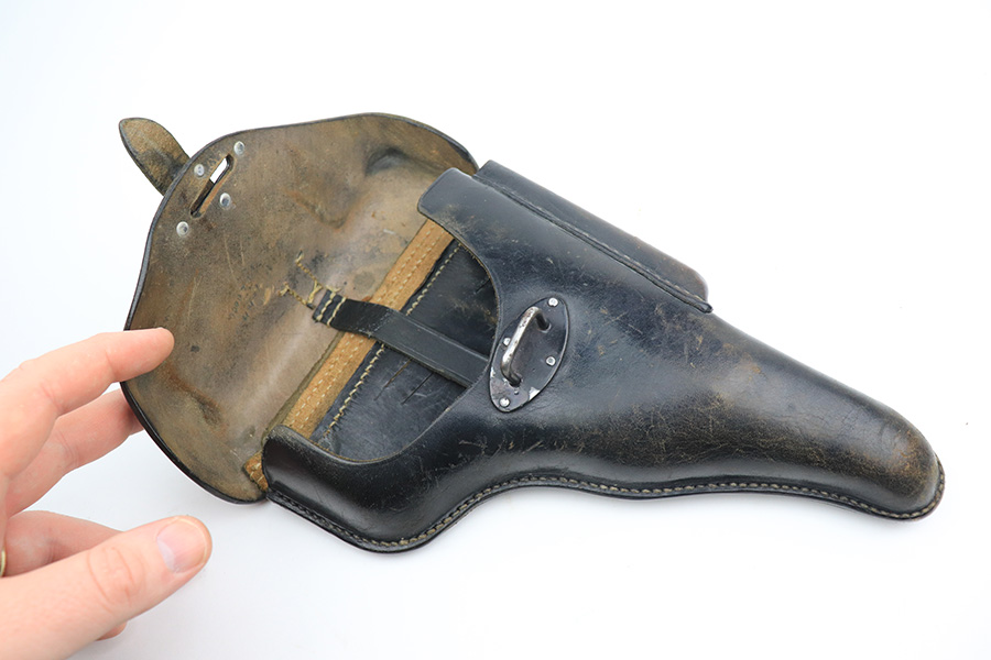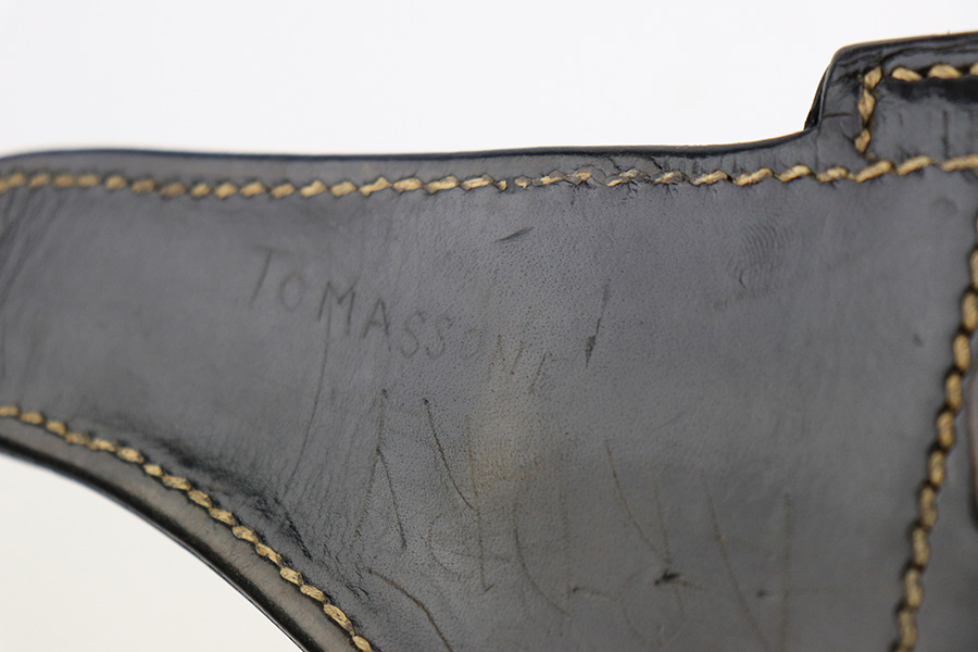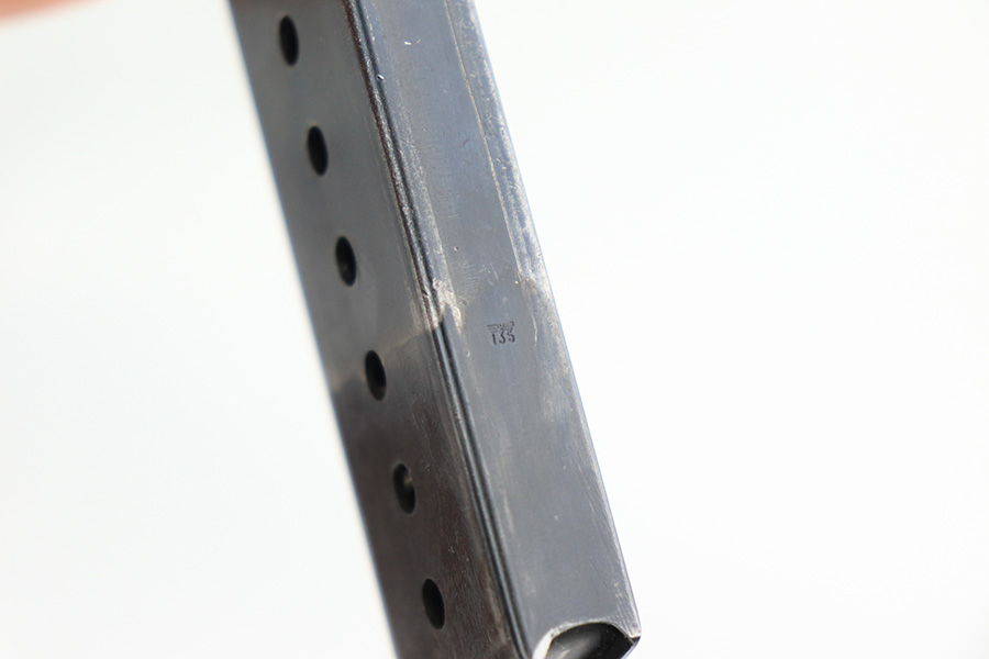 12/3/21 – This is a very nice example of a Mauser P.38 issued to the Nazi military in 1943. It is all matching and has the proper “Eagle 135” Nazi military acceptance proofs throughout. It comes as a rig with a nice 1941-dated waffen-proofed holster and a period-correct Mauser magazine. The names “Ardry Tomassone” are scratched into the leather of the holster in a few places. The seller was able to find some information about this vet, Umbert Tomassone. This information includes his honorable discharge, a summary of his military career, and what looks like a tag that was originally on the gun when it was brought home. Photocopies of these documents are included. The gun has retained roughly 85% of its original bluing. The majority of the finish loss is on the front strap and the barrel. But there are also areas of minor wear on the high edges of the slide and around the muzzle. There are a few very light scratches/handling marks on the right side of the slide. Comes with excellent period-correct reddish grips. The bore is shiny with strong rifling, but there are areas of freckling throughout. De-cocker is functional.