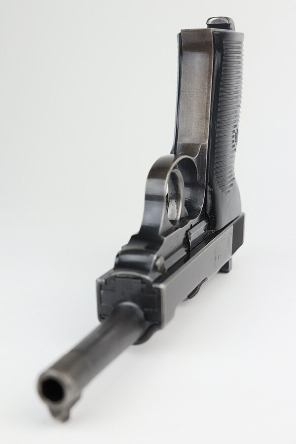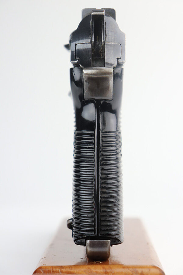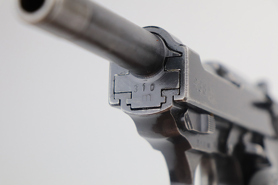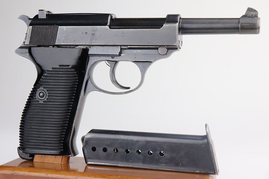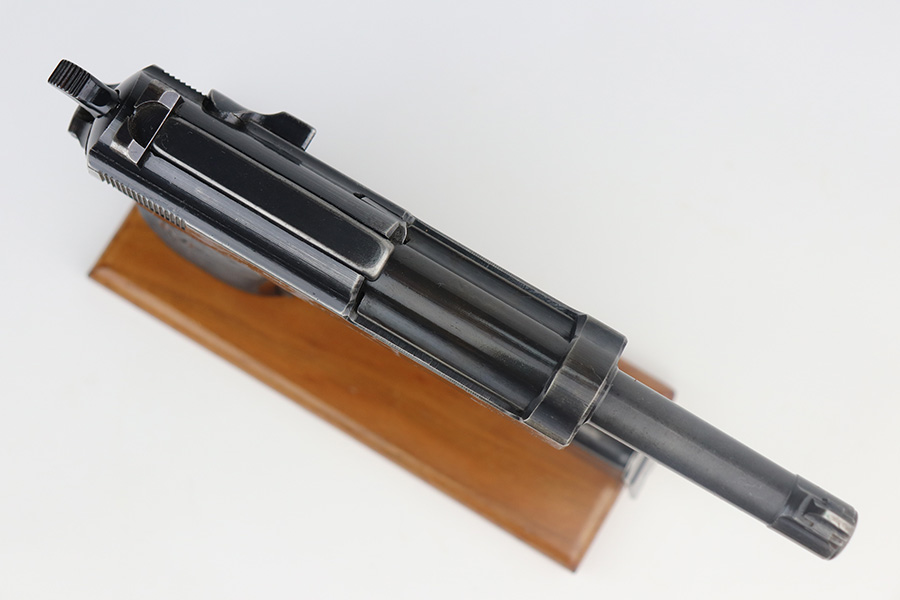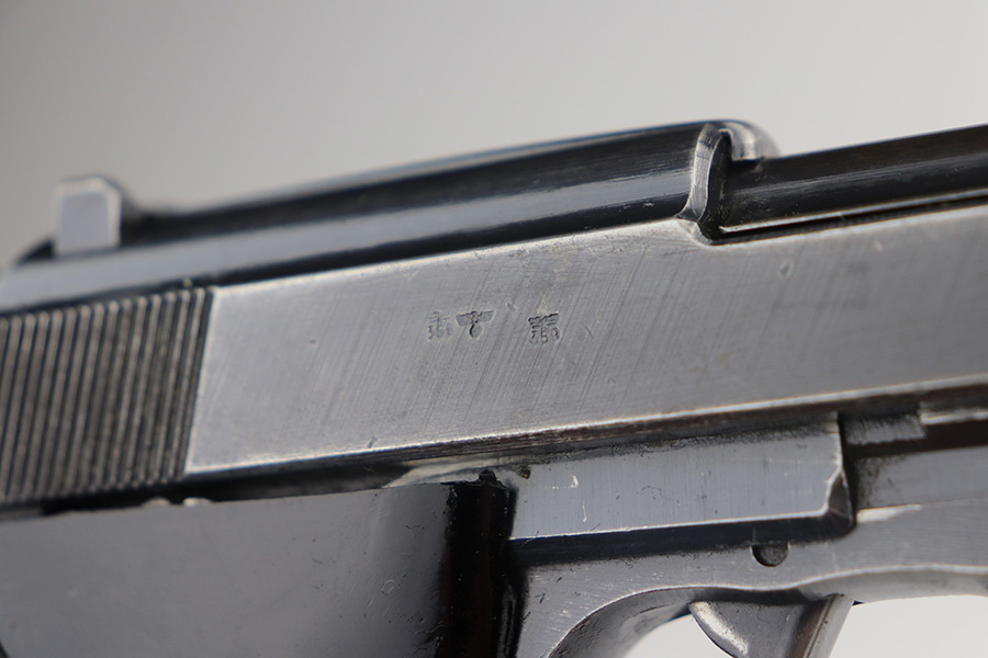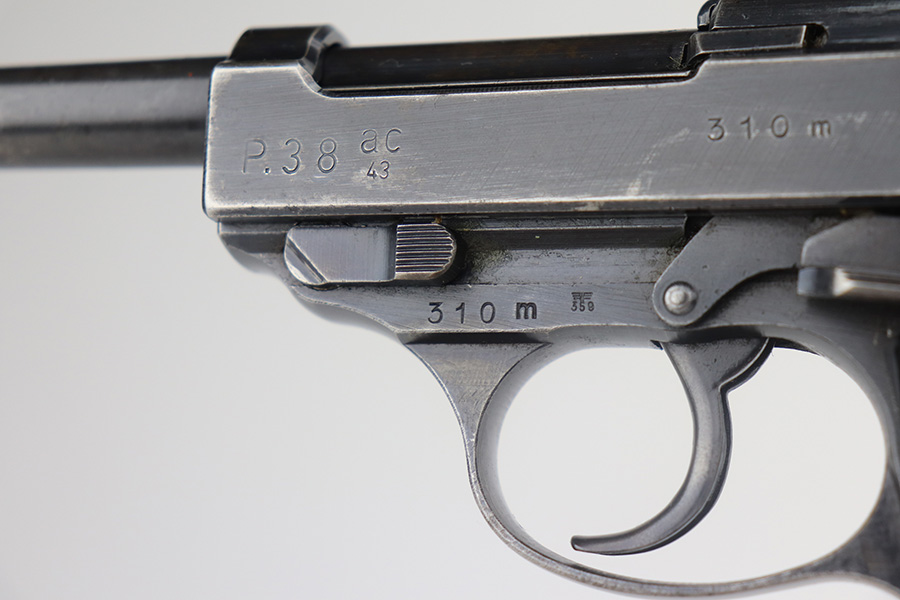 5/28/21 – This is a very nice example of a Walther P.38 issued to the Nazi military in 1943. The gun is all matching and has the proper “Eagle 359” military proofs. It has retained about 80-85% of its original bluing. Most of the wear is on the front strap. There is minor wear on the high edges of the slide and around the muzzle. Spotty wear on the left side of the slide. Minor thinning on the barrel. Some patina on the front strap and tiny dots of oxidation on the barrel. Comes with nice grips that were cut down on the tops and a period-correct Walther magazine. Excellent bore – shiny with strong rifling. De-cocker is functional.