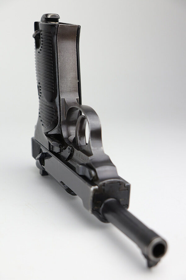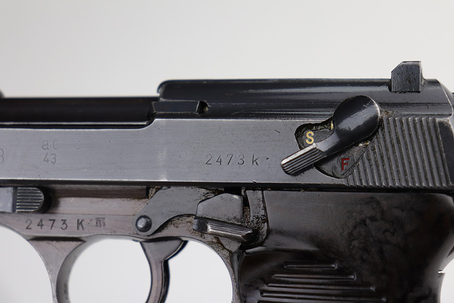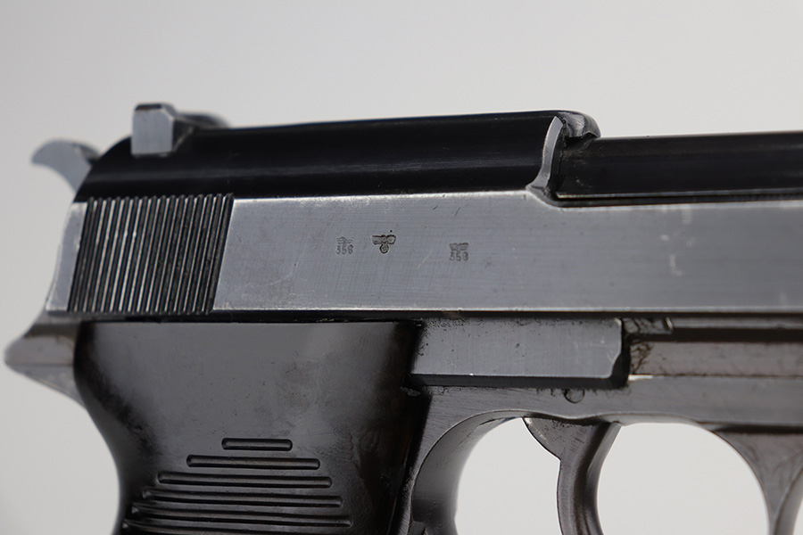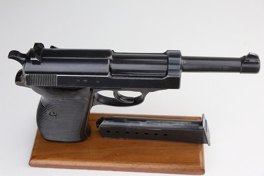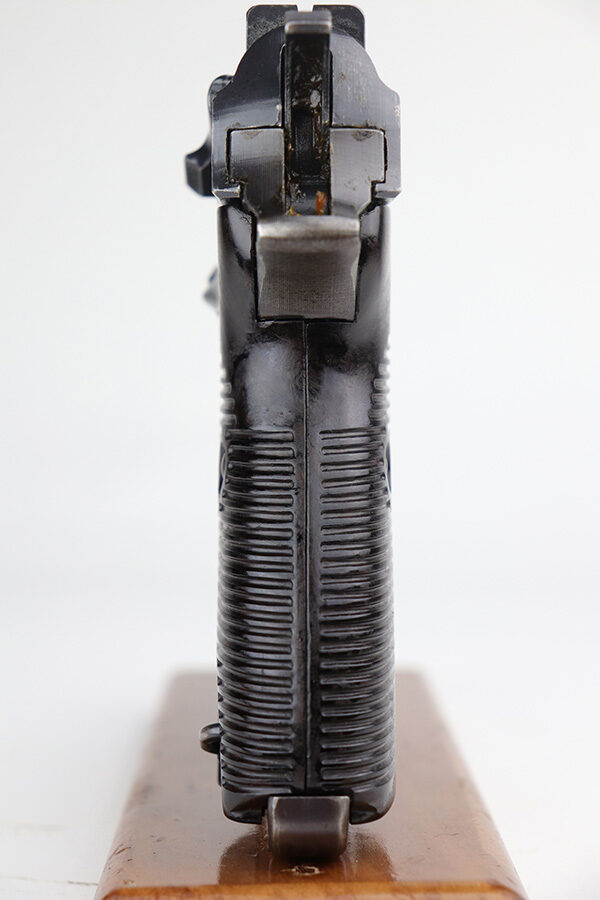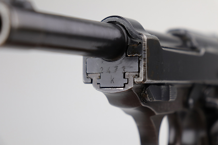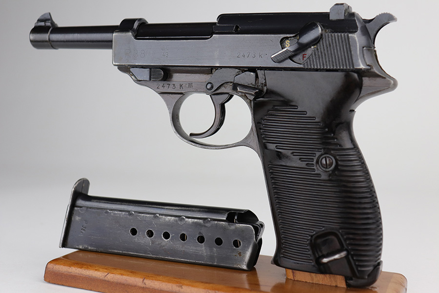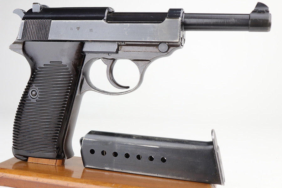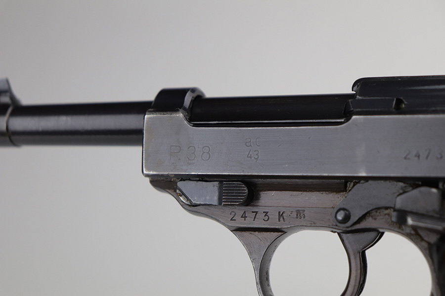 9/13/21 – This is a very nice example of a Walther P.38 issued to the Nazi military in 1943. It is all matching and has the proper “Eagle 359” military acceptance proofs. It has retained about 93-94% of its finish. Most of the finish loss is on the front strap, so the profile views are very nice. Patina on the front strap as well. Minor wear on the high edges of the slide and around the muzzle. A few dots of discoloration at the front of the left side of the slide. Some areas of very minor spotty wear on both sides of the slide. Comes with excellent grips and a period-correct Mauser magazine. Excellent bore with very minor freckling in the grooves. De-cocker and safety are functional.