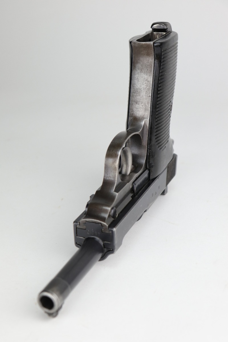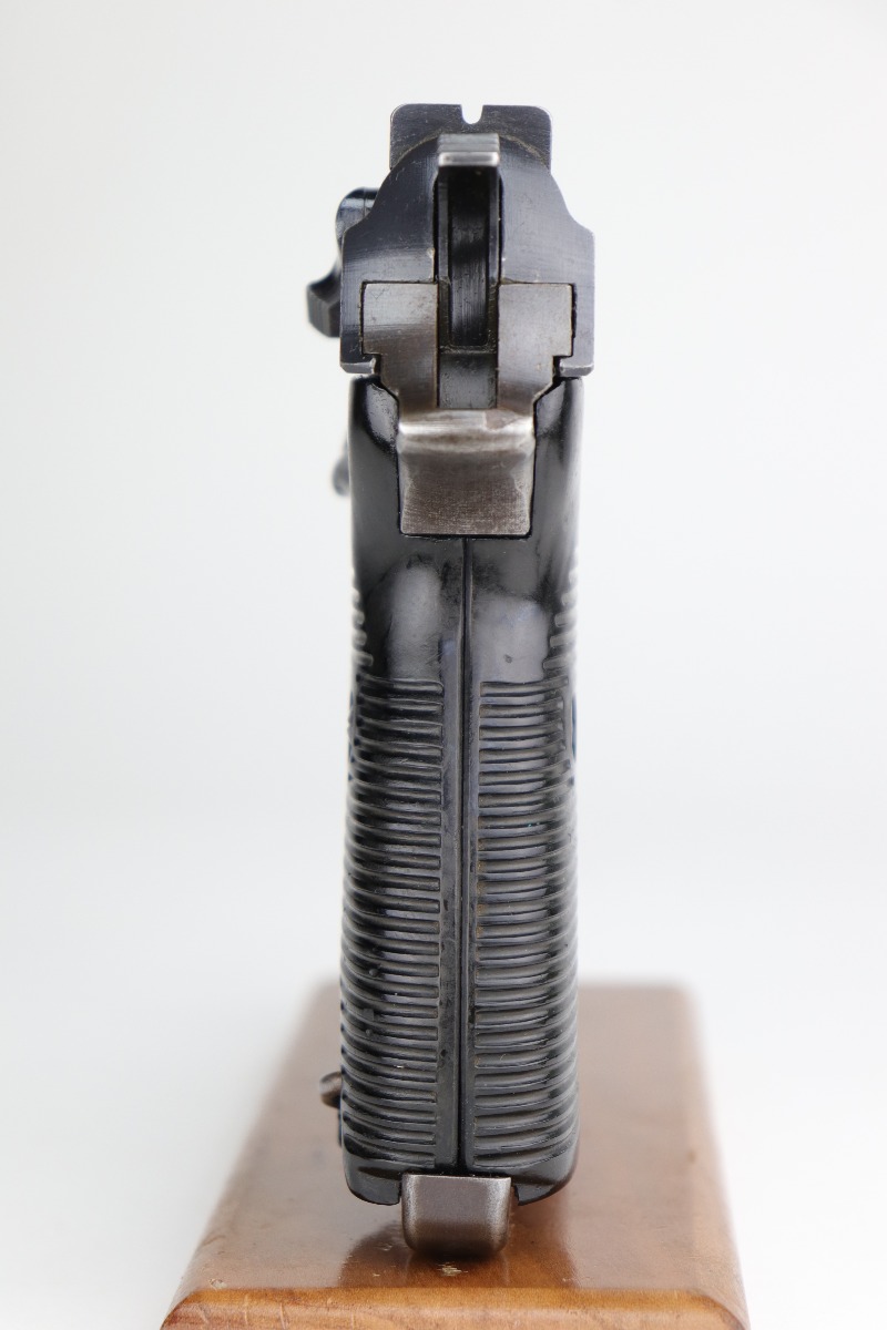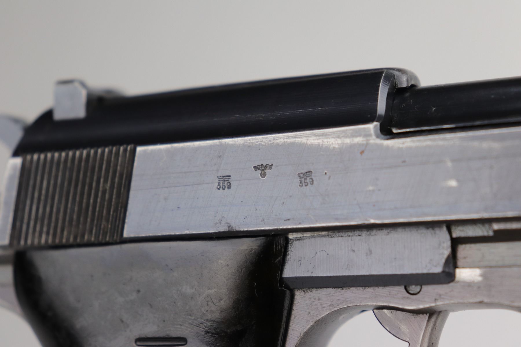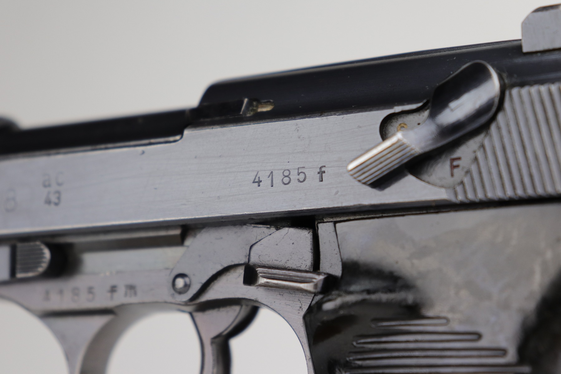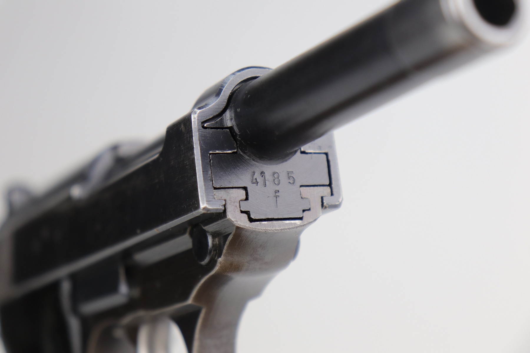 9/30/20 – This is an original Walther P.38 rig issued to the Nazi military in 1943. The rig comes with two period-correct magazines and a nice, 1944-dated holster. The gun is all matching and has the proper “Eagle 359” Nazi military acceptance proofs. It is fully functional, including the de-cocker. This particular gun has retained roughly 70% of its original bluing. The most noticeable wear is on the underside of the frame and front strap. There is also spotty patina in those areas. There is muzzle wear and high edge wear on the slide. There are small surface scratches/handling marks along the right side of the slide. Wear on the underside of the tang. The bore is excellent – shiny with strong rifling. The holster is soft and waffenamt.