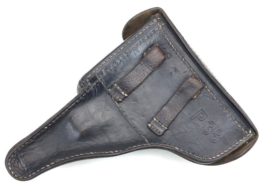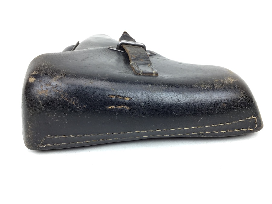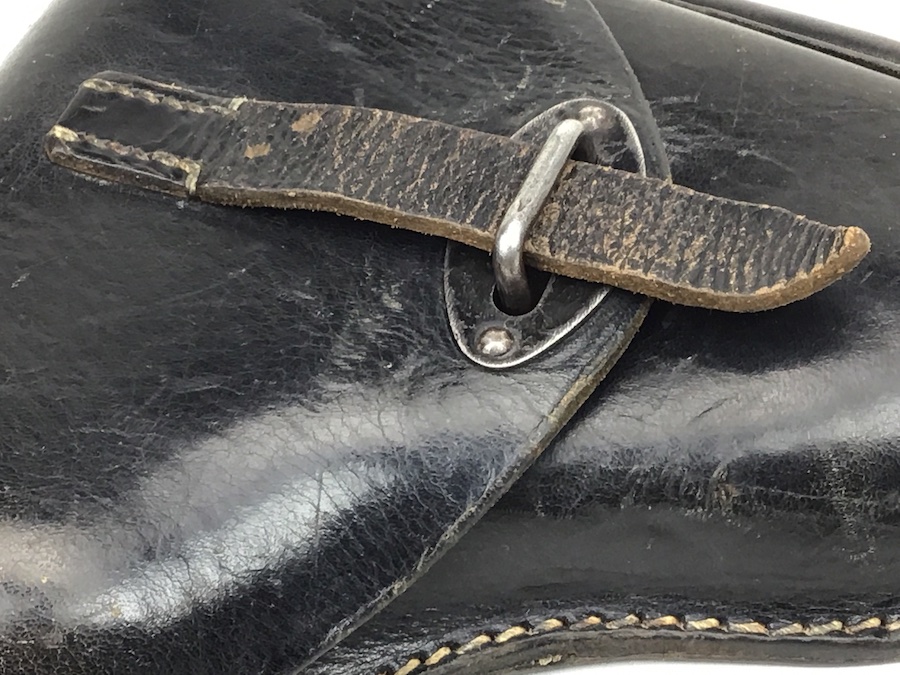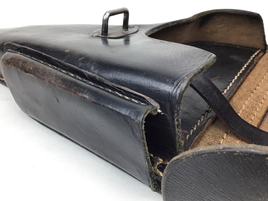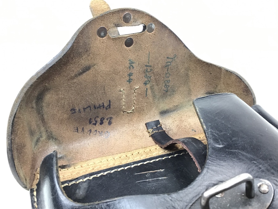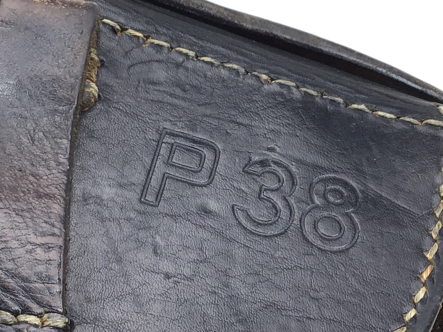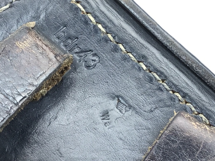 1/16/20 – This is an original 1943 dated P.38 holster from WW2. The back of the holster is waffen proofed, maker stamped, and dated. The markings are somewhat faded yet still visible. All original stitching is in tact as is the leather. The leather has normal pliability and some normal wrinkling. Clean interior leather with secure lift strap. Some personalized ink marks under the flap. Guaranteed original and authentic.
