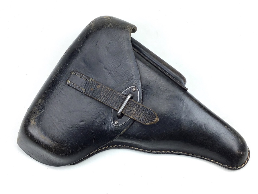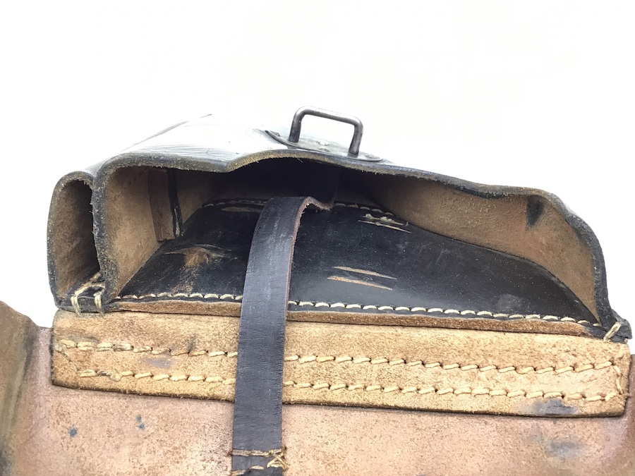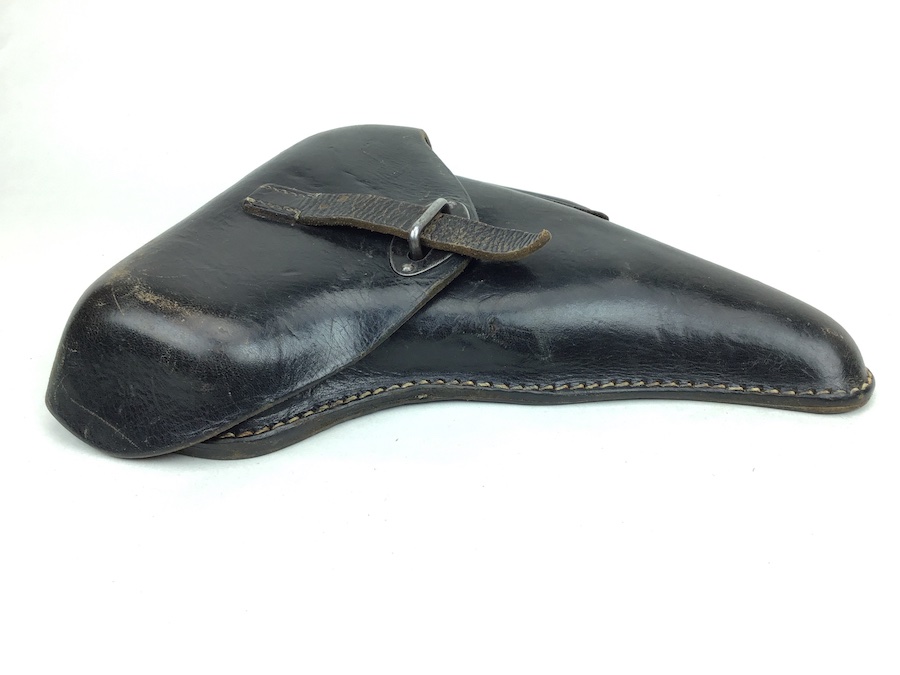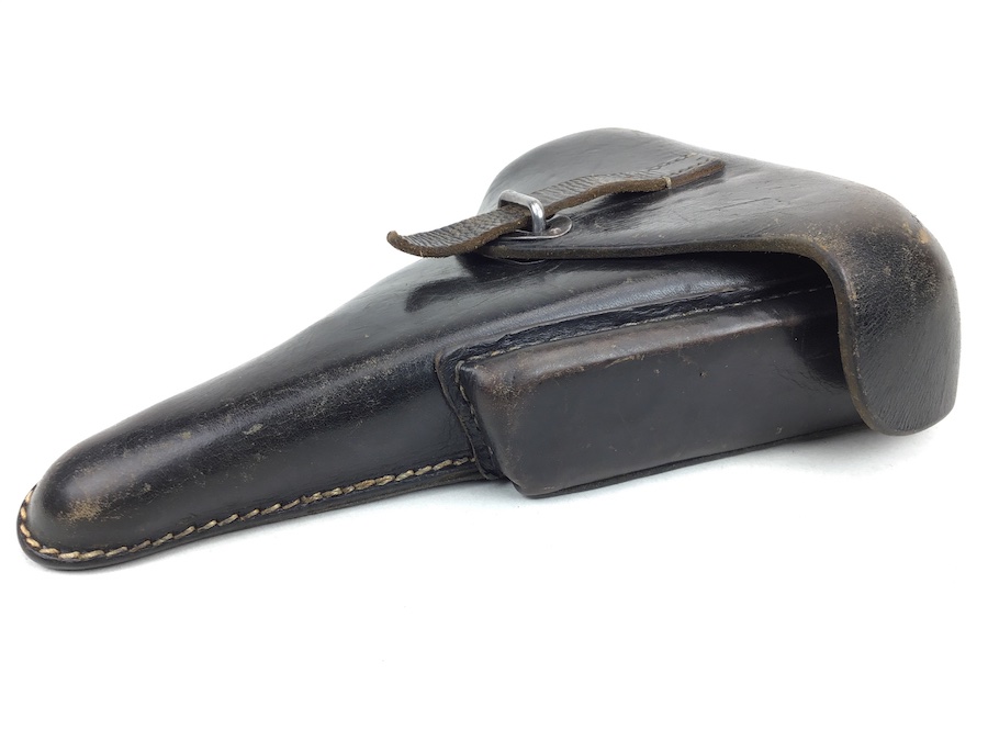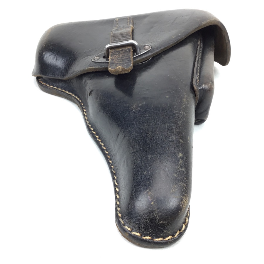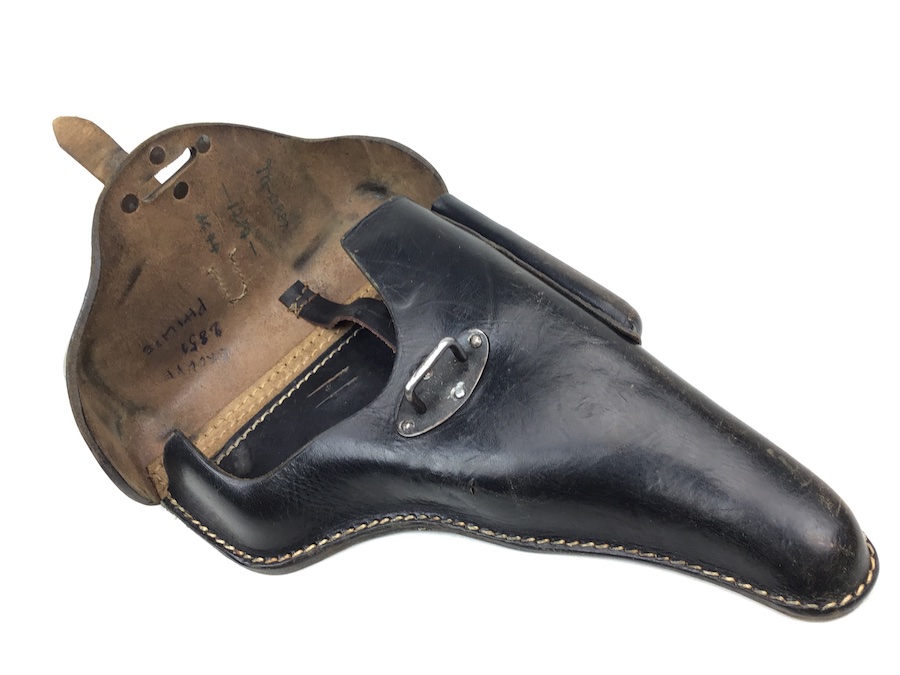 1/16/20 – This is an original 1943 dated P.38 holster from WW2. The back of the holster is waffen proofed, maker stamped, and dated. The markings are somewhat faded yet still visible. All original stitching is in tact as is the leather. The leather has normal pliability and some normal wrinkling. Clean interior leather with secure lift strap. Some personalized ink marks under the flap. Guaranteed original and authentic.