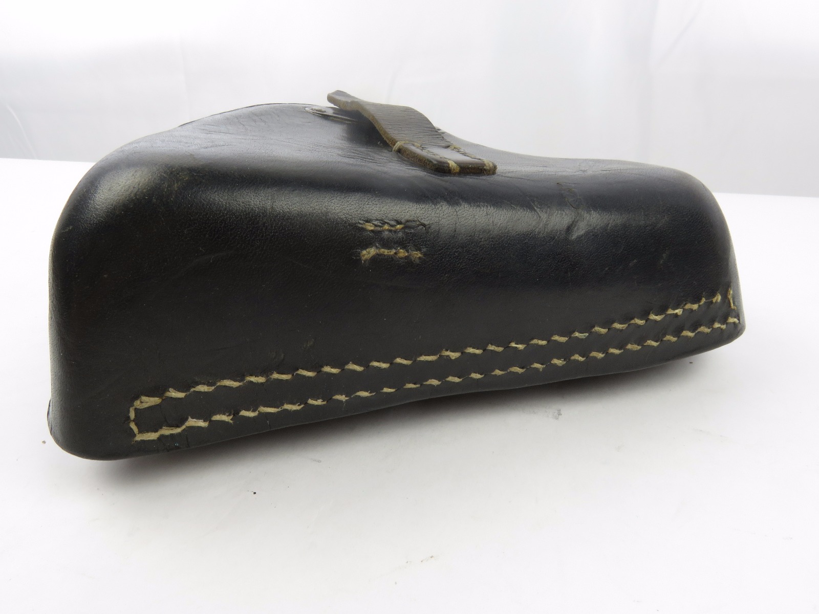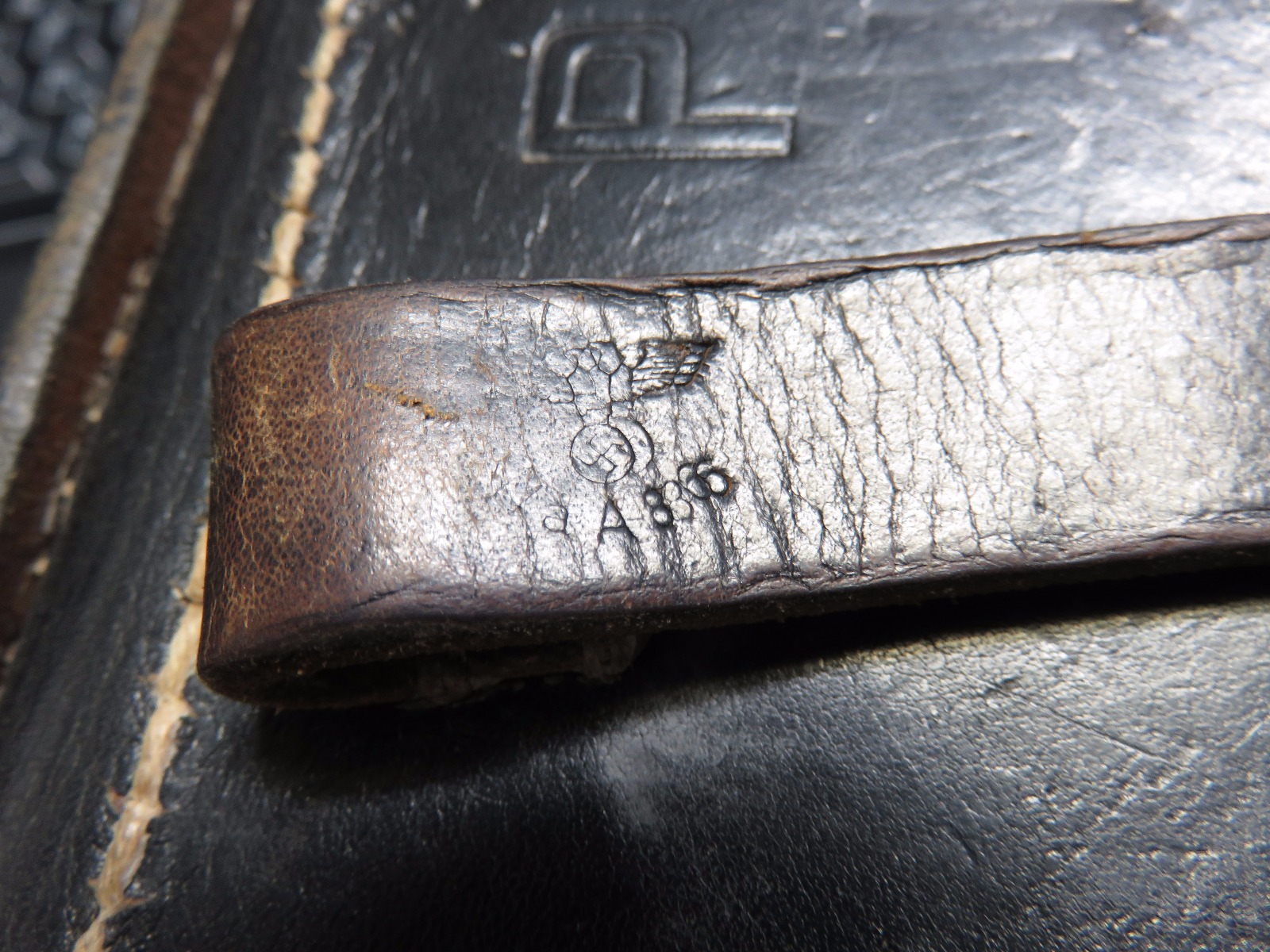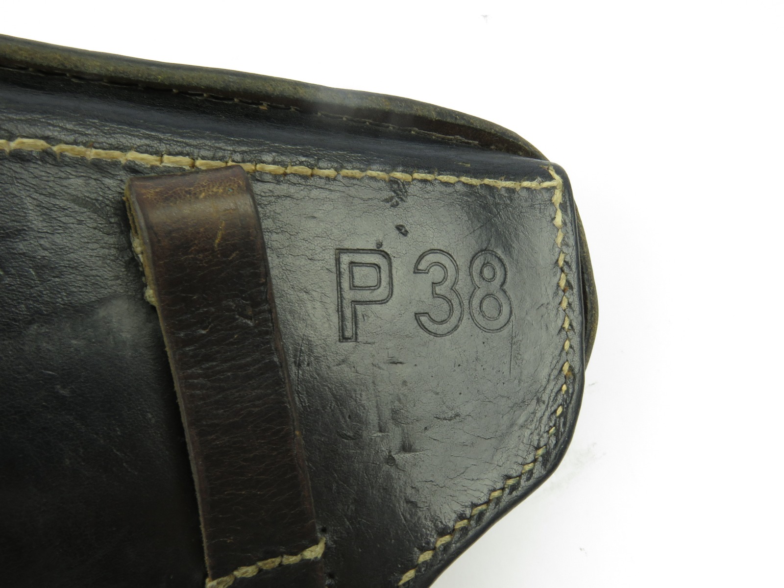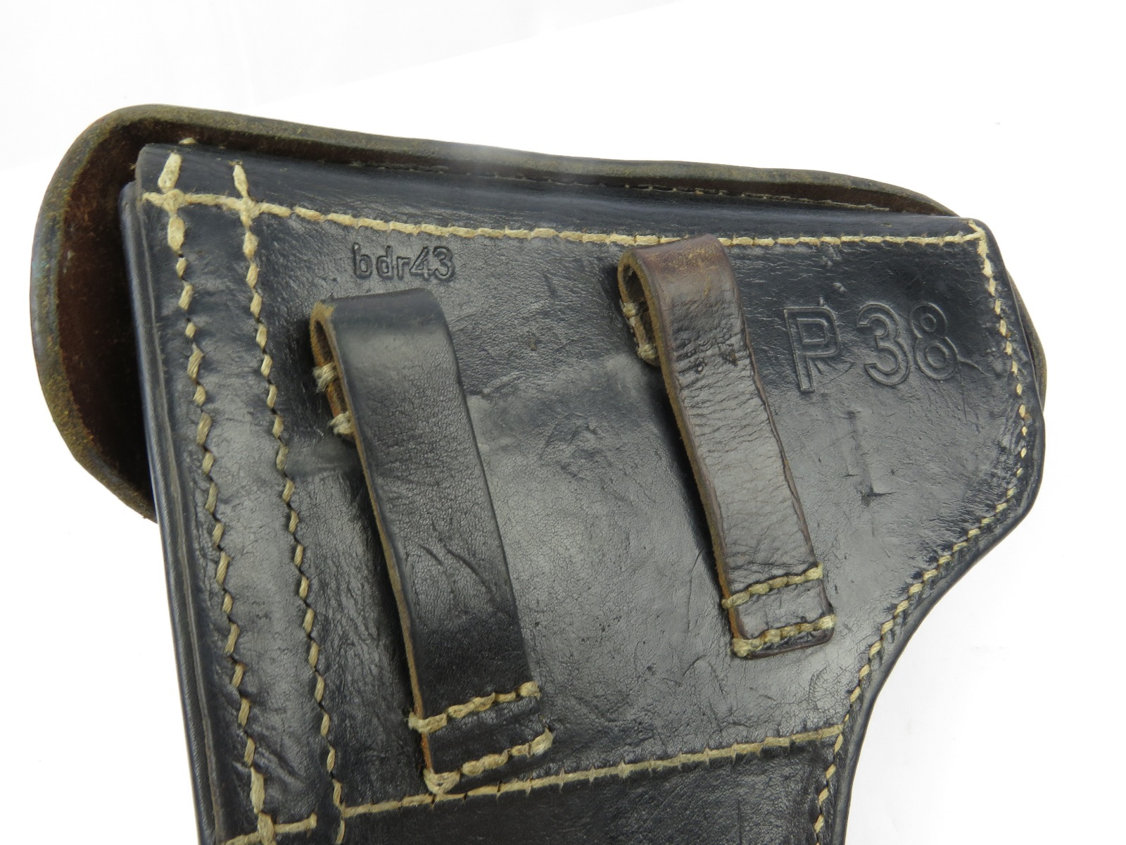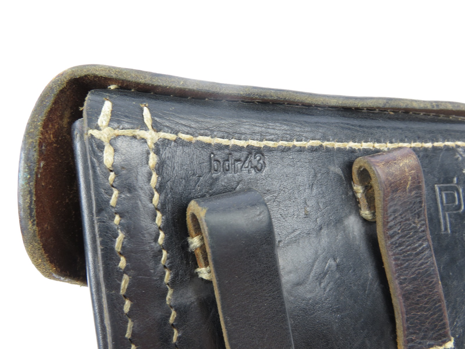 8/7/17 – This is an original 1943 dated P.38 holster. The holster is in excellent condition with strong leather and stitching. This holster is somewhat unique due to the placement of the waffen stamp on the back leather. Most of the time the stamp is on the body of leather, but this holster has the waffen proof on the belt loop. The waffen is a double stamp as well – further adding to the peculiararity of this holster. The holster is also P.38 stamped and “bdr 43” stamped. Very clean interior leather and stitching. The leather holds shape nicely. Guaranteed original.