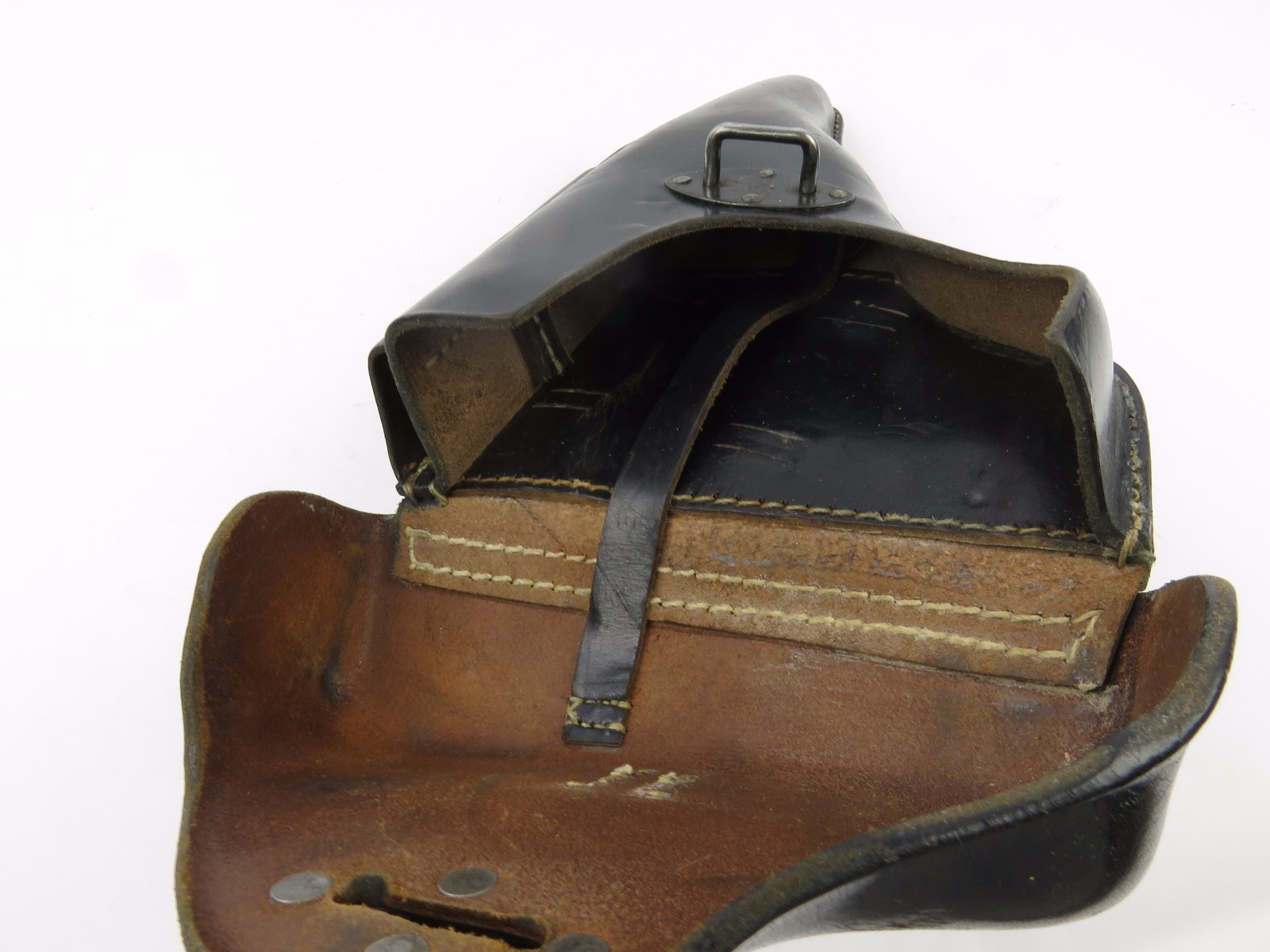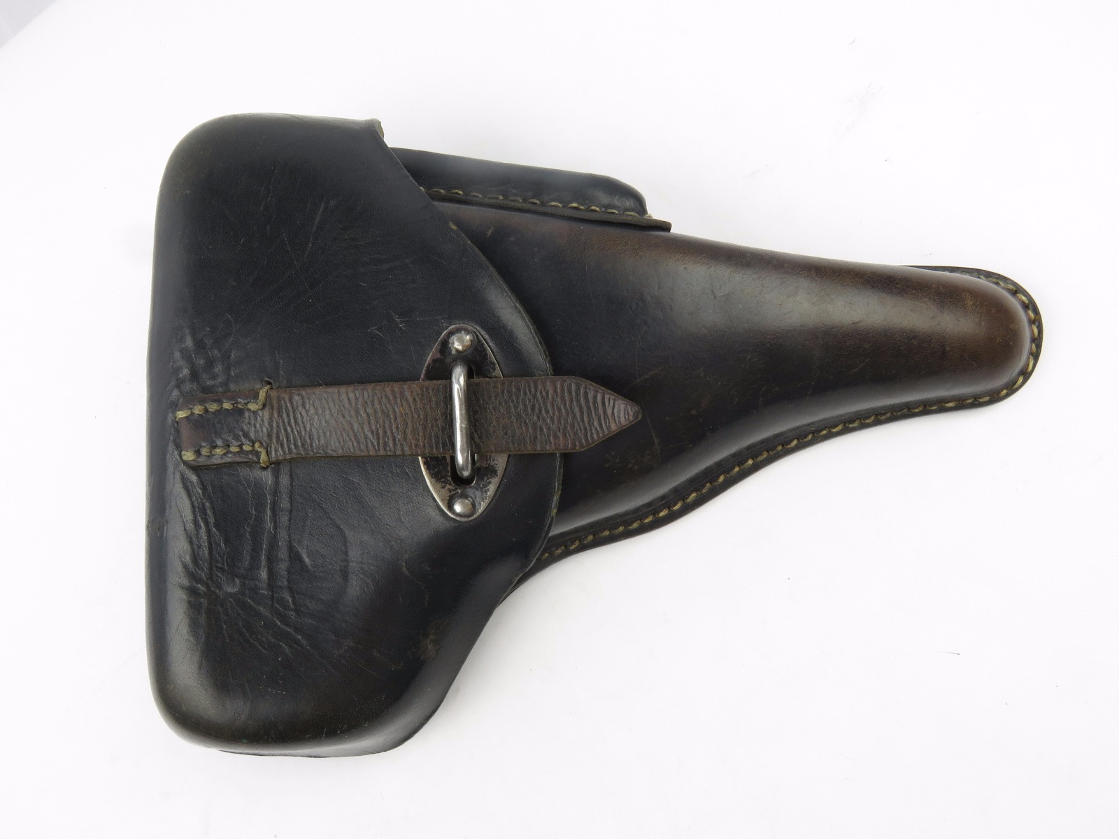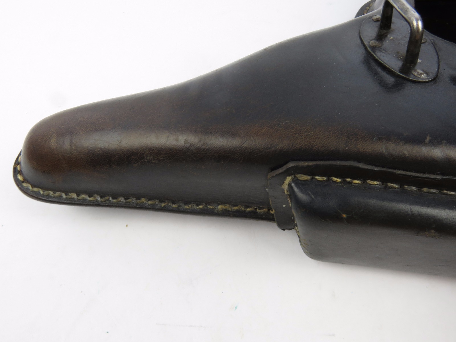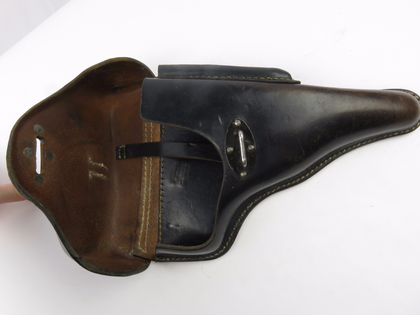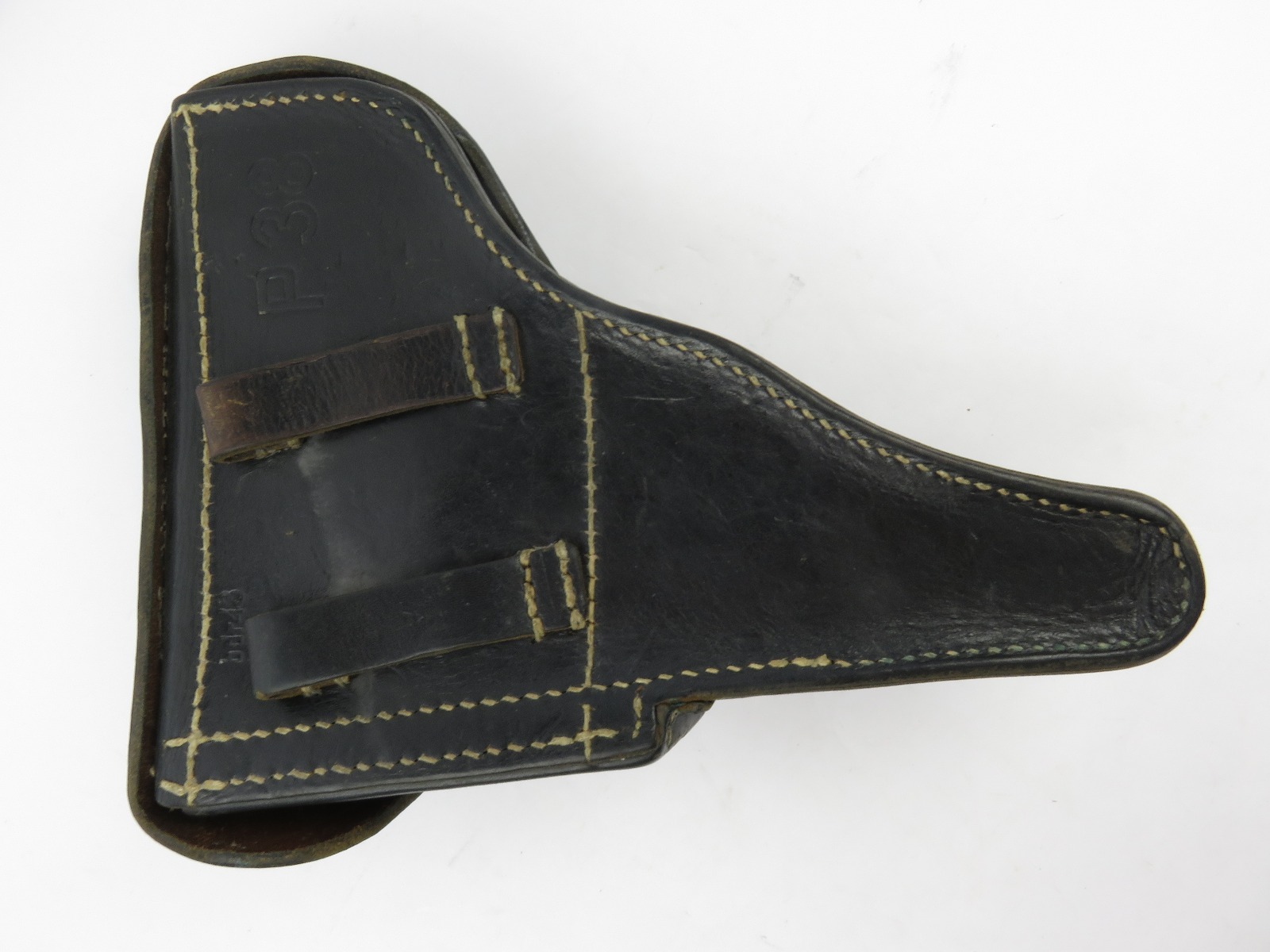 8/7/17 – This is an original 1943 dated P.38 holster. The holster is in excellent condition with strong leather and stitching. This holster is somewhat unique due to the placement of the waffen stamp on the back leather. Most of the time the stamp is on the body of leather, but this holster has the waffen proof on the belt loop. The waffen is a double stamp as well – further adding to the peculiararity of this holster. The holster is also P.38 stamped and “bdr 43” stamped. Very clean interior leather and stitching. The leather holds shape nicely. Guaranteed original.