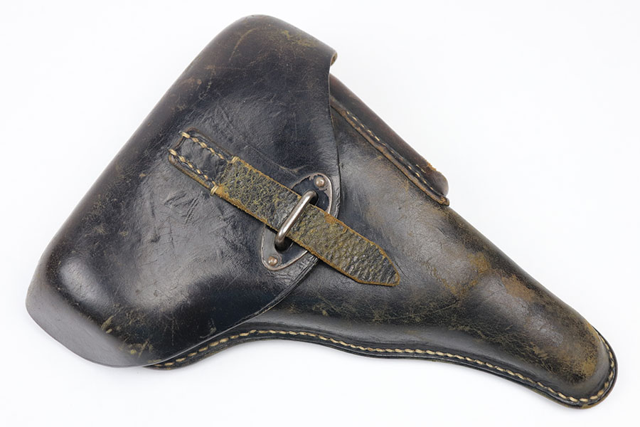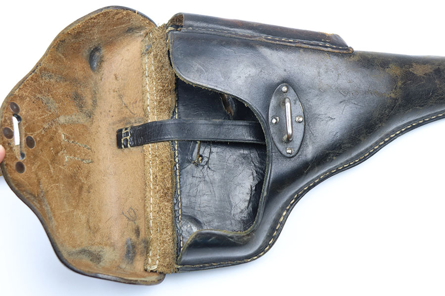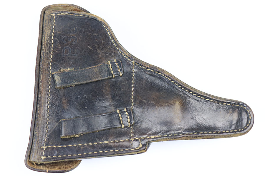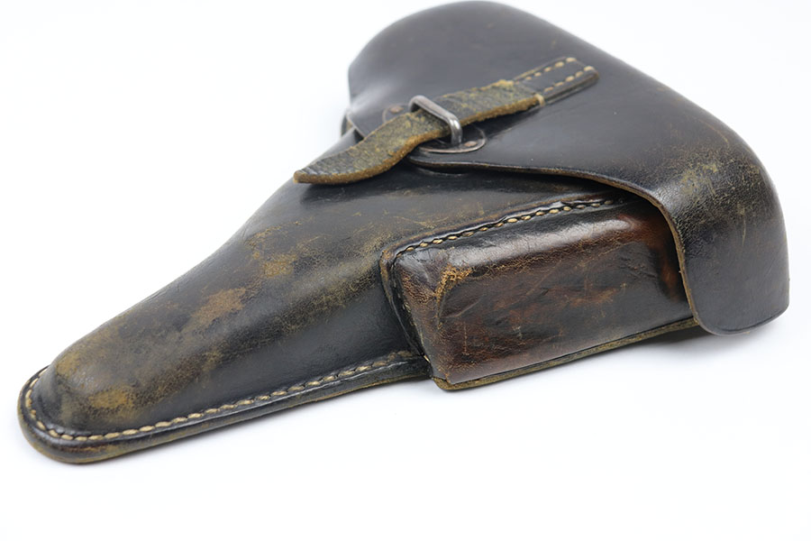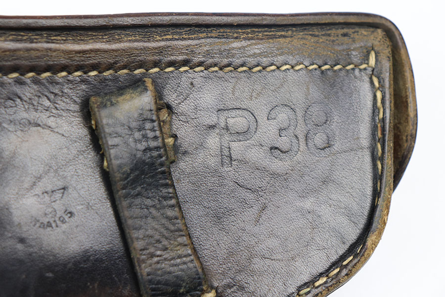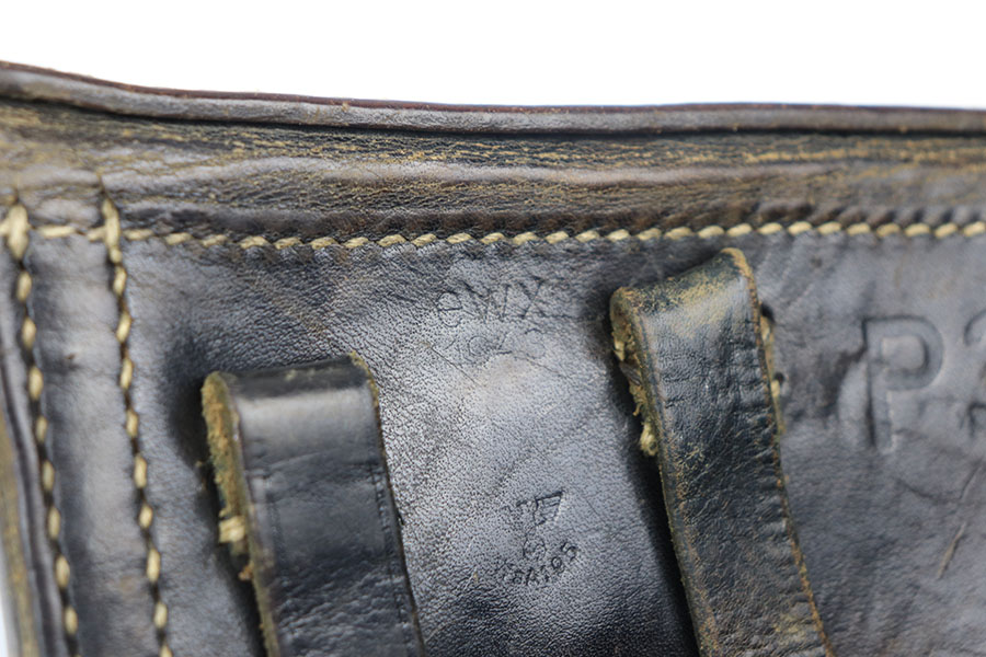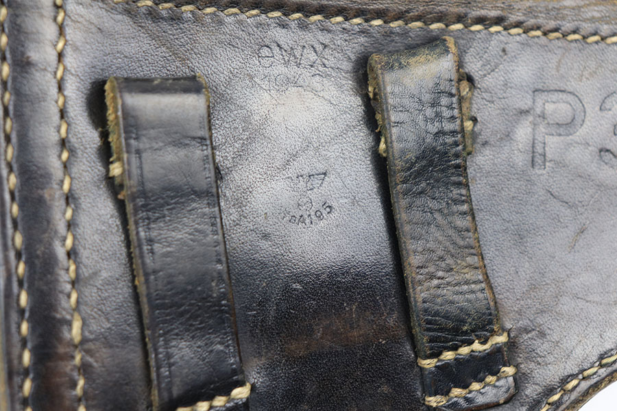 4/16/21 – This is an original 1943 dated P.38 holster. The back of the holster is dated, maker code stamped, waffen stamped, and P.38 stamped. The maker and date are fairly faint but still visible. The leather shows signs of previous use and is particularly pliable towards the toe. Some light surface scuffing throughout but no major issues. Stitching all original and intact.