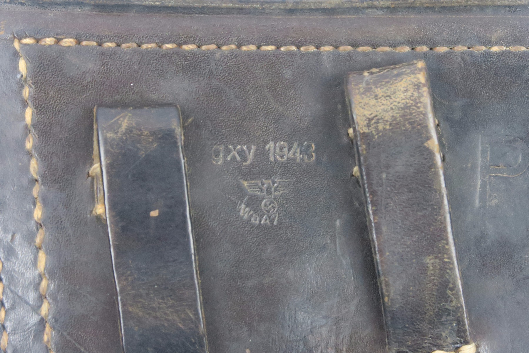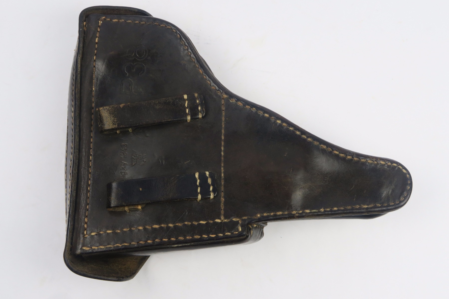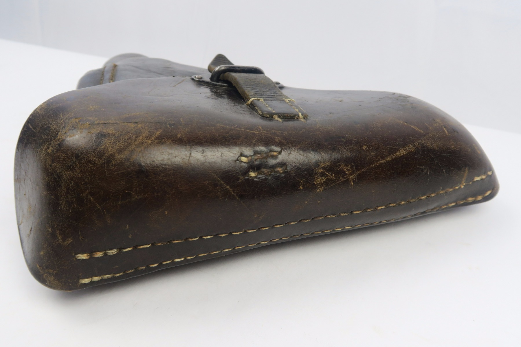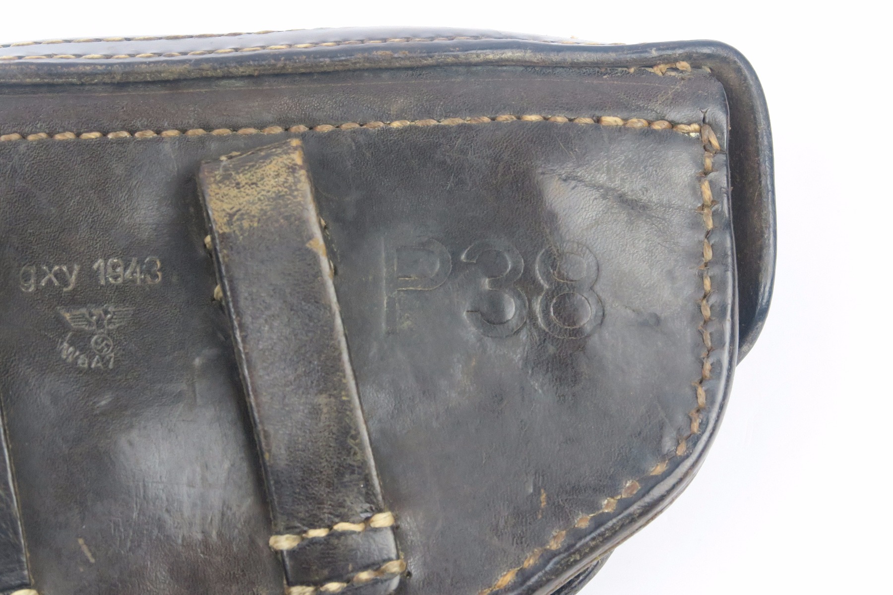 12/1/17 – This is an original 1943 dated P.38 holster from WW2. The holster has nice leather that’s completely in tact but there is some surface scuffing and some indented scratch marks on the front leather/lid. The back leather is in great shape and has strong maker stamp, date stamp, and waffen WaA7__. The end of the waffen number is very faint. The stitching is all correct and in tact. Guaranteed original.