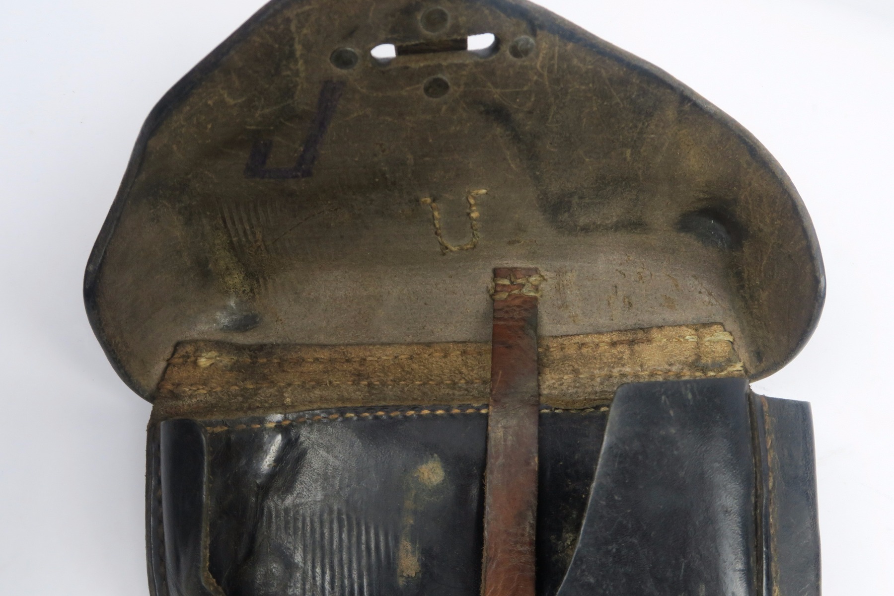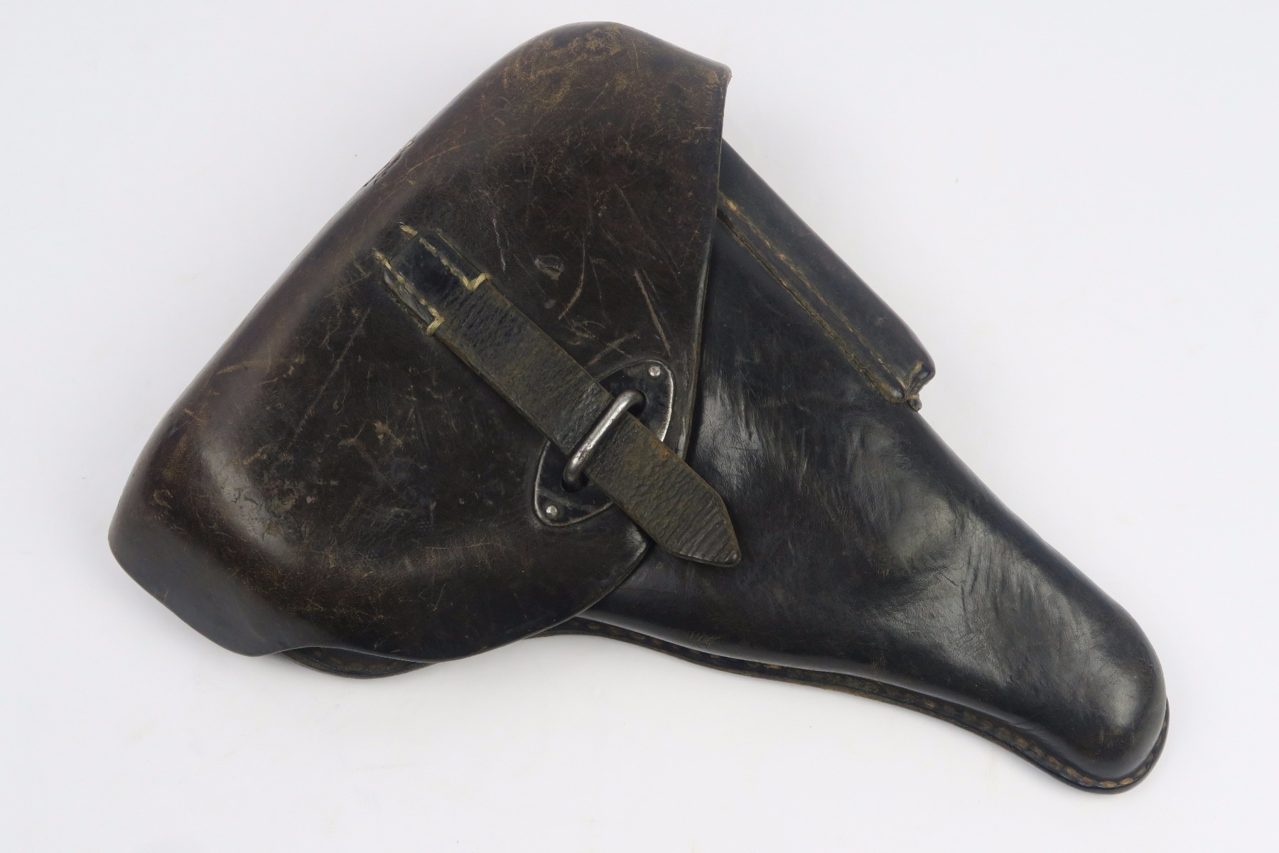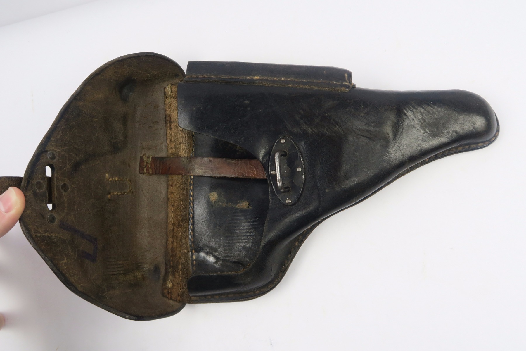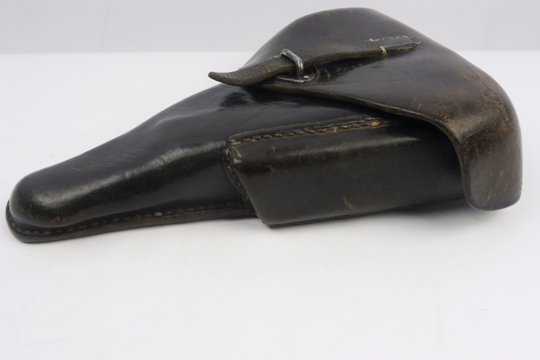 12/1/17 – This is an original 1943 dated P.38 holster from WW2. The holster has nice leather that’s completely in tact but there is some surface scuffing and some indented scratch marks on the front leather/lid. The back leather is in great shape and has strong maker stamp, date stamp, and waffen WaA7__. The end of the waffen number is very faint. The stitching is all correct and in tact. Guaranteed original.