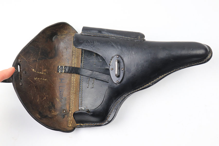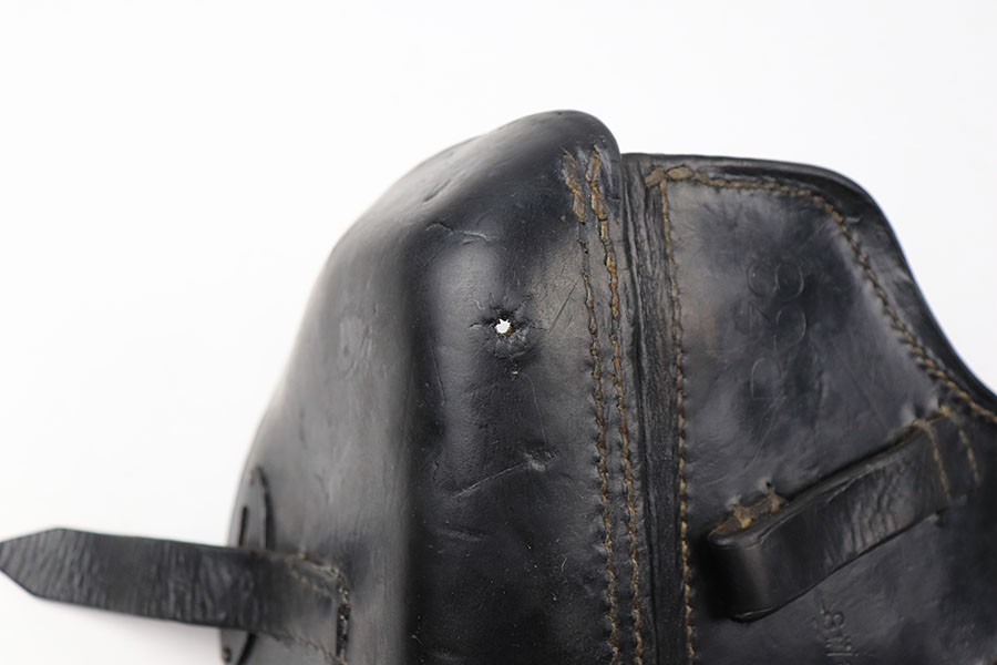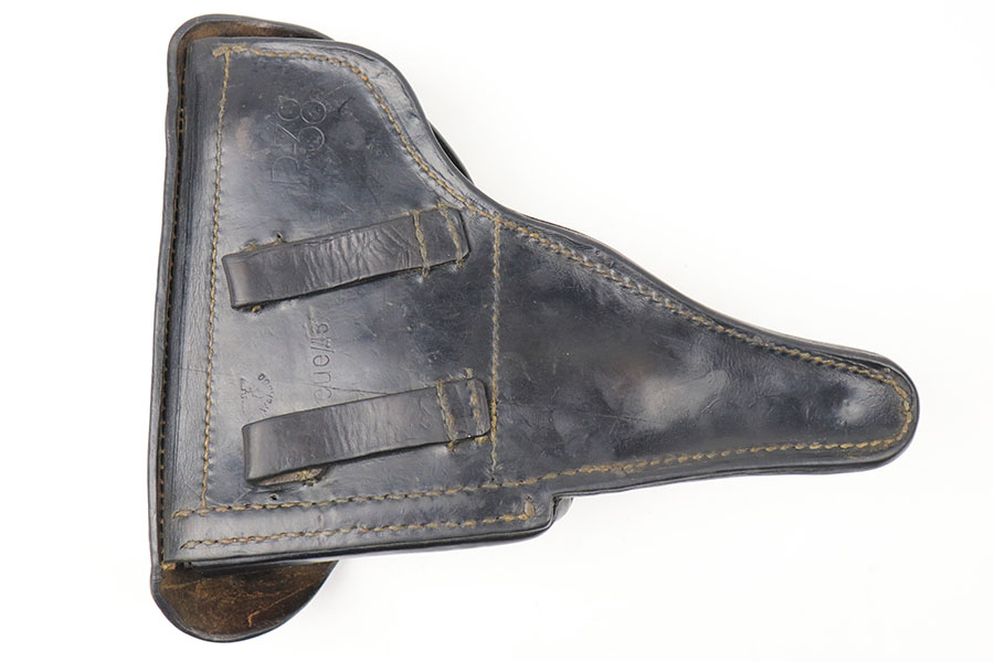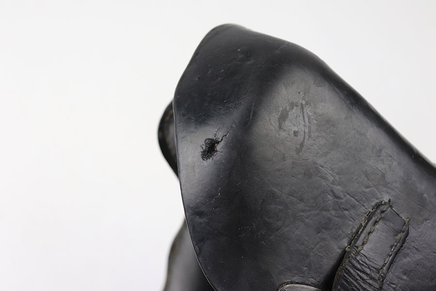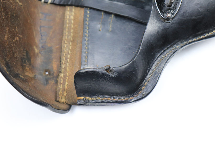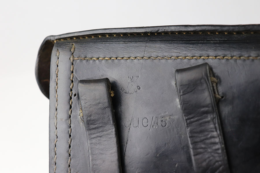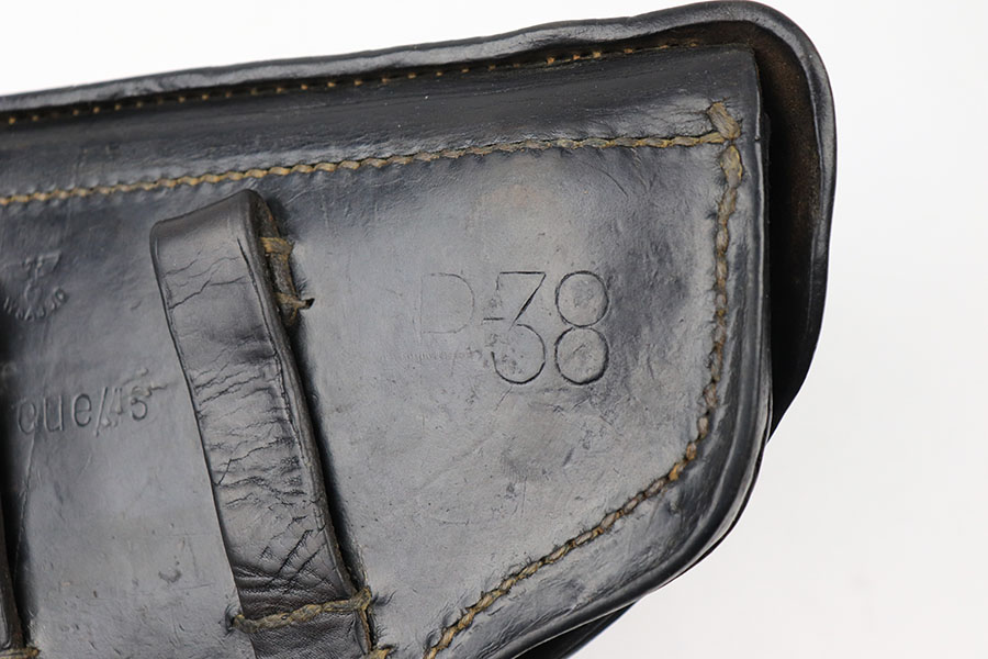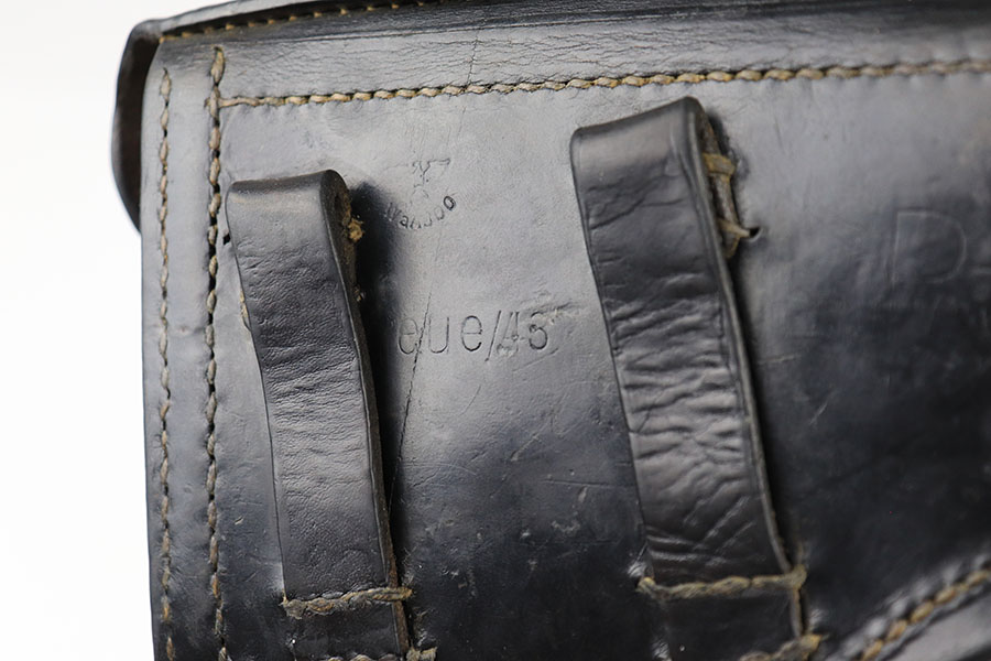 7/29/21 – This is a 1943 dated P.38 holster from WW2. The holster is dated, maker stamped, waffen stamped, and P.38 stamped on the back leather. The leather is in good condition with normal pliability. The exterior leather has likely been treated with a preservative. The stitching is all in tact and original, except for the lift strap which we believe has been replaced. Interestingly, the holster has a small “bullet hole” damage in a few small areas – see photos.