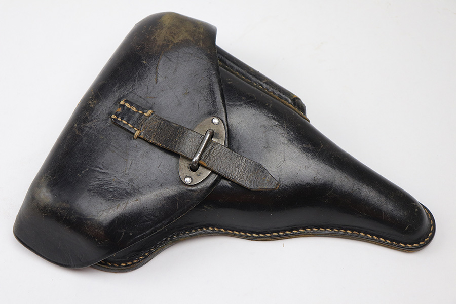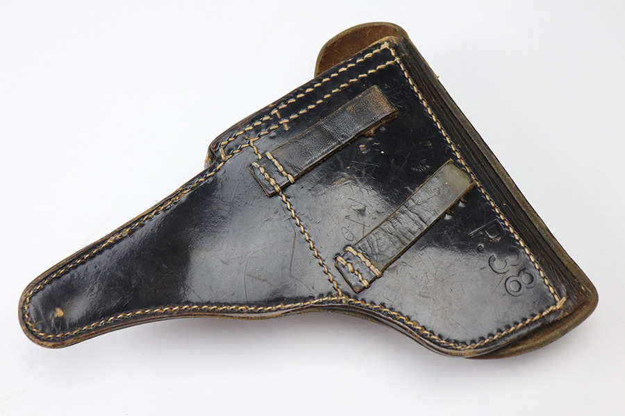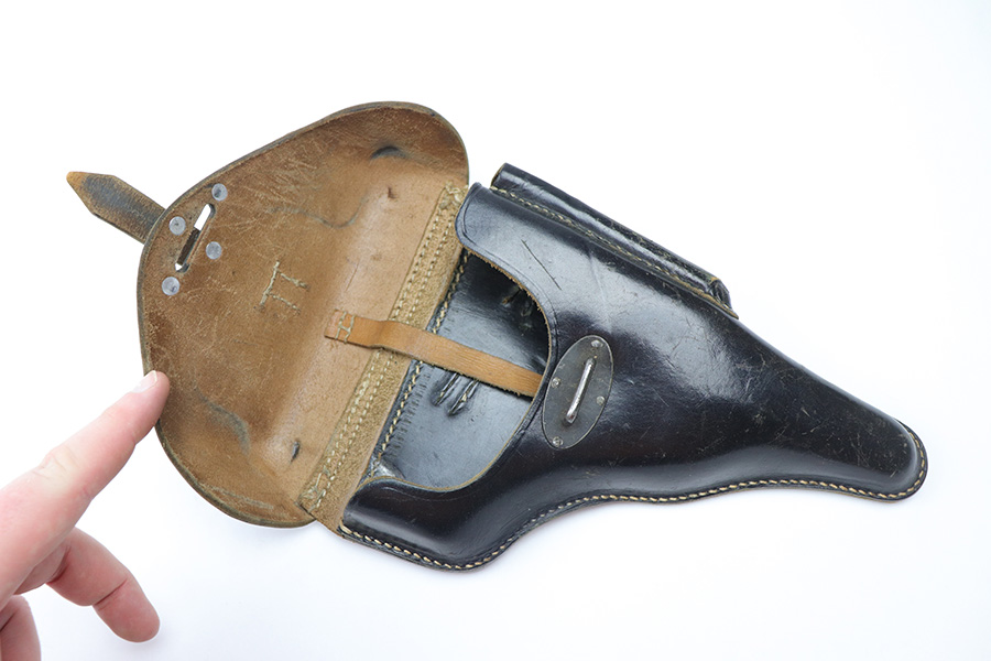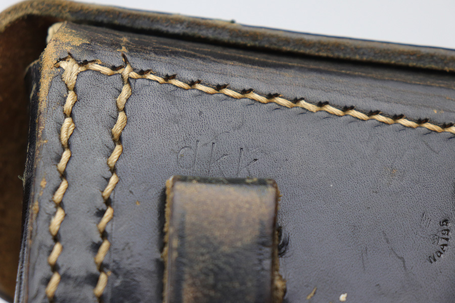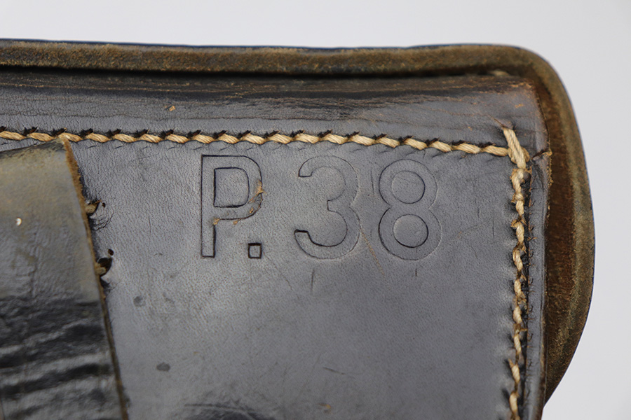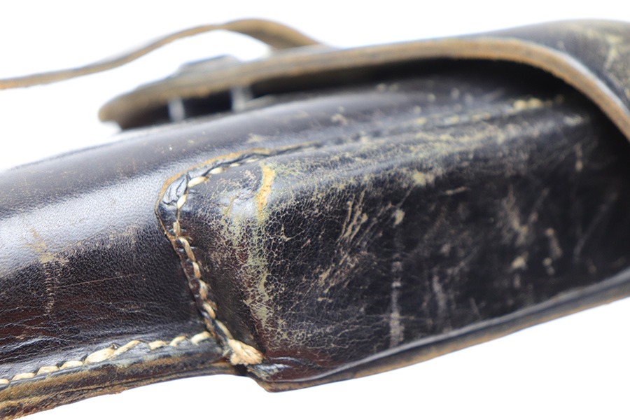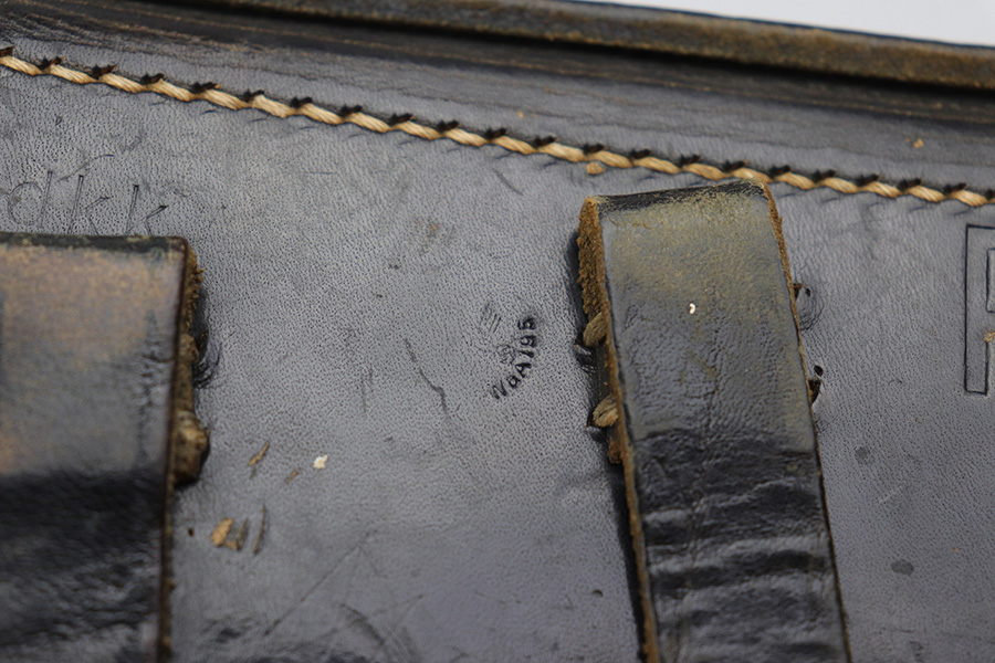 10/21/21 – This is a hardshell style P.38 holster from WW2. The back leather is maker stamped, dated, waffen proofed, and P.38 stamped. The leather is fairly firm with mild pliability. There’s some minor surface scuffing and typical aging on the exterior leather. The interior leather is clean and the stitching is all in tact and excellent.