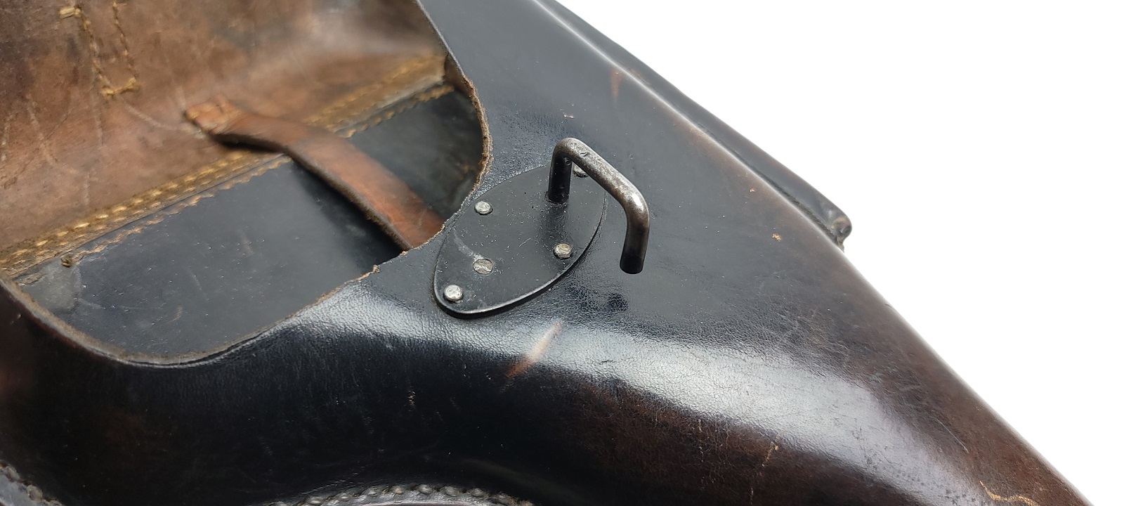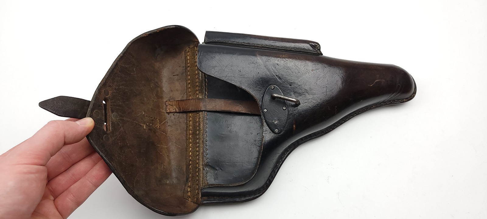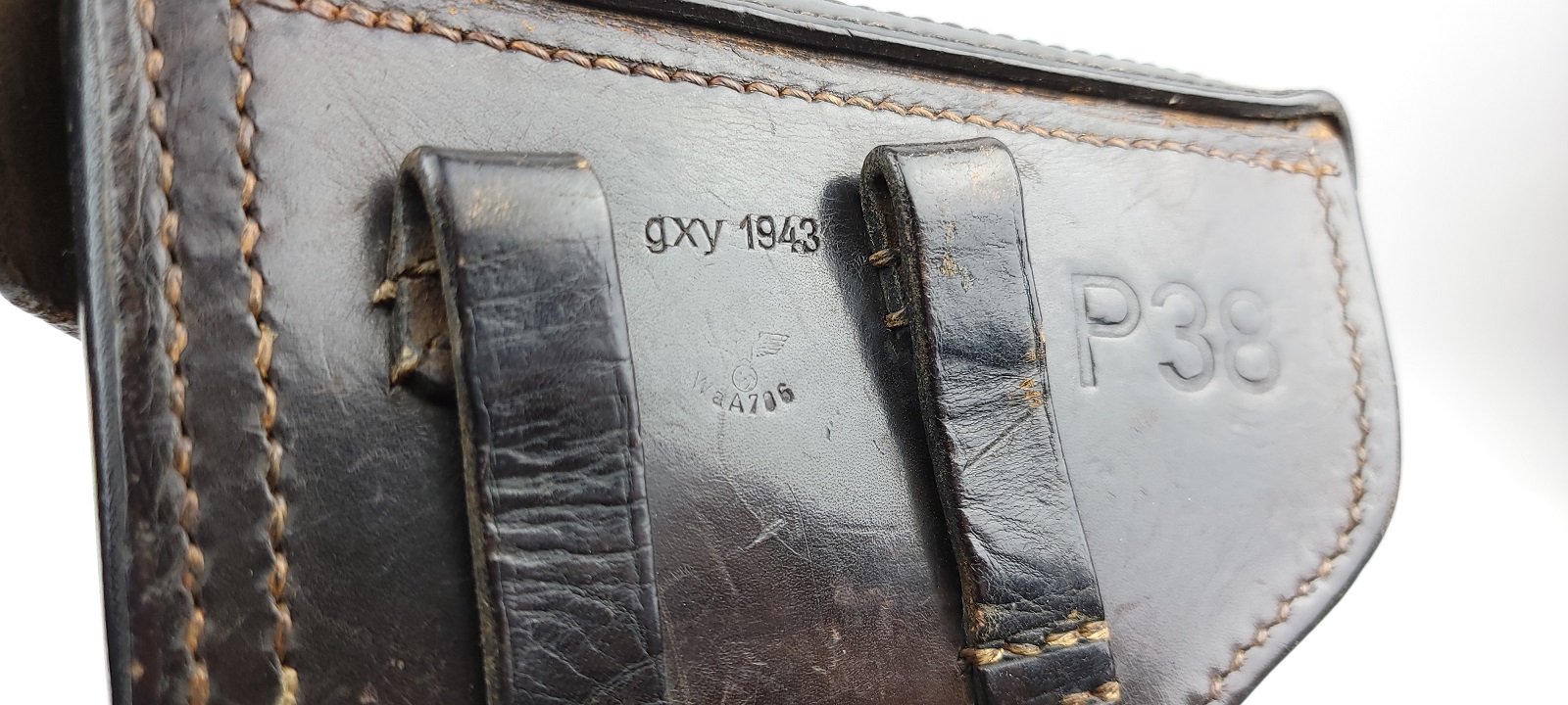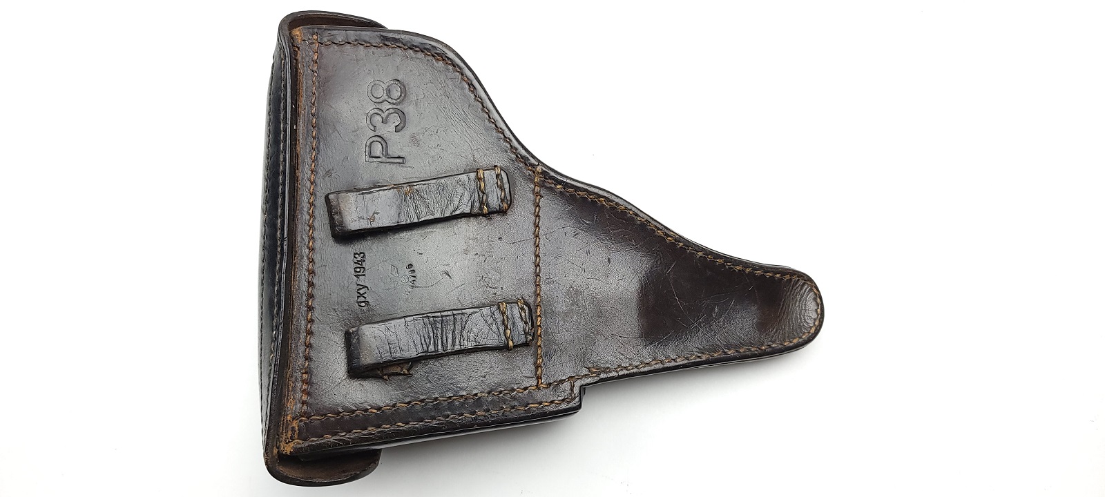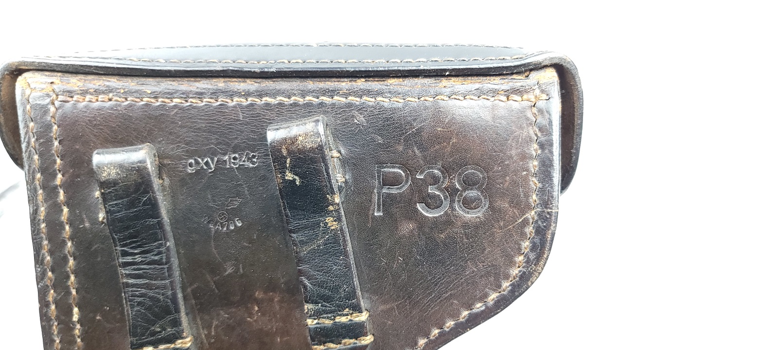 3/8/22 – This is an original 1943 dated P.38 holster from WW2. The holster is in great condition, except for the metal closure ring on the front of the holster. The ring is detached at one point – see photos. This doesn’t affect functionality of the holster however, and the price is reduced accordingly. The leather is clean and in great overall condition with some mild surface wear. No stitching issues. Maker stamped, dated, and waffen proofed on the back leather as shown.
