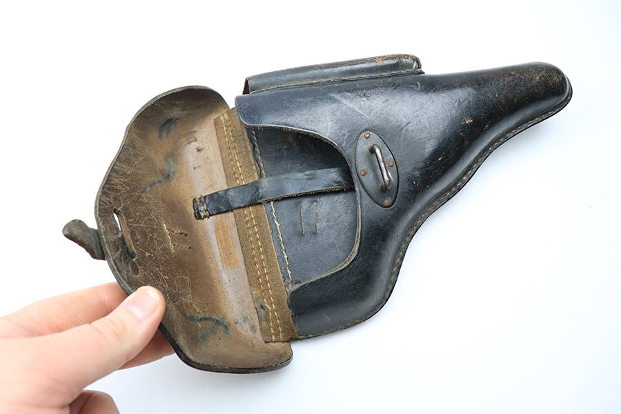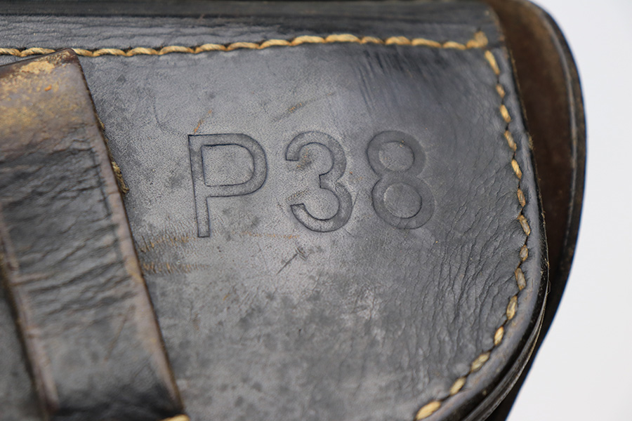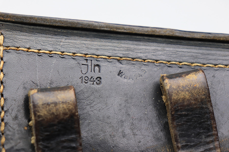 4/11/22 – This is an original 1943 dated hard shell style P.38 holster from WW2. The holster is maker stamped, dated, P.38 stamped, and waffen proof stamped on the back leather. The leather is firm with mild pliability. There is some edge scuffing and mild wrinkling on the magazine pouch and front leather. No notable stitching flaws. The reinforced metal around the fastening hole on the lid has a mild bend or dent, but this is negligible wear.