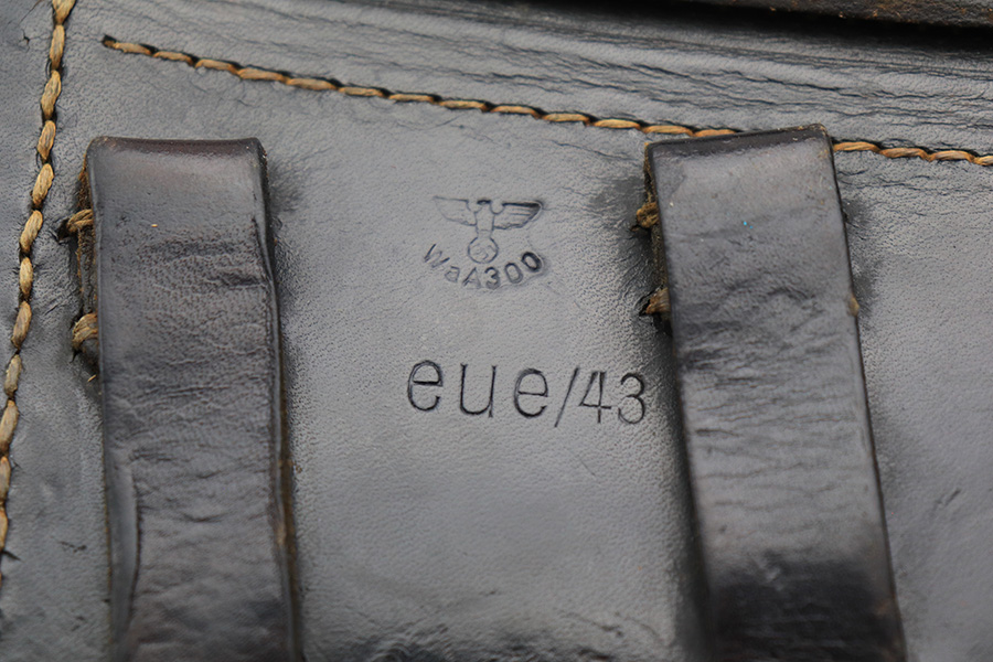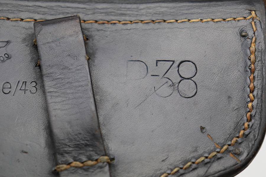 5/12/22 – This is an original 1943 dated P.38 holster from WW2. The holster is maker stamped, dated, waffen proofed, and P.38 stamped on the back leather. The leather has mild pliability and is in great overall condition. The interior leather has some writing inside, as shown. No stitching issues. A very nice, straightforward example.