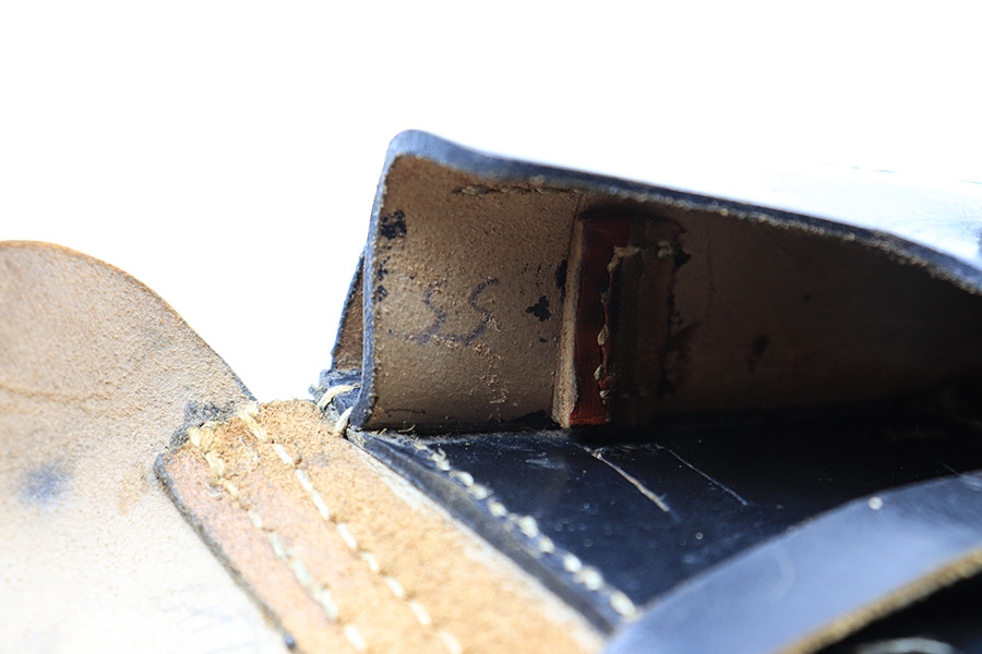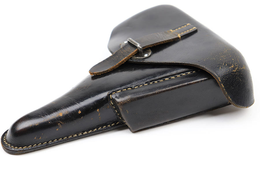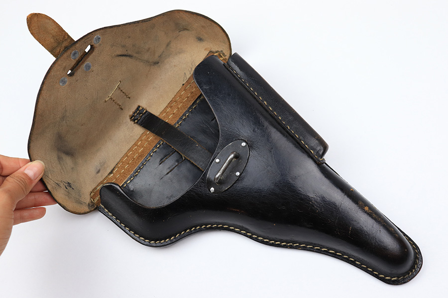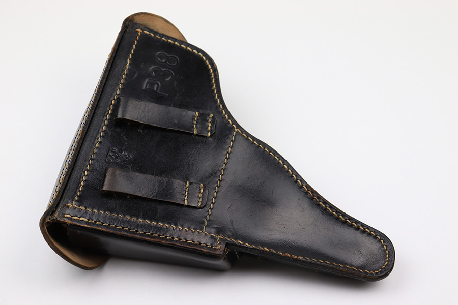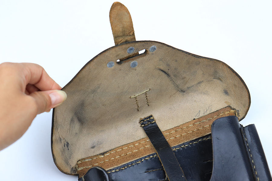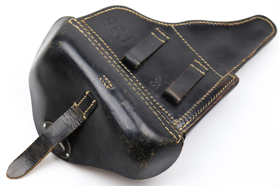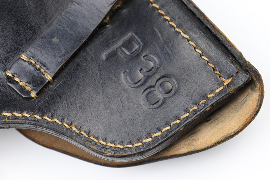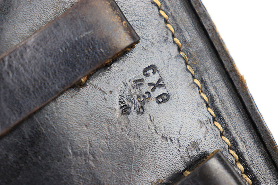 7/7/22 – This is an excellent example of a 1943 hard shell P.38 holster from WW2. The holster has black leather and straw colored stitching. The leather exterior has some surface wrinkling around the toe of leather, closure strap, and top leather. Very clean interior leather and back leather. The back leather is maker stamped, dated, waffen proofed, and P.38 stamped. Excellent stitching throughout.