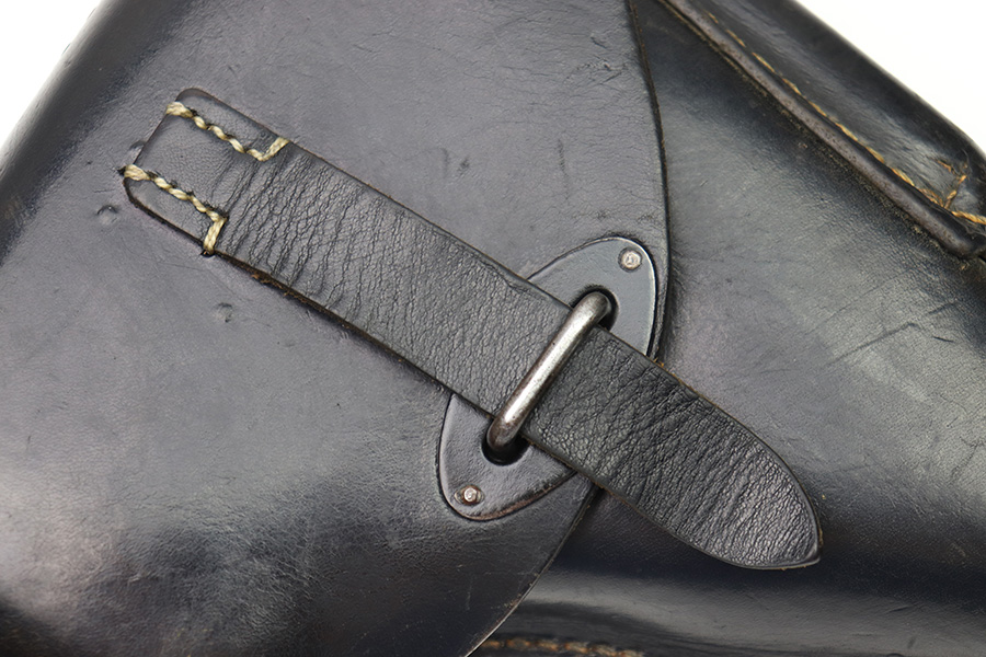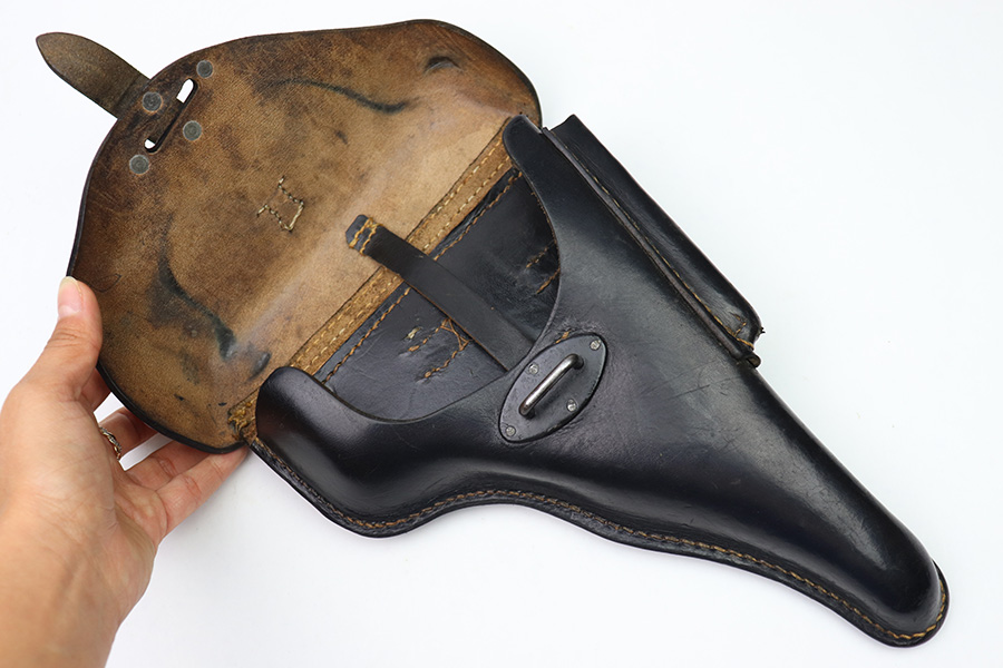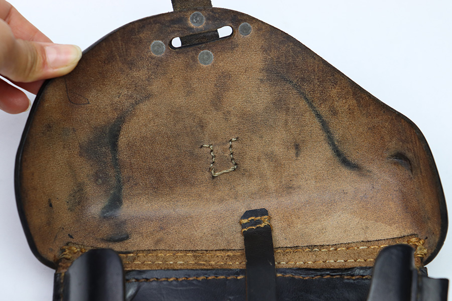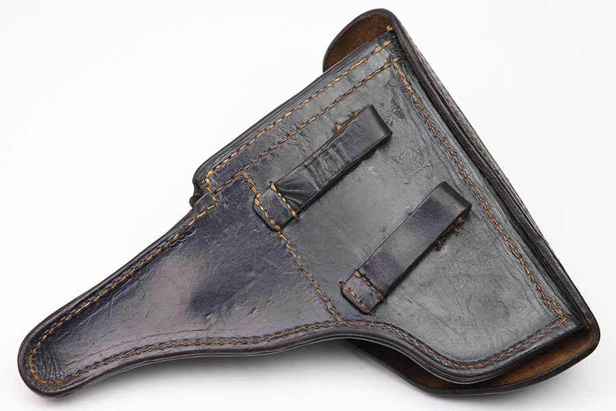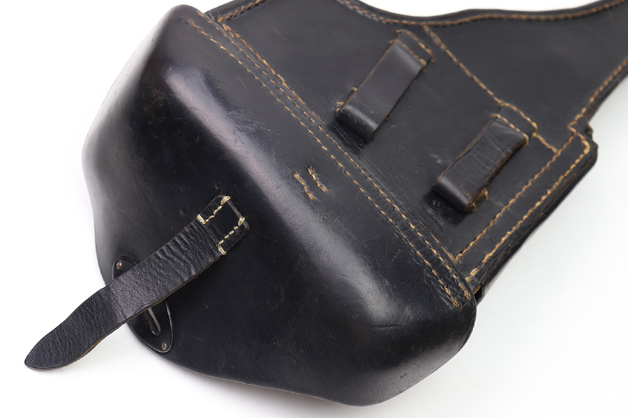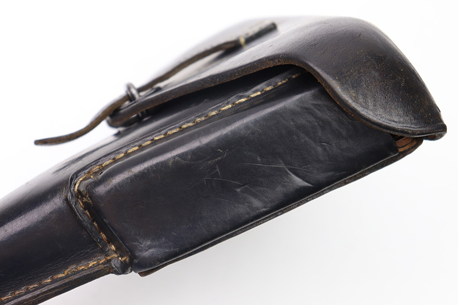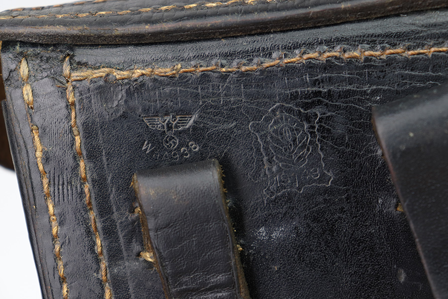 10/13/22 – This is an original 1943 dated P.38 hardshell style pistol holster. The holster is maker stamped with a “bearskin oakleaf 9” maker logo and 1943 date. The back leather is also waffen proof stamped and has a faint P.38 stamp. The leather is strong with mild pliability and a fairly clean exterior and interior. The stitching has no notable issues and is tight throughout. A very nice wartime example.