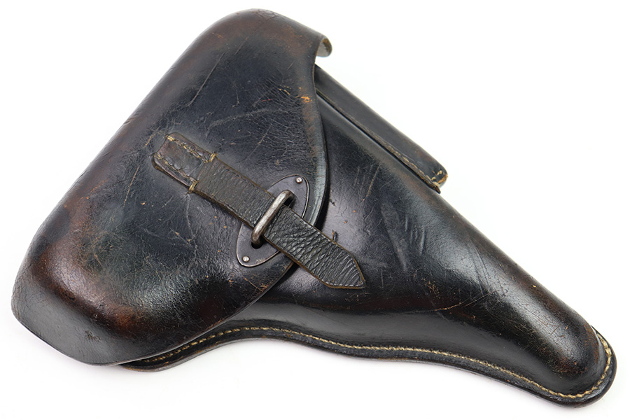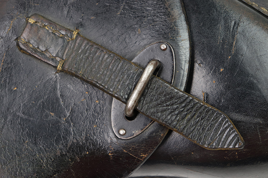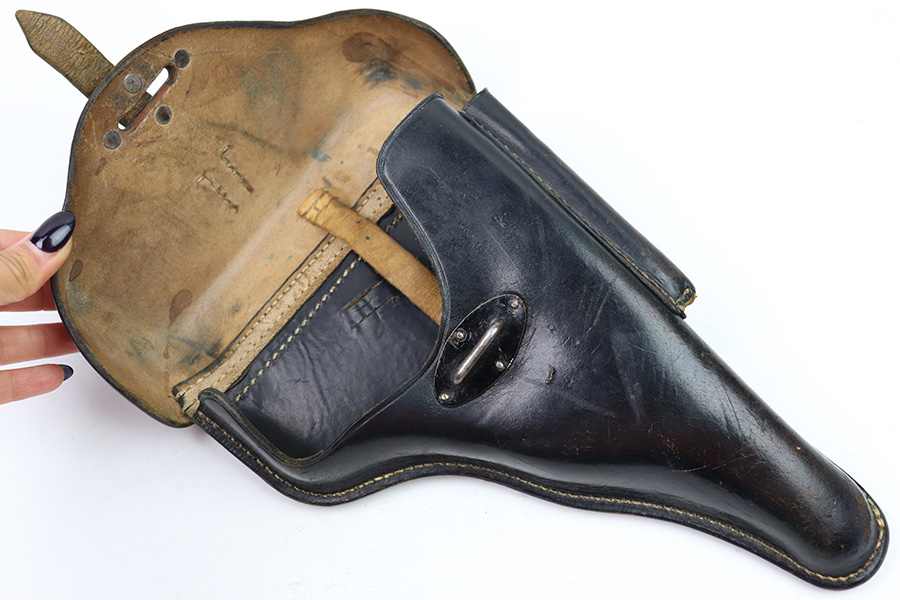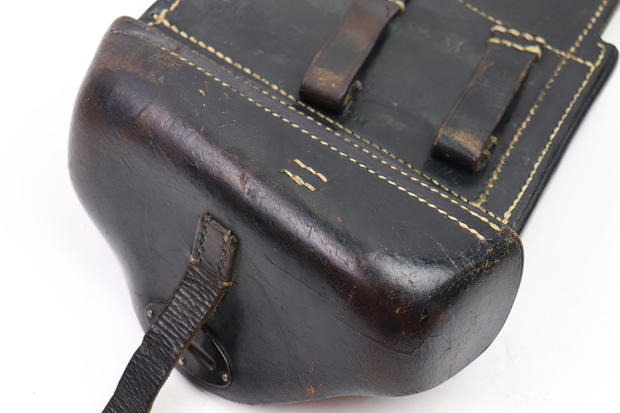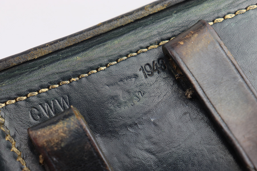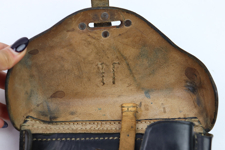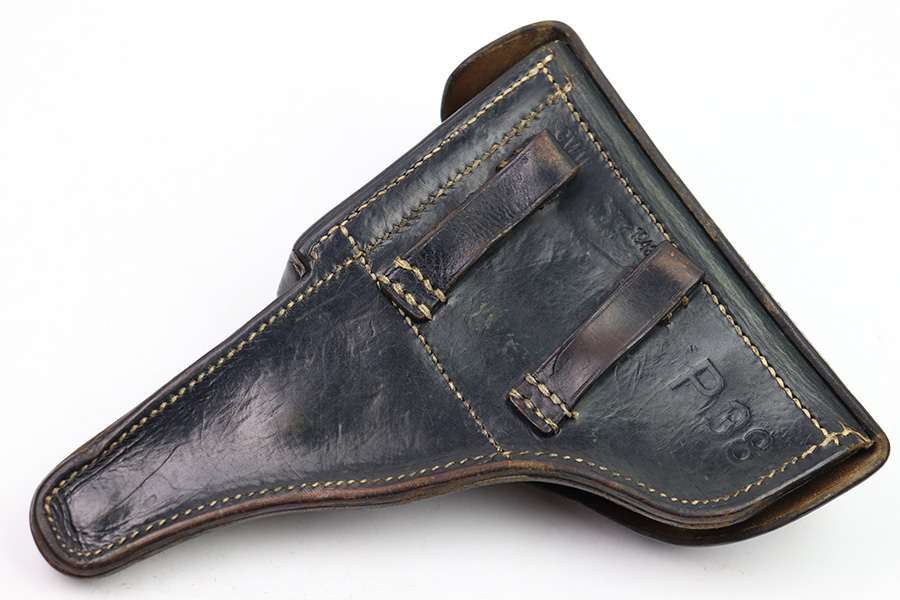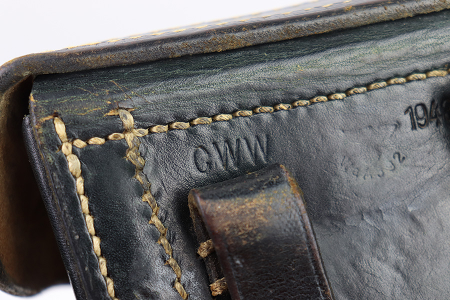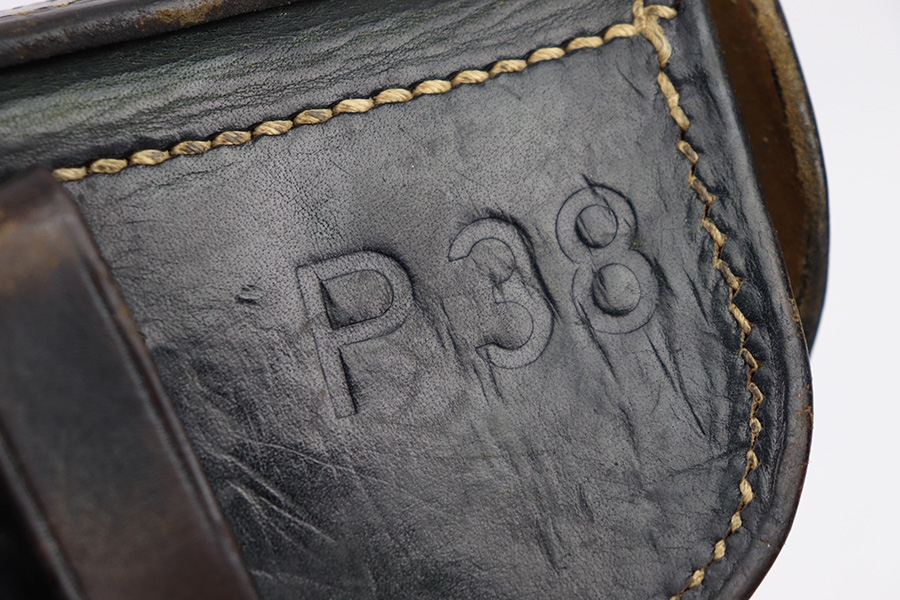 11/8/22 – This is an original 1943 hard shell style P.38 holster from WW2. The holster is stamped with a maker code, waffen proof, date, and P.38 on the back leather. The waffen eagle is somewhat faint, but all the markings are otherwise crisp and visible. The exterior leather has some mild surface scratches and wrinkling, as well as mild color thinning near the edges and toe. The interior leather is very clean and overall the leather has mild pliability. No stitching issues.