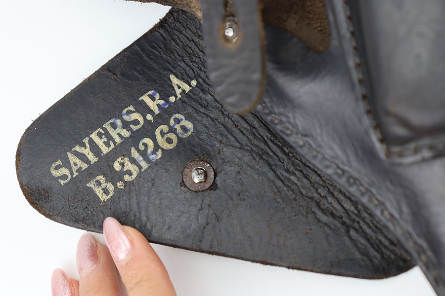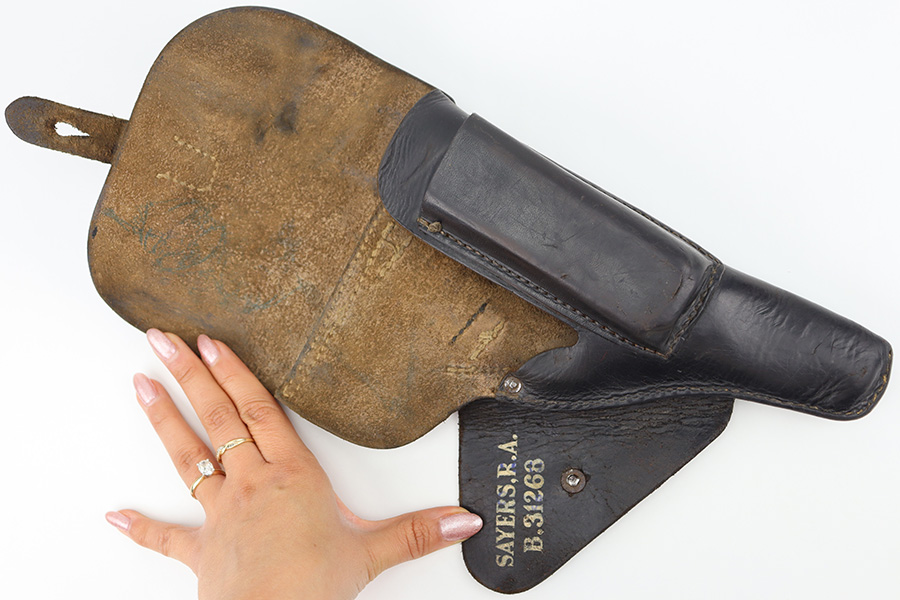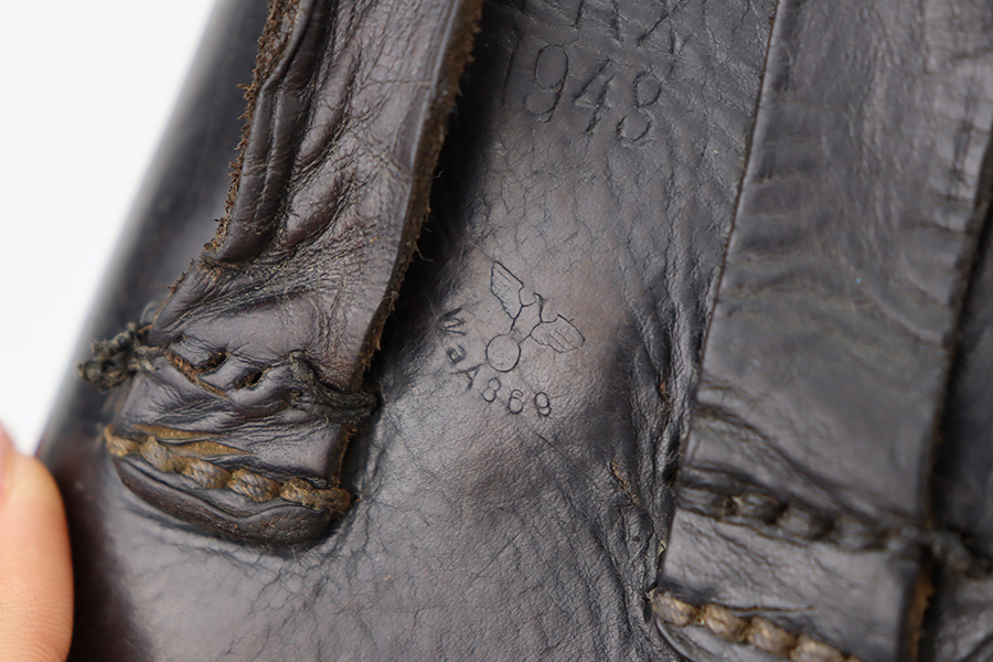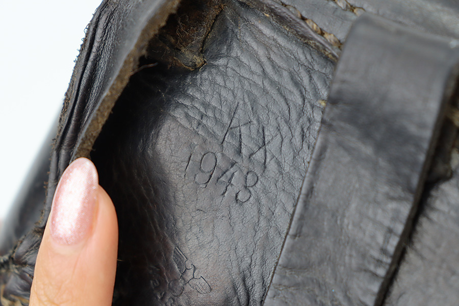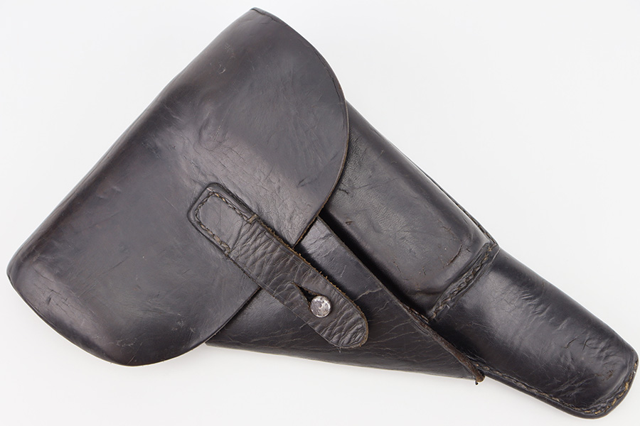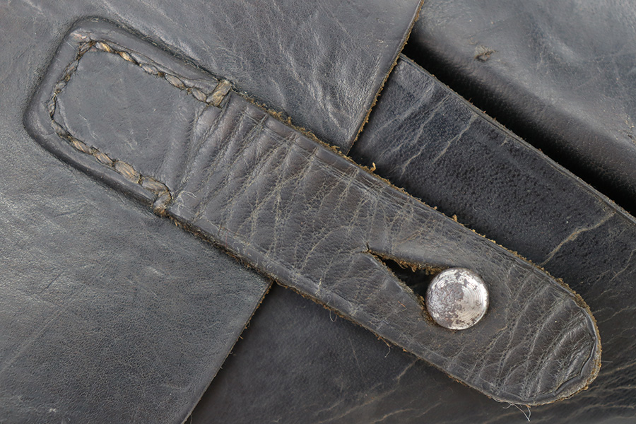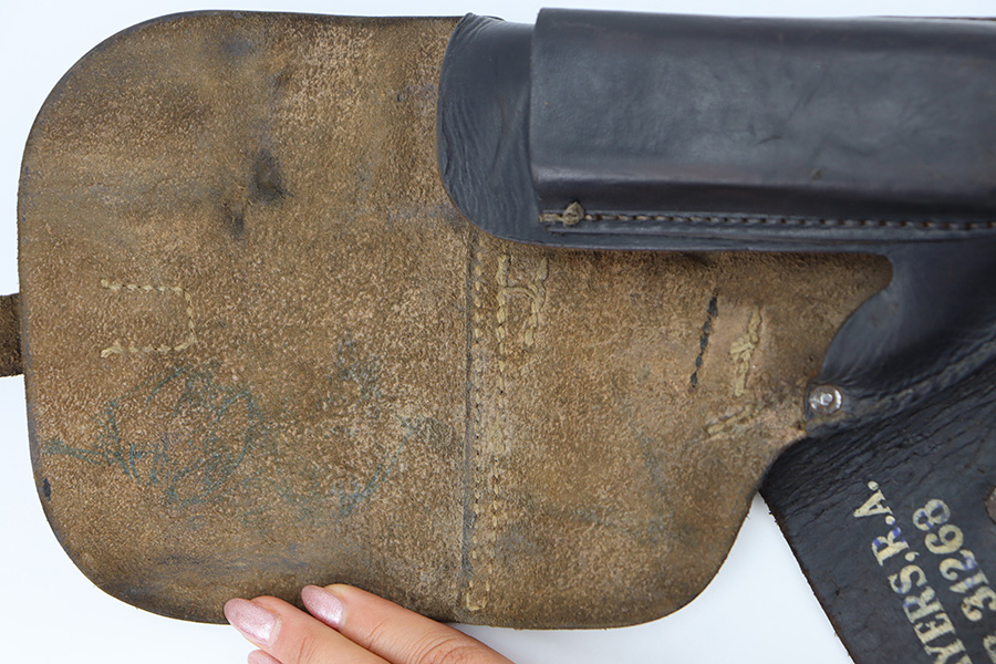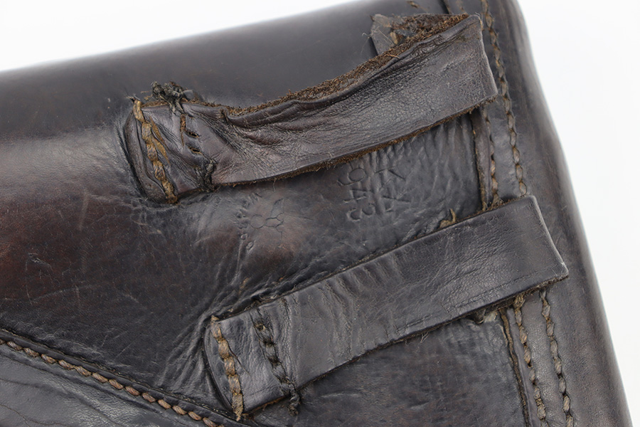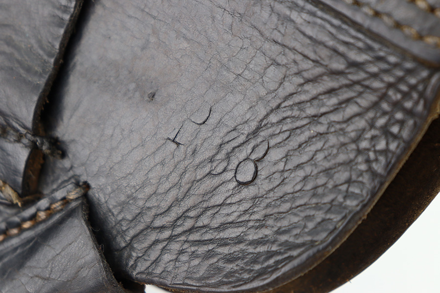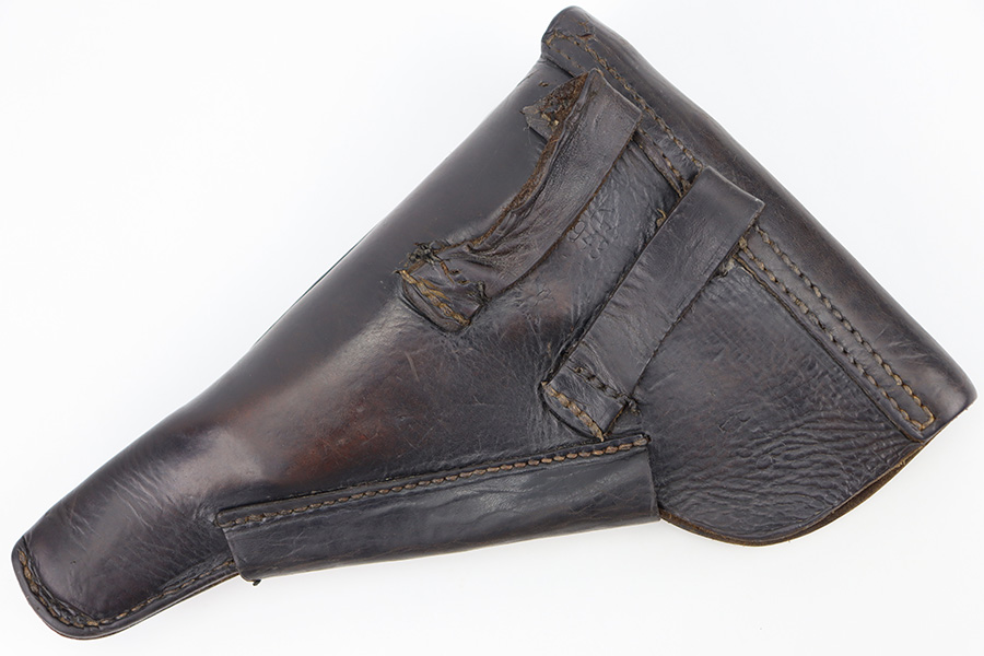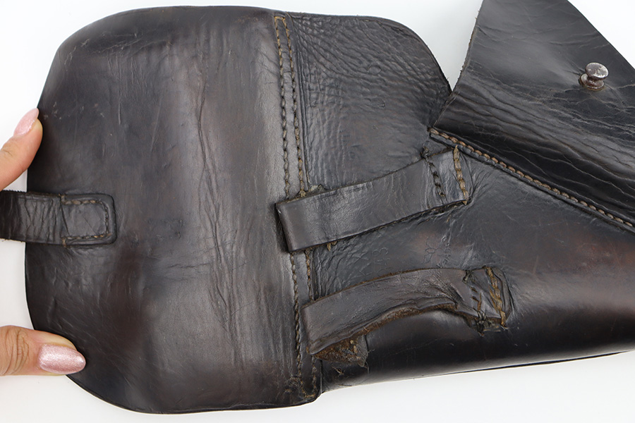 12/27/23 – This is an original 1943 production P.38 holster. The holster is in good condition with some re-stitching on the belt loops. The rest of the stitching is original, however. The leather is soft and pliable with normal use wear. The back leather is maker, date, model, and waffen proof stamped. These markings are somewhat faint but still visible. The side flap interior leather has a unit marking of some kind as well.