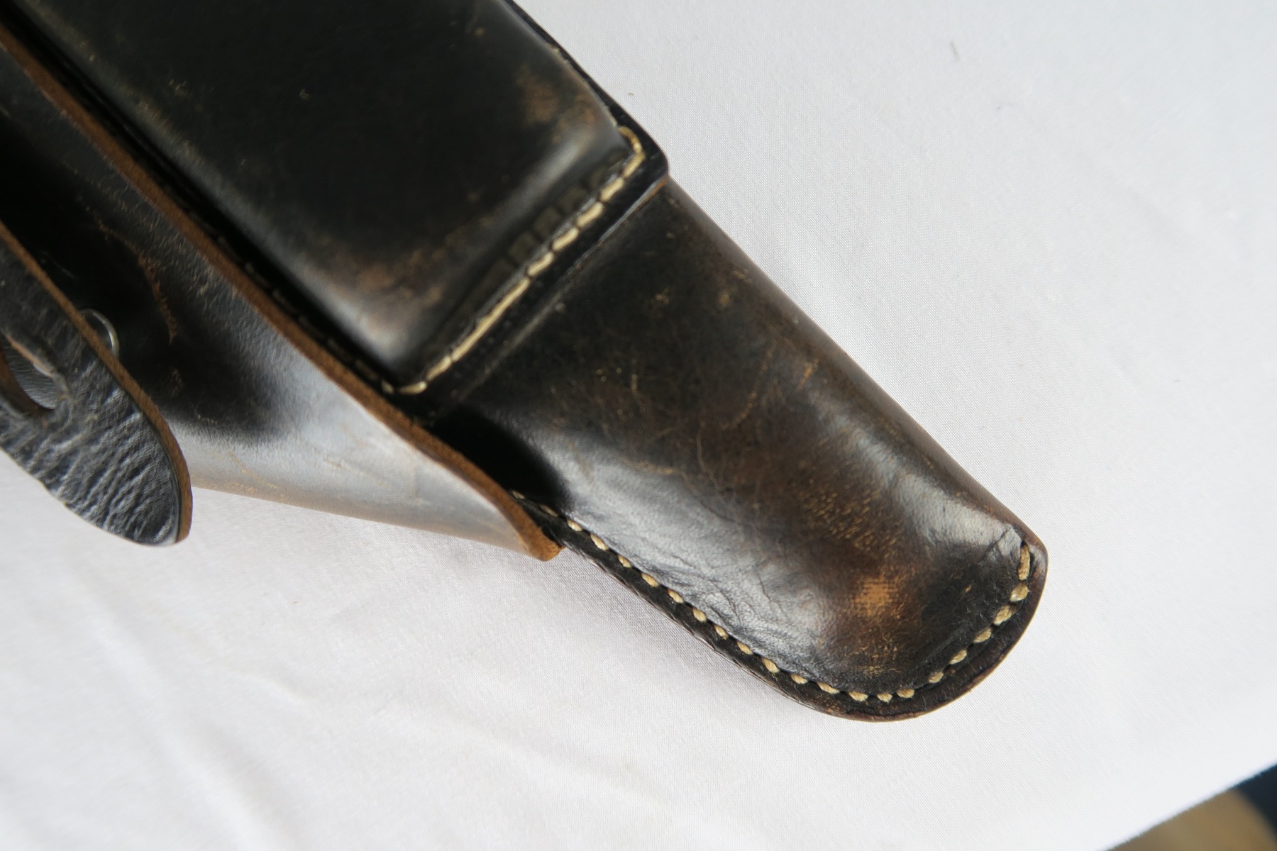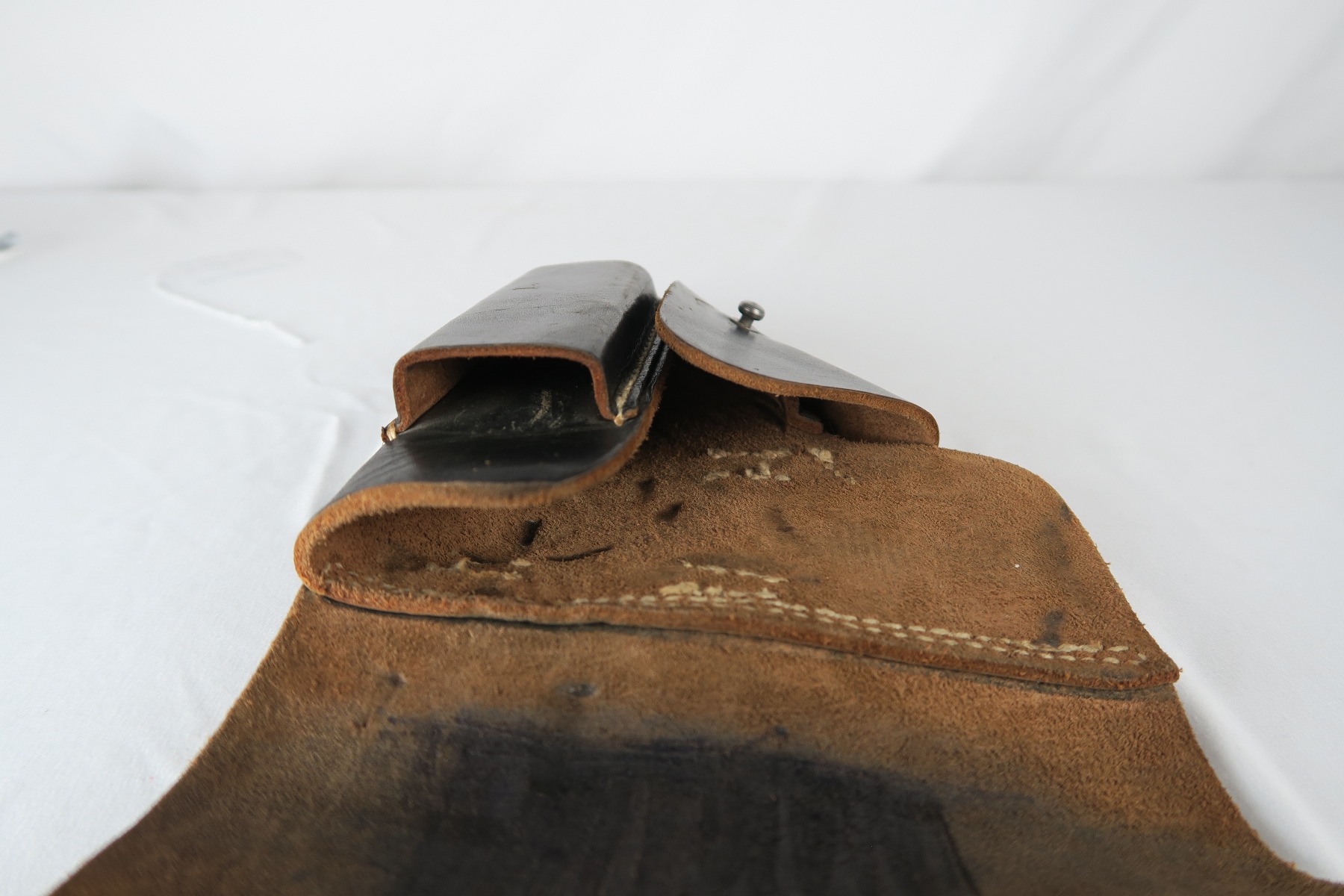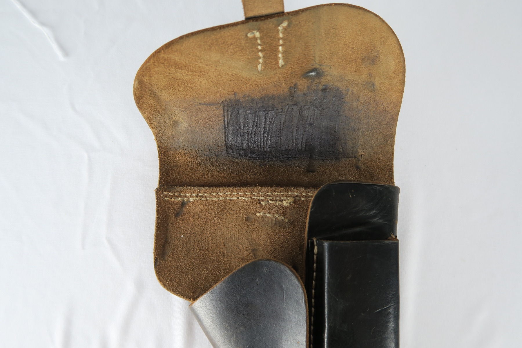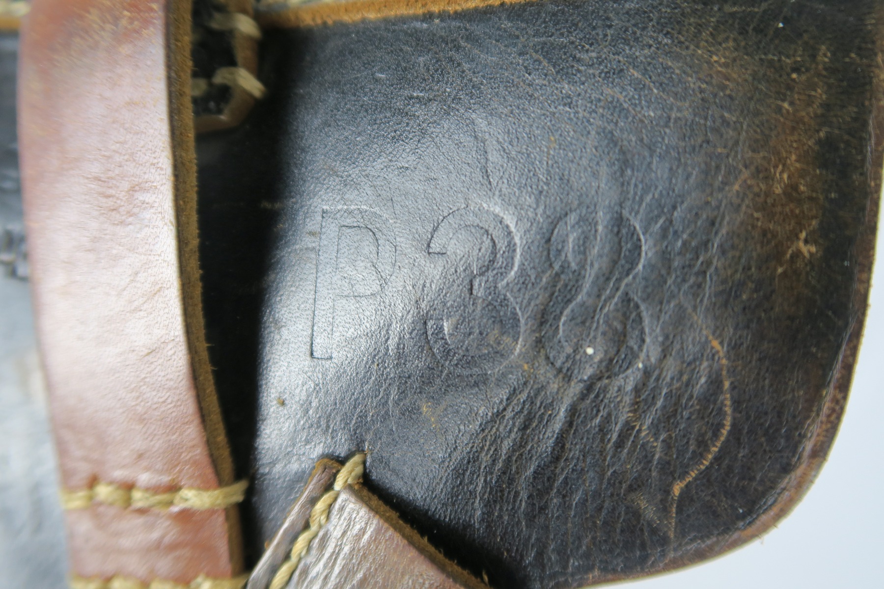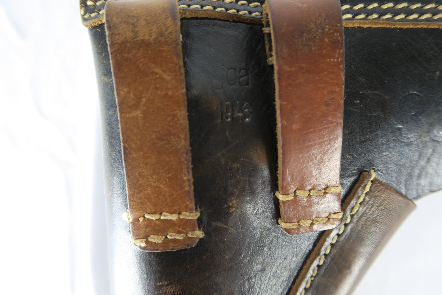 4/18/18 – This is an original WW2 wartime production softshell style P.38 holster. The holster is stamped on the back “joa” 1943 and waffen eagle proof stamped. There’s also a faint P.38 stamp on the back leather. The leather has surface wrinkling, especially on the top leather. The leather overall is soft and pliable with honest wear. The interior leather has a large black scratchy area where someone probably wrote a name and then someone else later removed / covered over the name. There are no other issues. The stitching is all tight and original.