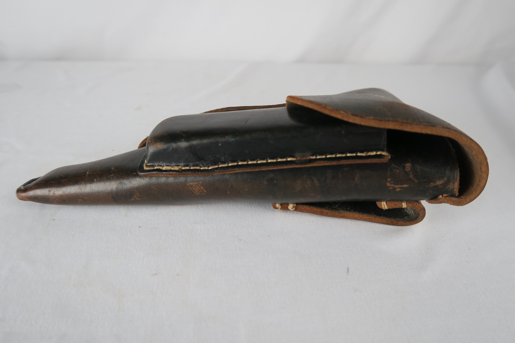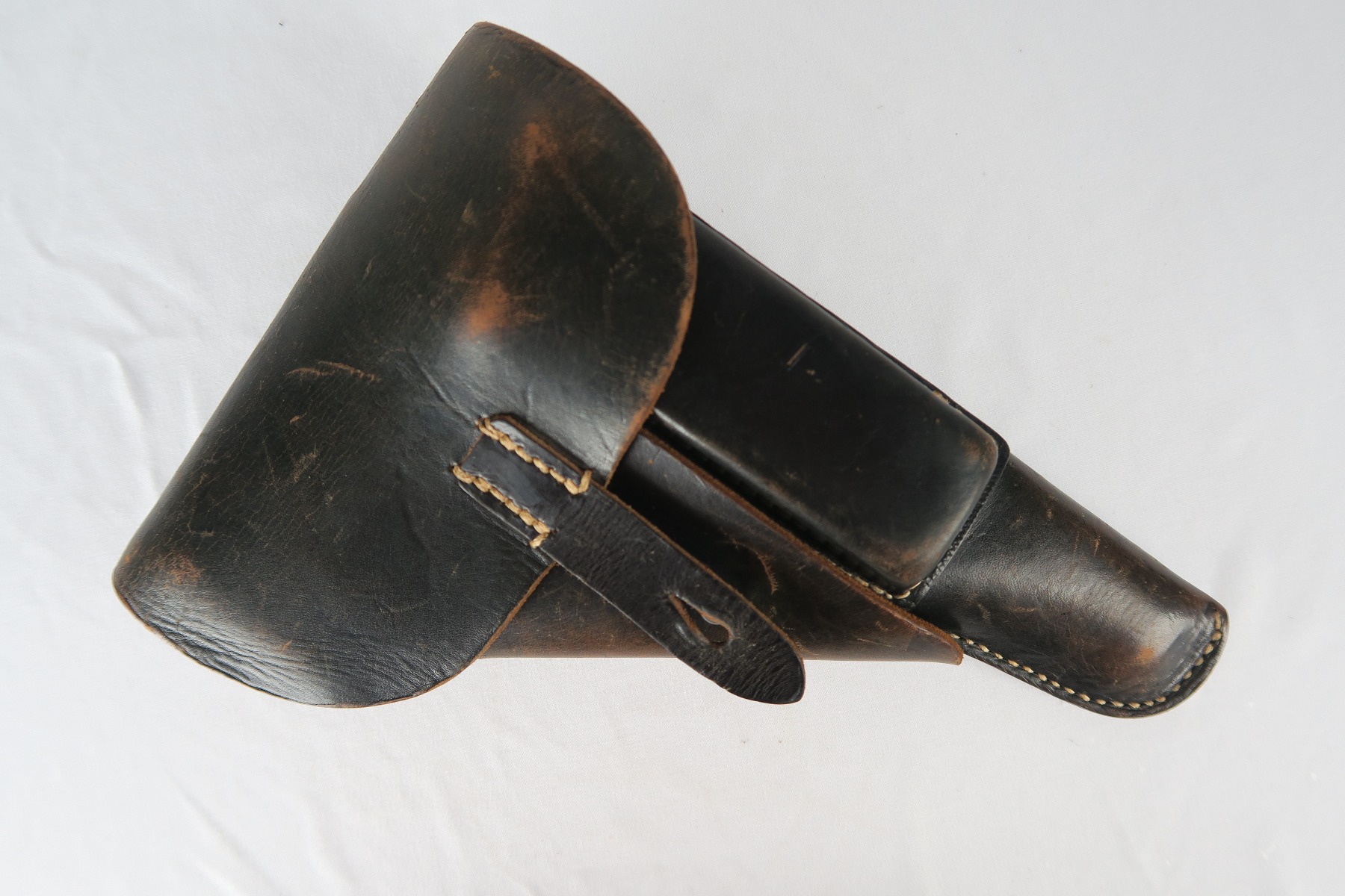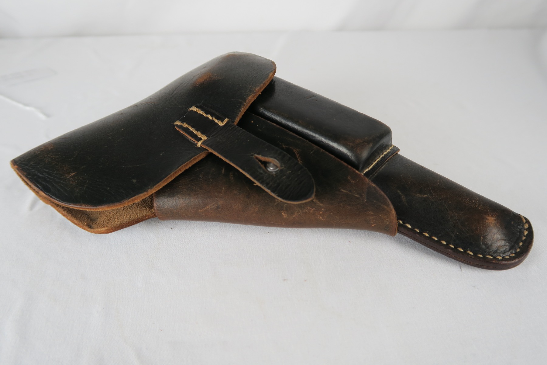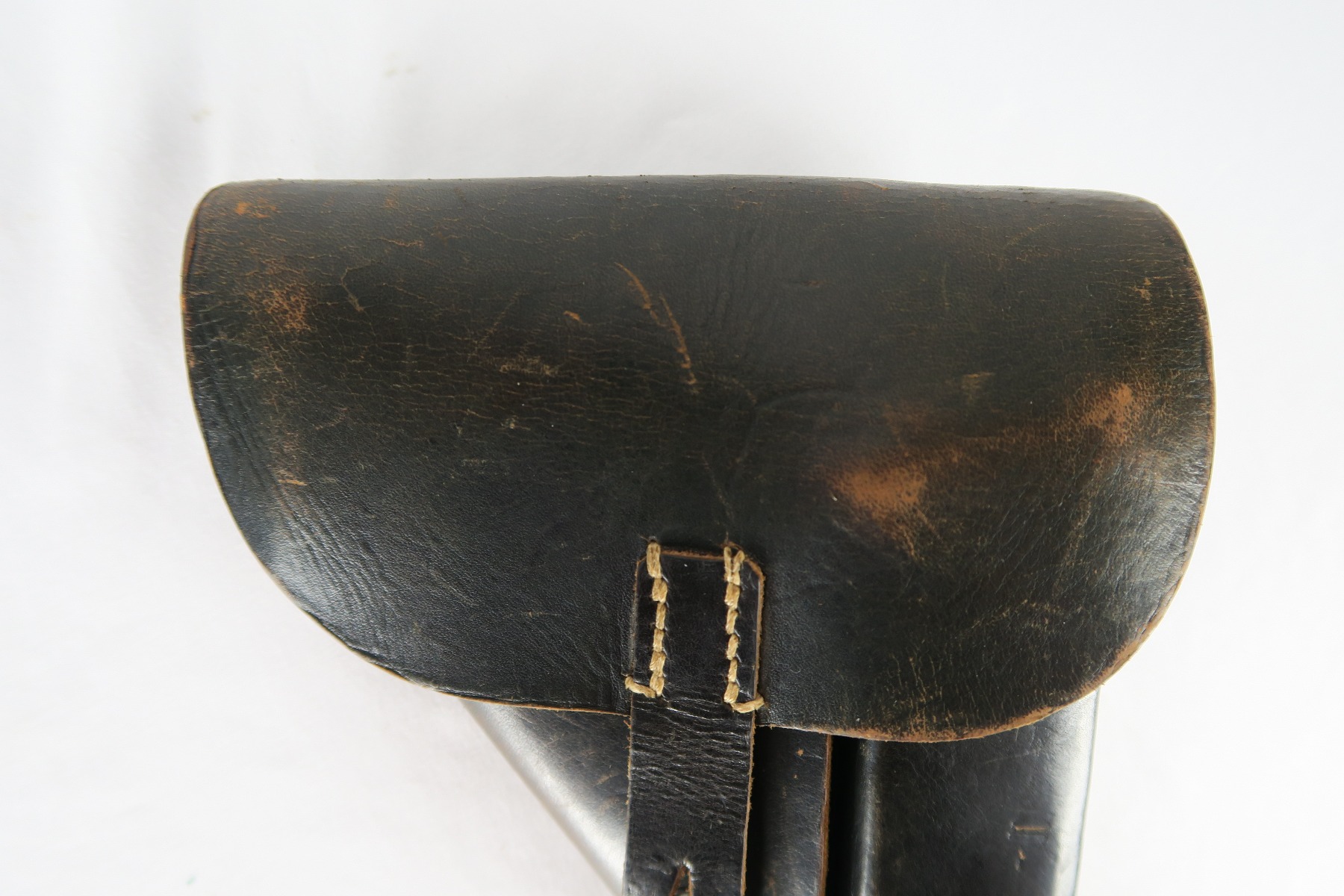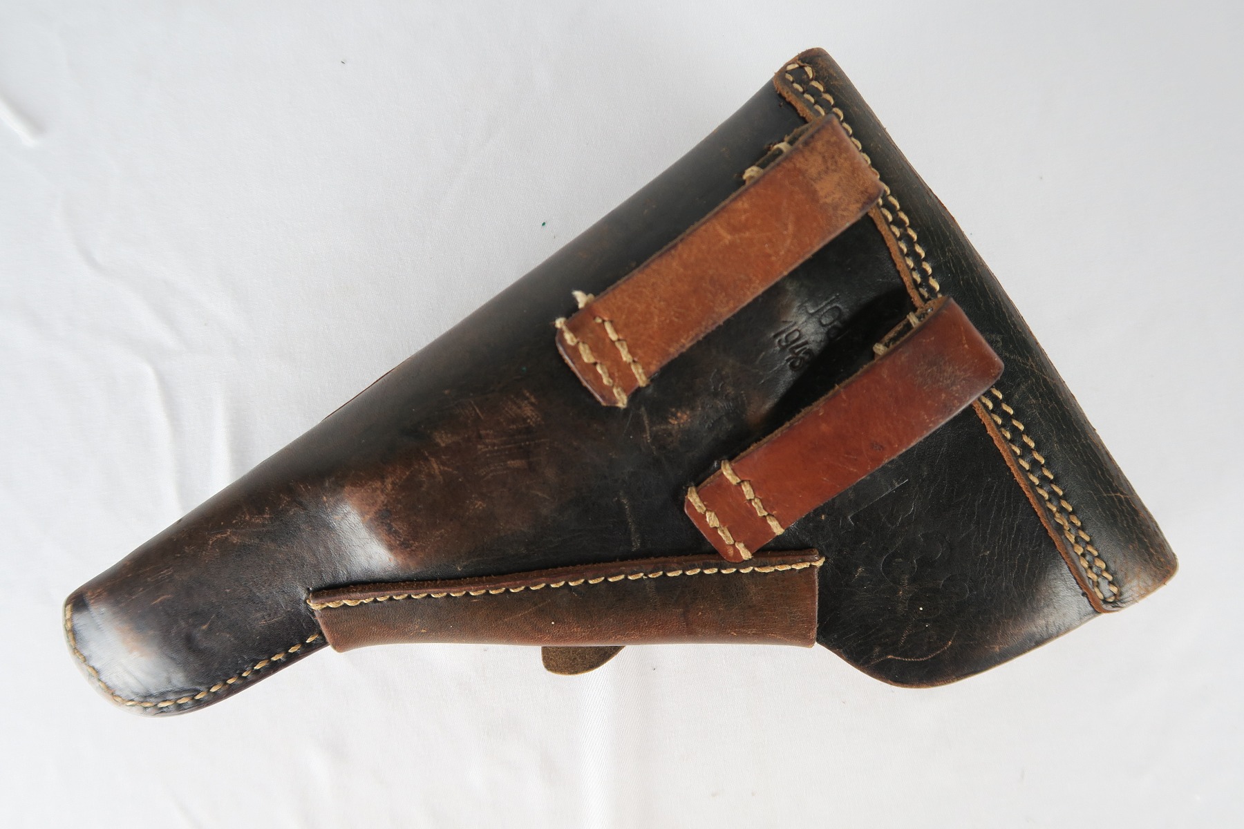 4/18/18 – This is an original WW2 wartime production softshell style P.38 holster. The holster is stamped on the back “joa” 1943 and waffen eagle proof stamped. There’s also a faint P.38 stamp on the back leather. The leather has surface wrinkling, especially on the top leather. The leather overall is soft and pliable with honest wear. The interior leather has a large black scratchy area where someone probably wrote a name and then someone else later removed / covered over the name. There are no other issues. The stitching is all tight and original.
