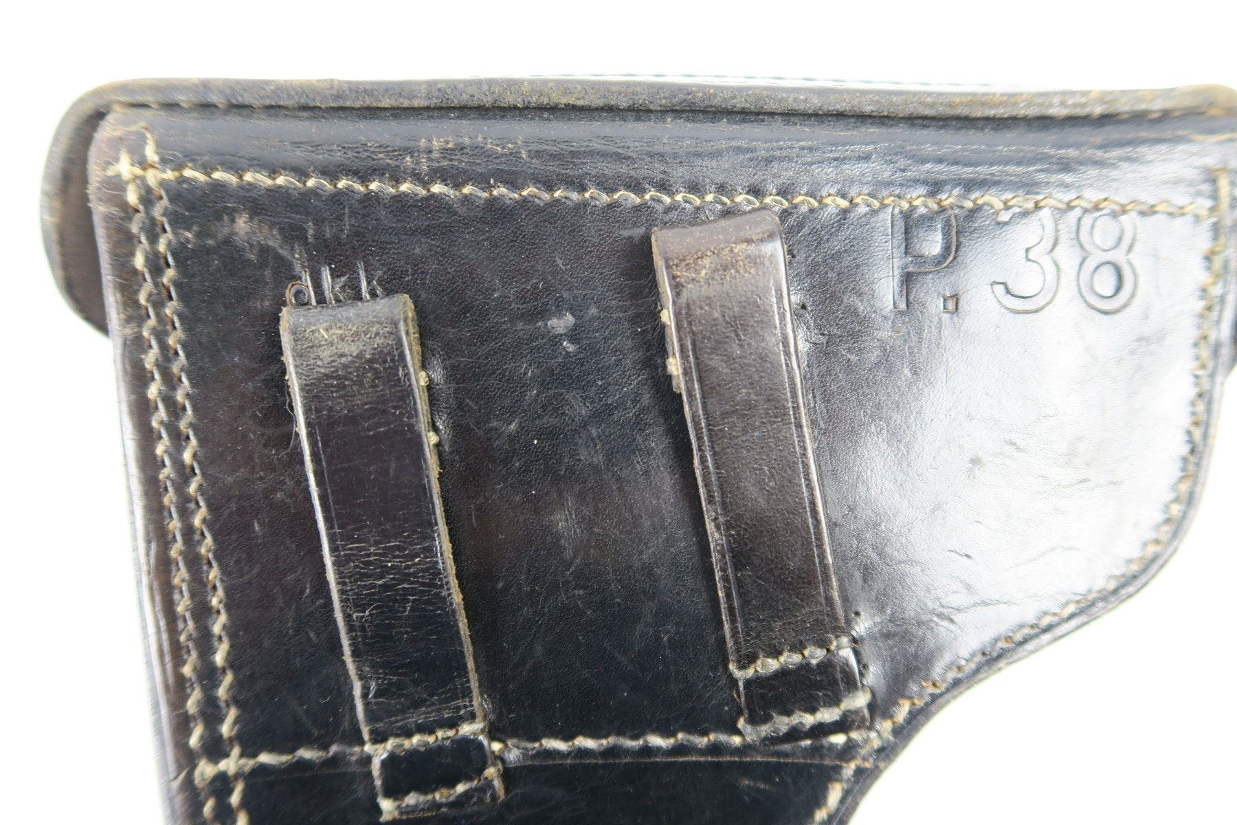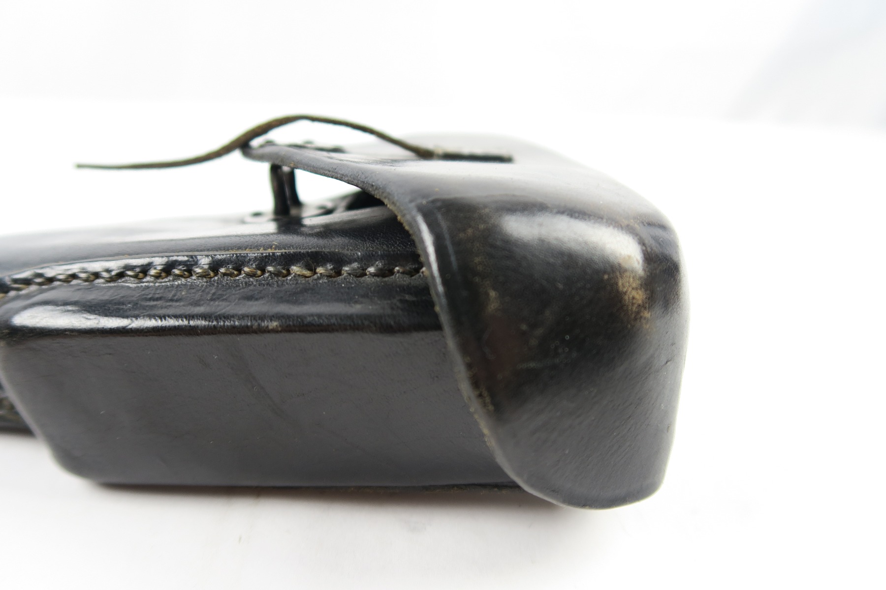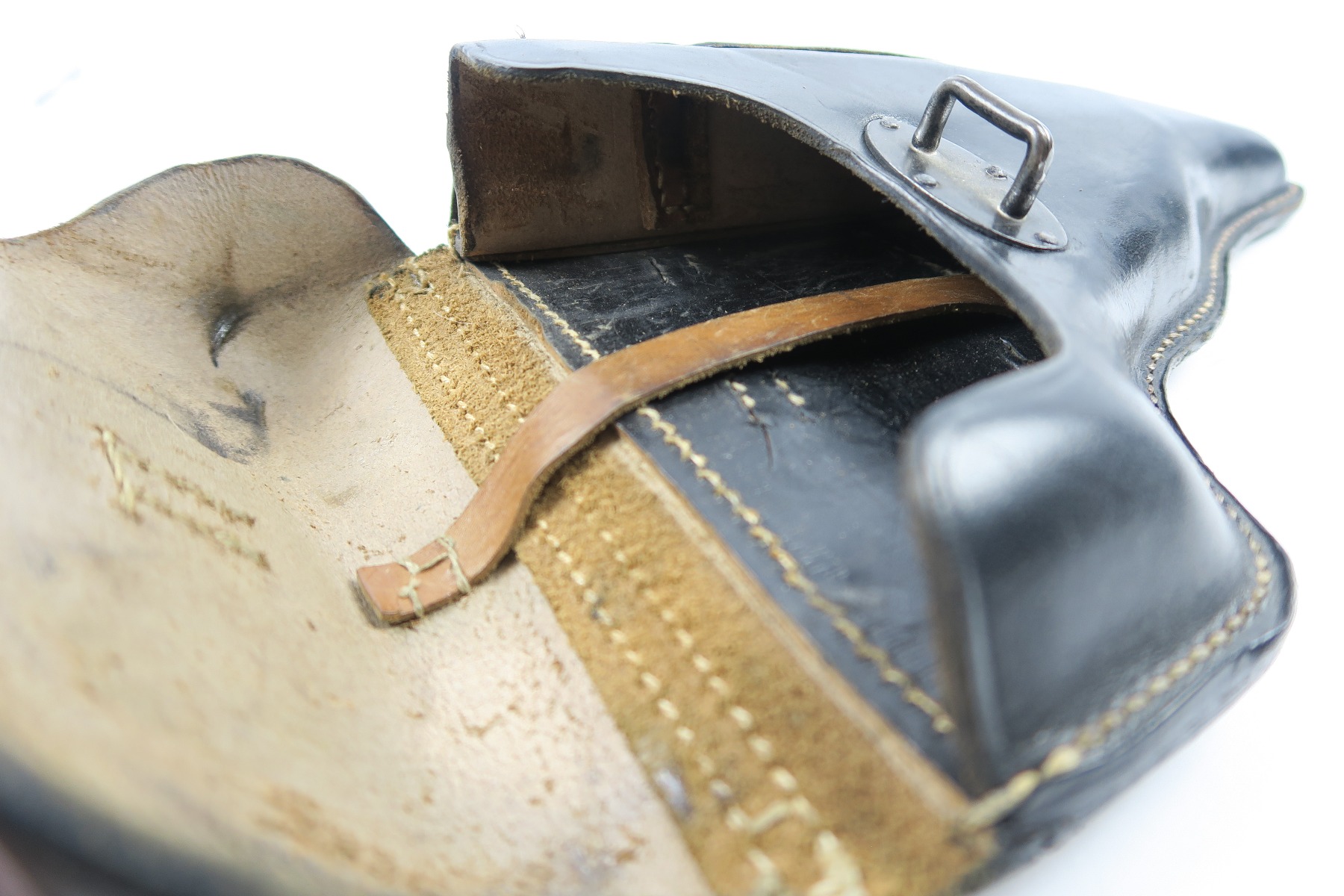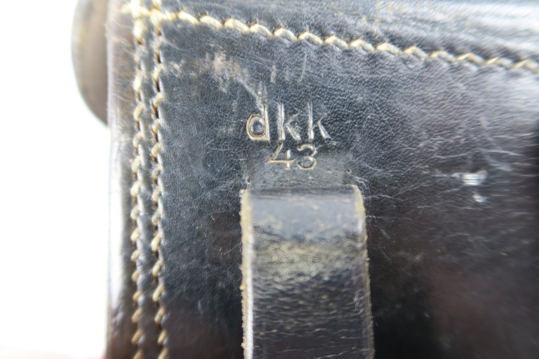 4/27/18 – This is an original 1943 dated P.38 holster from WW2. The holster is very clean with pliable leather in the hardshell style. The holster shows light signs of use but is excellent overall. Very clean interior leather and no notable exterior flaws. The back of the holster is “dkk” maker stamped and 1943 dated with a waffen military proof and P.38 stamp. Guaranteed original and authentic.