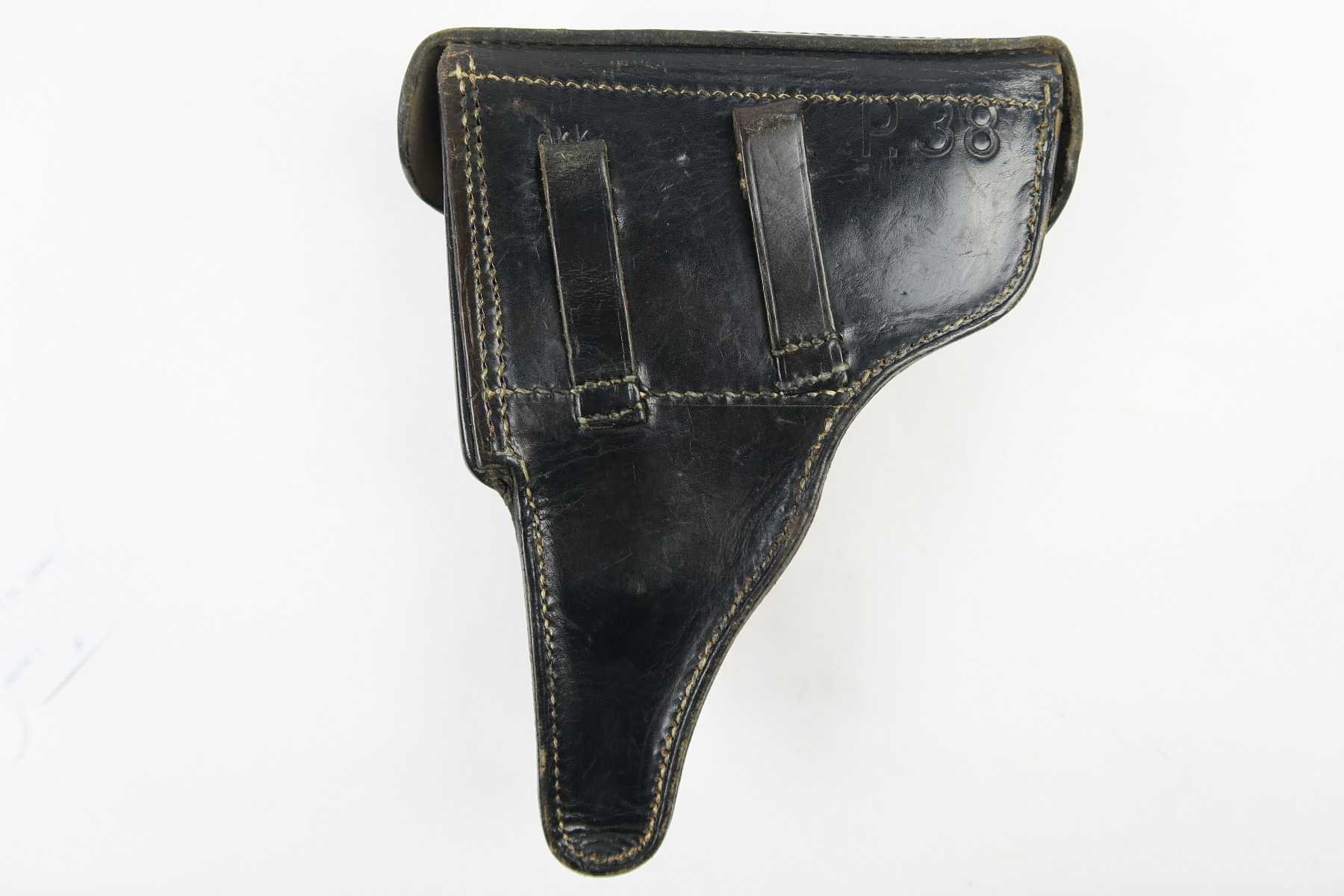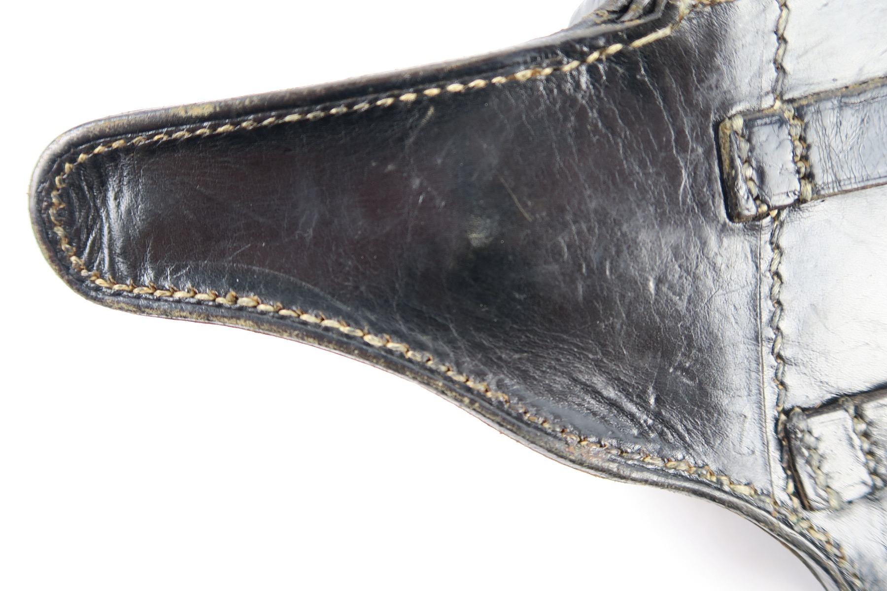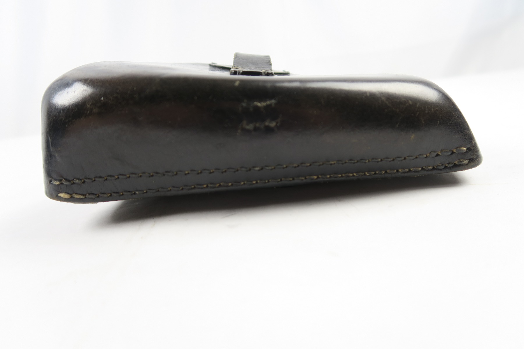 4/27/18 – This is an original 1943 dated P.38 holster from WW2. The holster is very clean with pliable leather in the hardshell style. The holster shows light signs of use but is excellent overall. Very clean interior leather and no notable exterior flaws. The back of the holster is “dkk” maker stamped and 1943 dated with a waffen military proof and P.38 stamp. Guaranteed original and authentic.