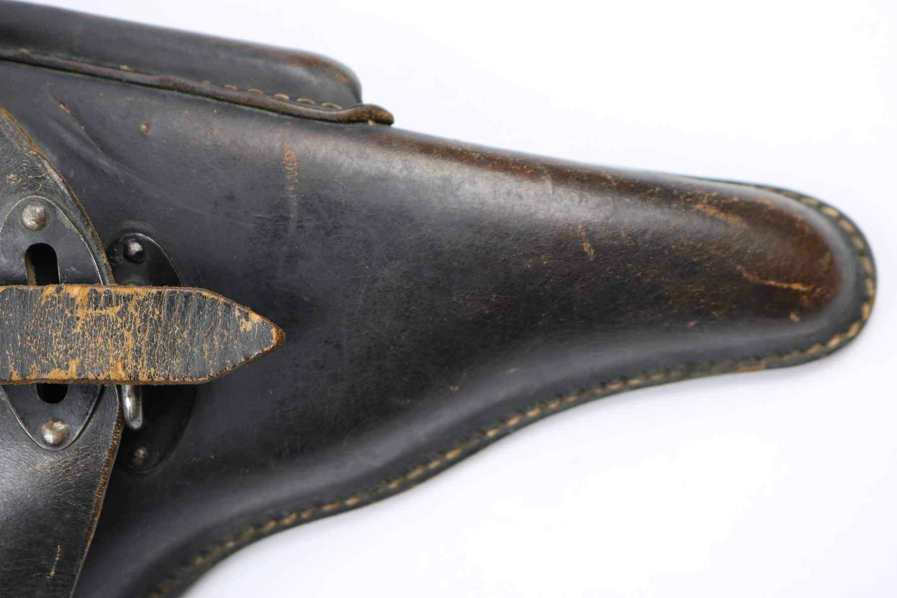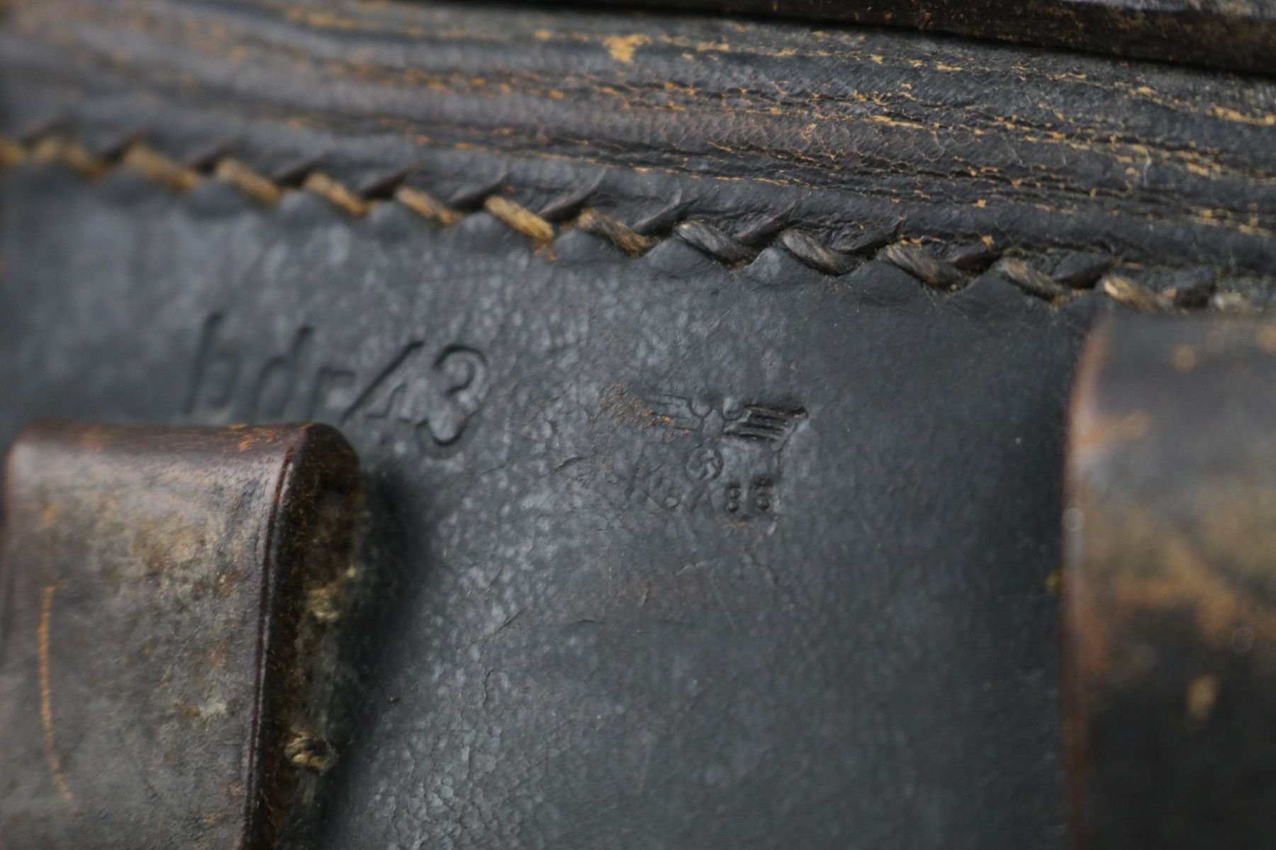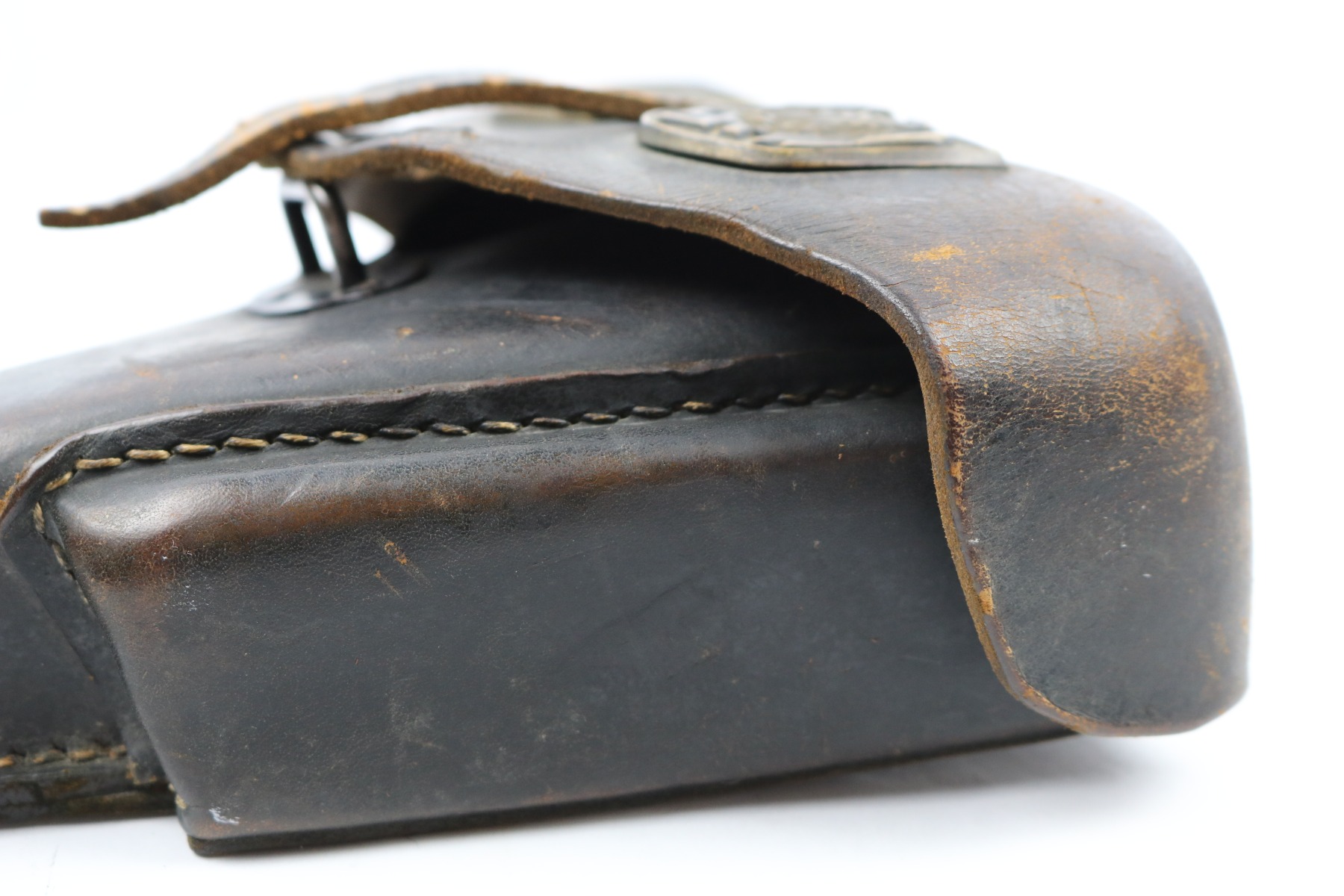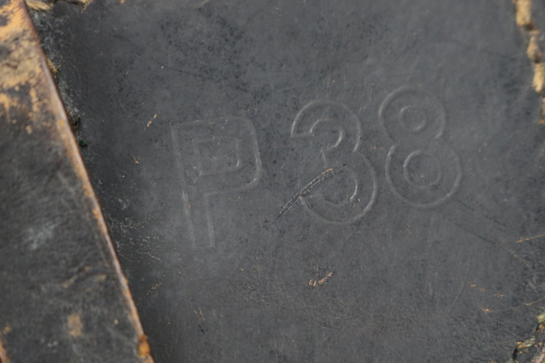 6/14/18 – This is an original 1943 hardshell P.38 holster. The holster has all original leather and stitching. The leather is strong and firm with some normal exterior scuffing. There’s light surface cracking on the closure strap, but none of this is deep cracking. The front lid has two period correct nazi military pins affixed to the leather. The interior leather shows minor molding (this can be cleaned and removed).