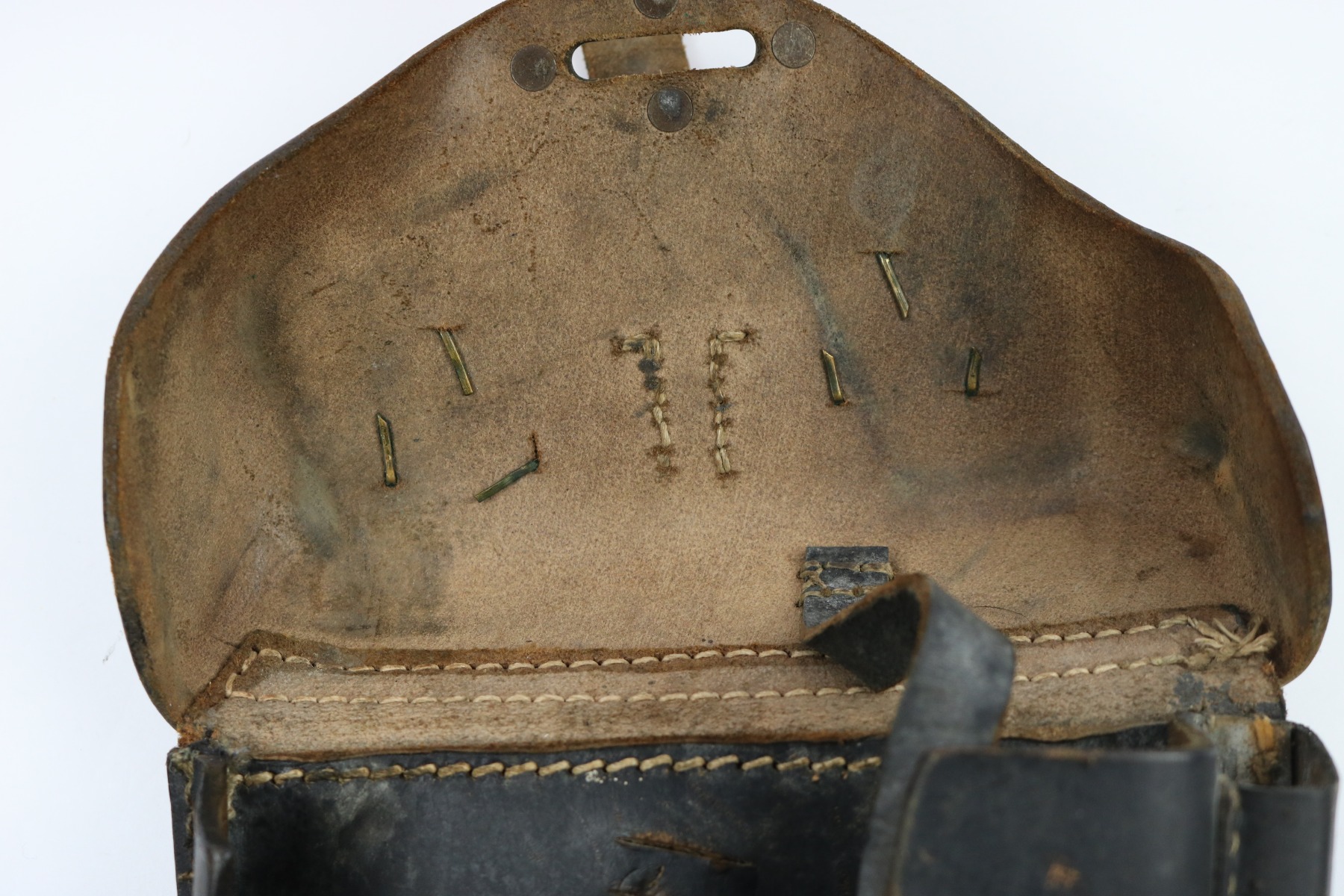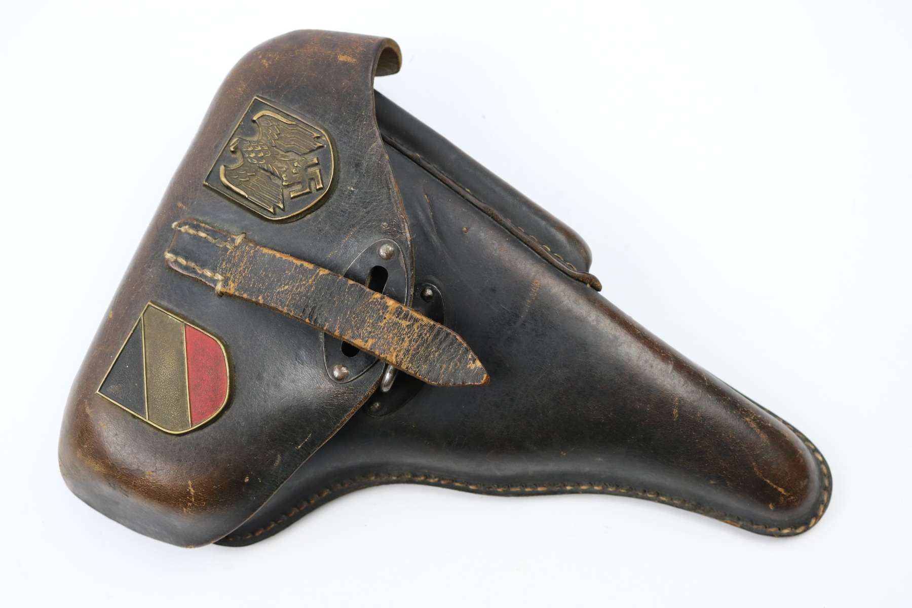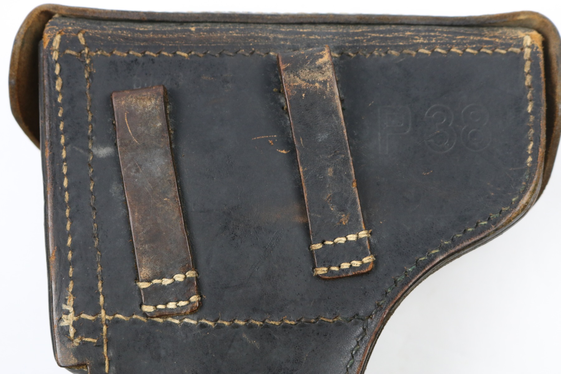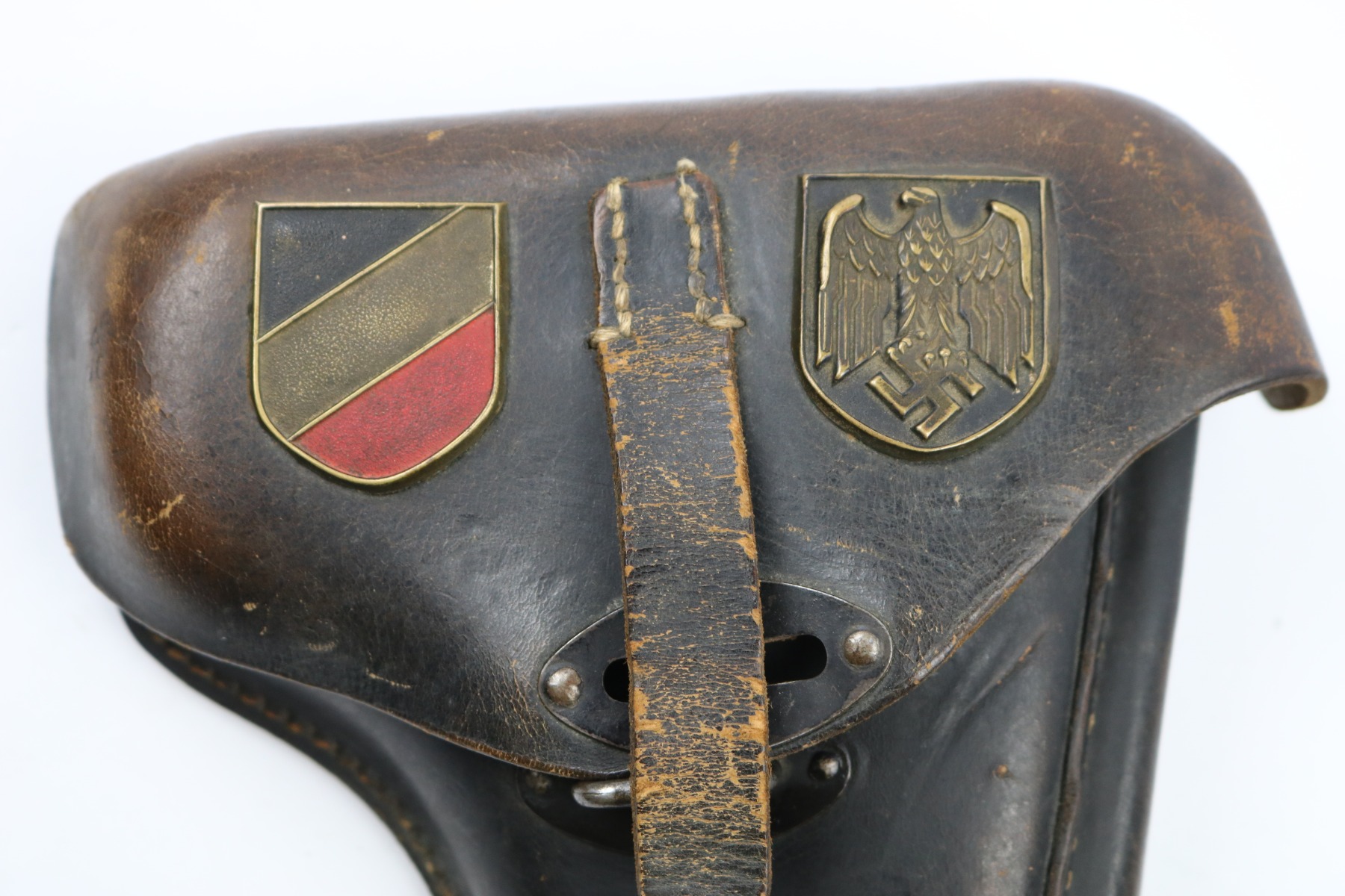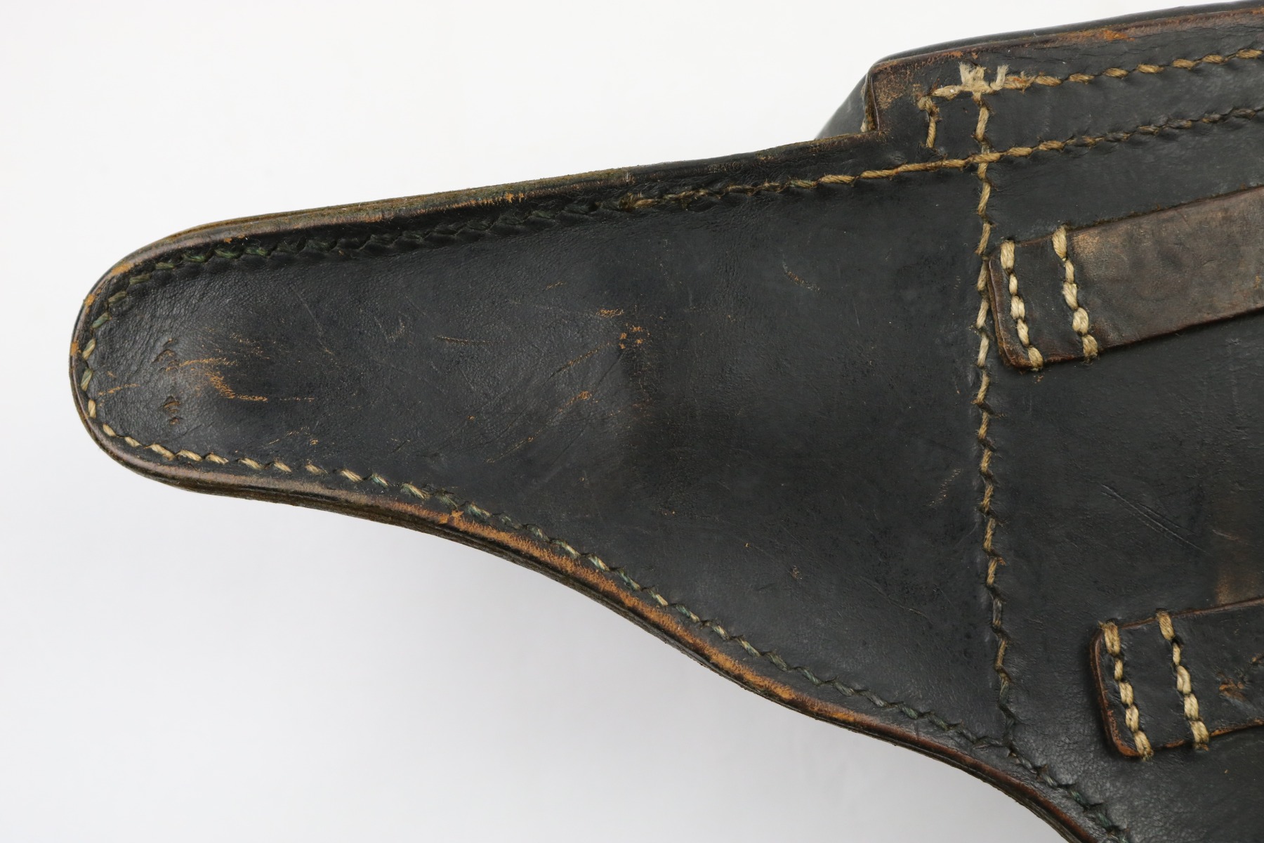 6/14/18 – This is an original 1943 hardshell P.38 holster. The holster has all original leather and stitching. The leather is strong and firm with some normal exterior scuffing. There’s light surface cracking on the closure strap, but none of this is deep cracking. The front lid has two period correct nazi military pins affixed to the leather. The interior leather shows minor molding (this can be cleaned and removed).