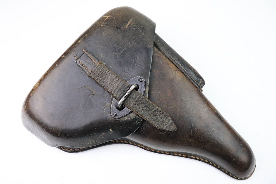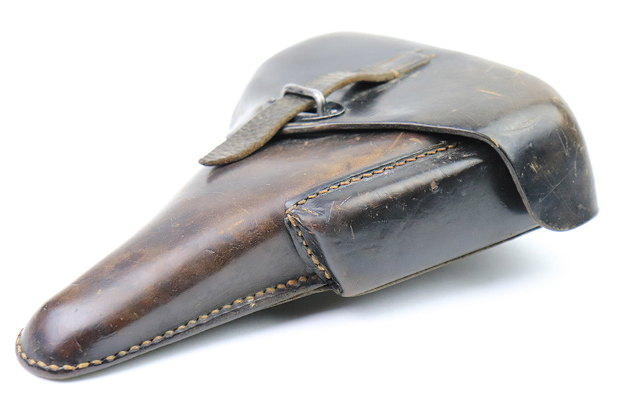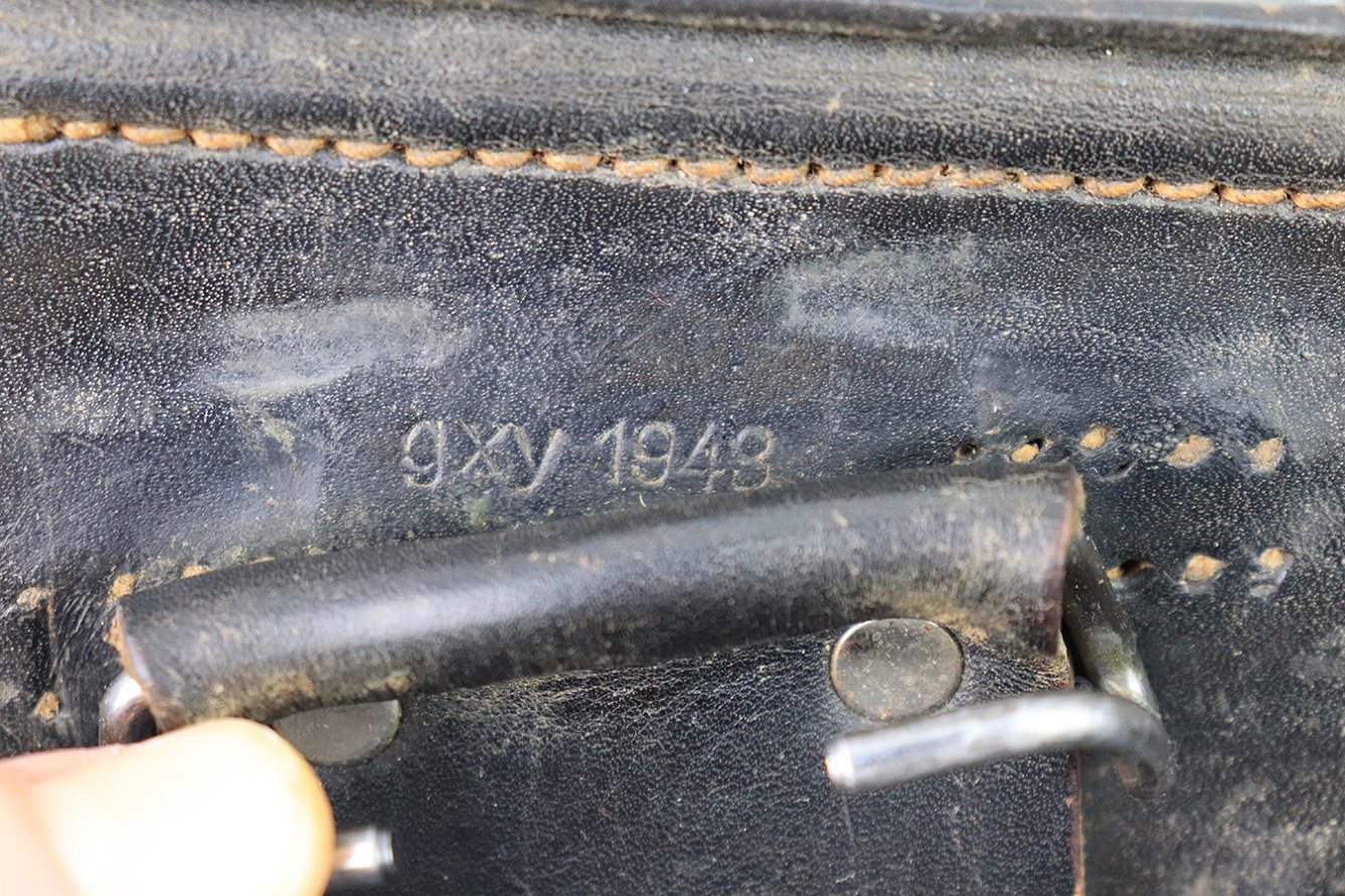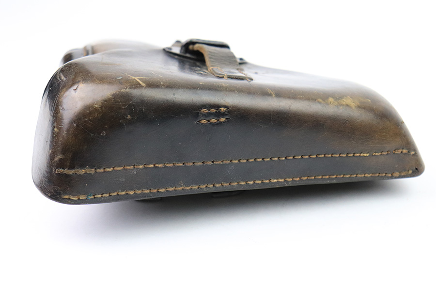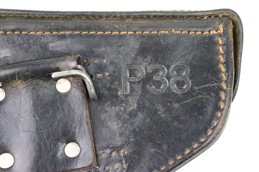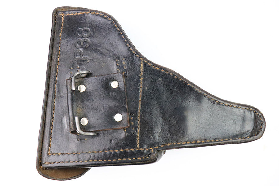 12/21/22 – This is an original 1943 hard shell P.38 holster from WW2. The holster is all original except for the back belt loops, which have been replaced with a US style belt attachment that has been riveted to the back leather. G.I.s often made these modifications so they could carry their “war booty” on their standard issued canvas belts. The holster has mild pliability and clean interior leather. The stitching is all original and tight throughout.
