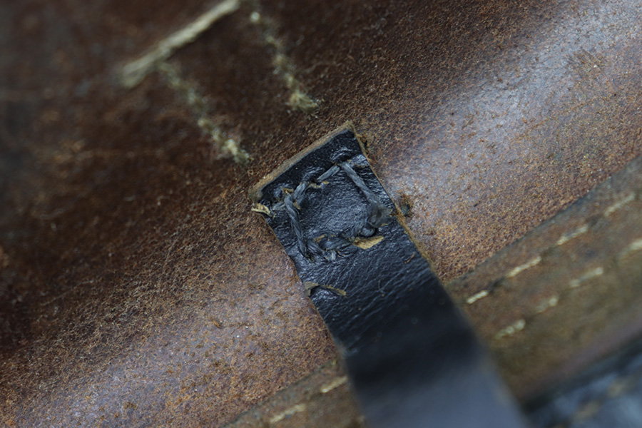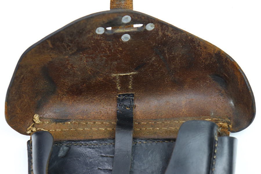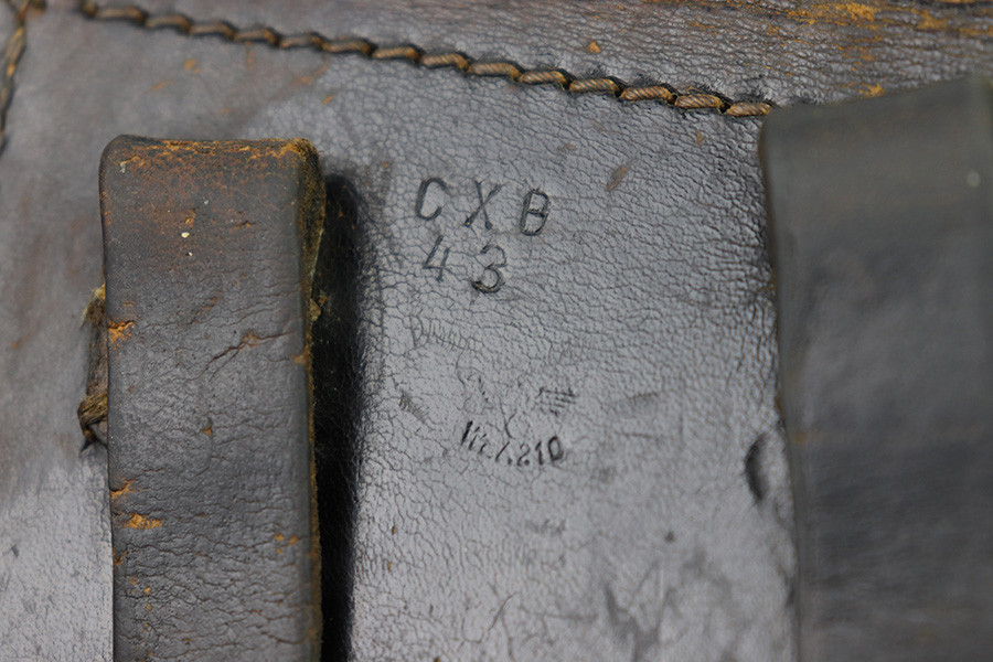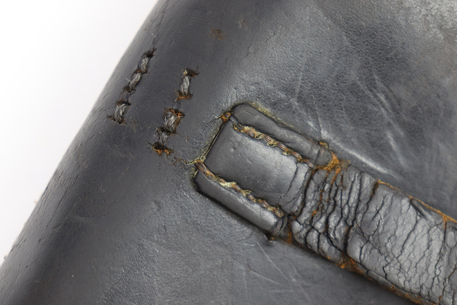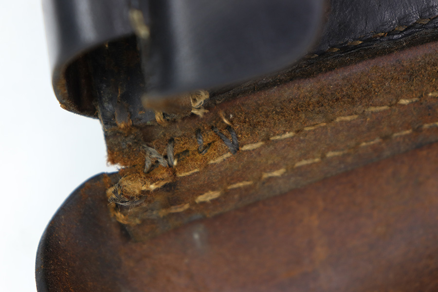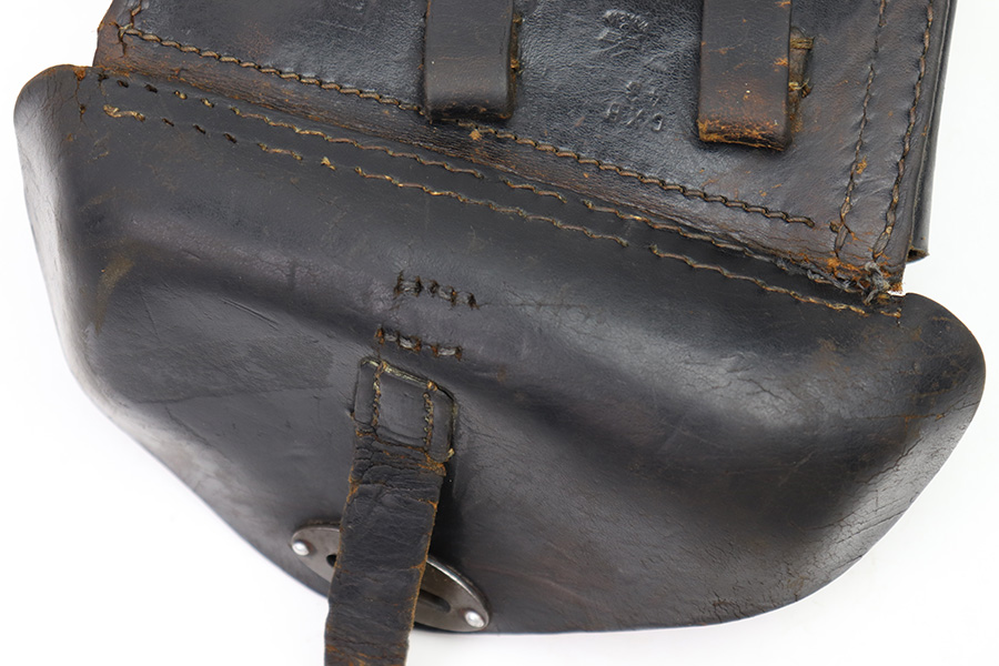 11/15/22 – This is an original 1943 dated P.38 holster from WW2. The holster is in good condition, but has been repaired in the top right corner of where the lid meets the body of leather and on the closure strap. These repairs are black stitching, as shown in photos. The leather is all original and shows honest wear throughout. Soft and pliable with surface wrinkling and mild scuffs and signs of previous use and aging. The back leather is maker stamped, dated, waffen proofed, and P.38 stamped. The stitching is original and intact throughout the holster, except for where the repairs are as mentioned.