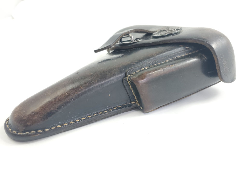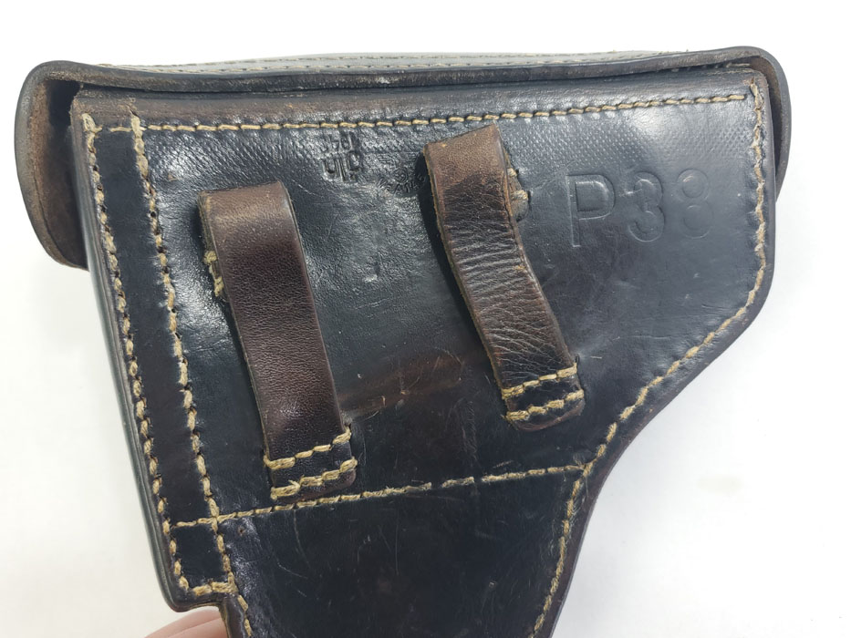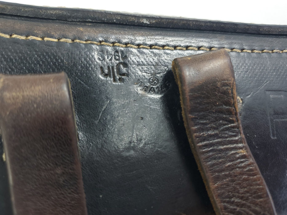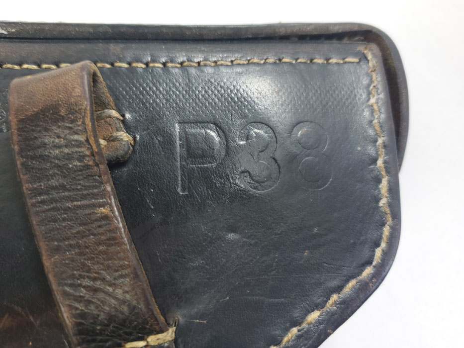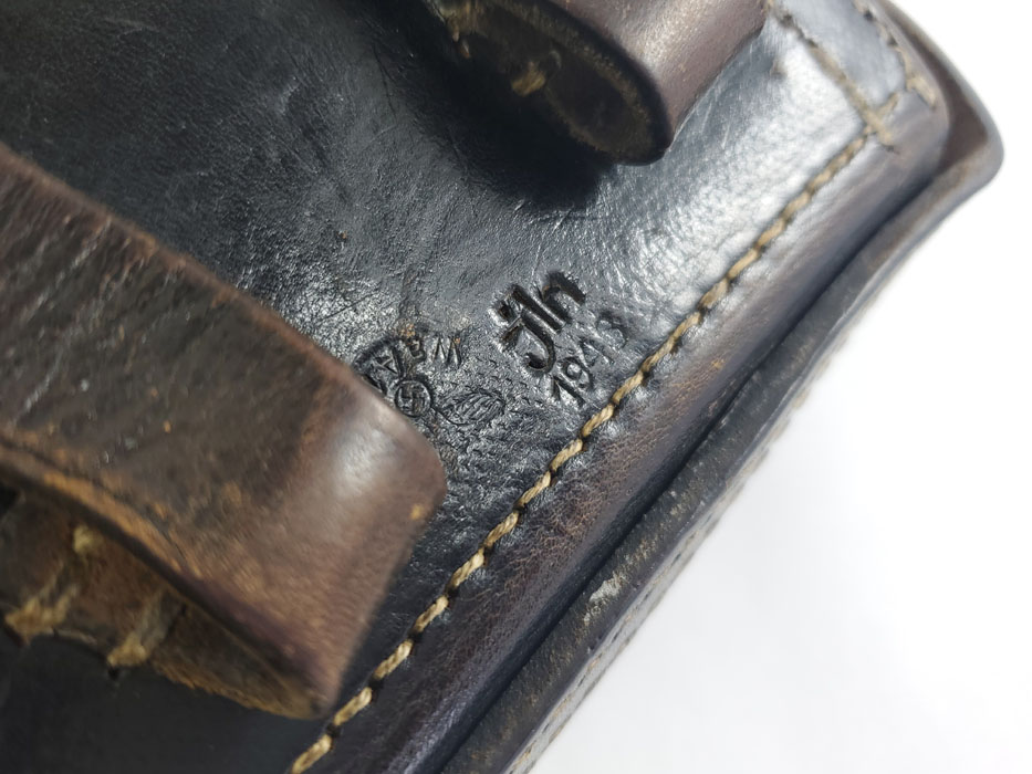 5/28/20 – This is a 1943 dated P.38 holster from WW2. Great condition overall, and has been embellished with a unique “shooting prize” medal. The medal appears original and authentic, but it’s not like any other badge / medal we’ve seen. Appears original though, and makes this a unique holster. The leather is in great condition overall with normal pliability and some light black dye loss, but no major issues. All original stitching. The back of the holster is maker stamped, dated, and waffen proof stamped.
