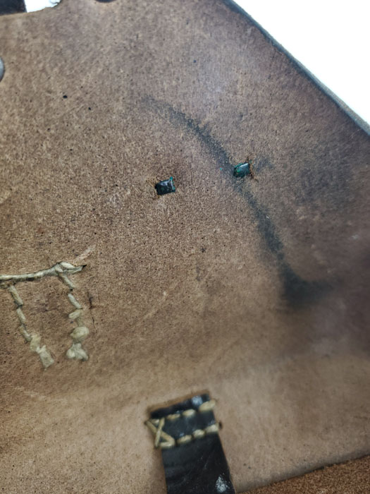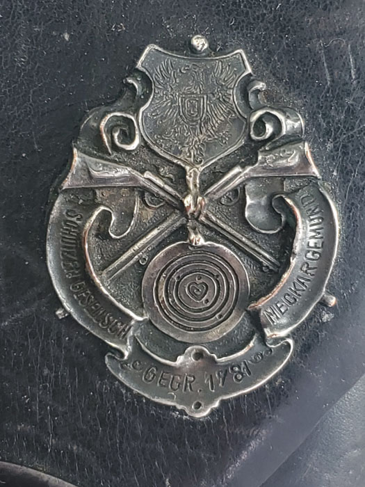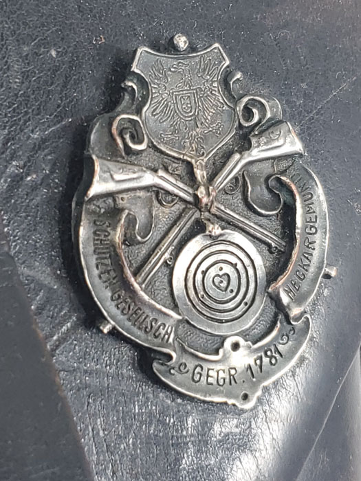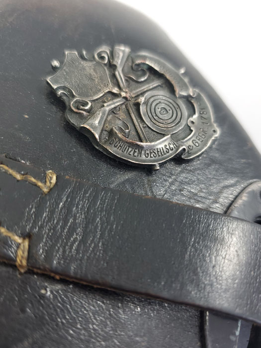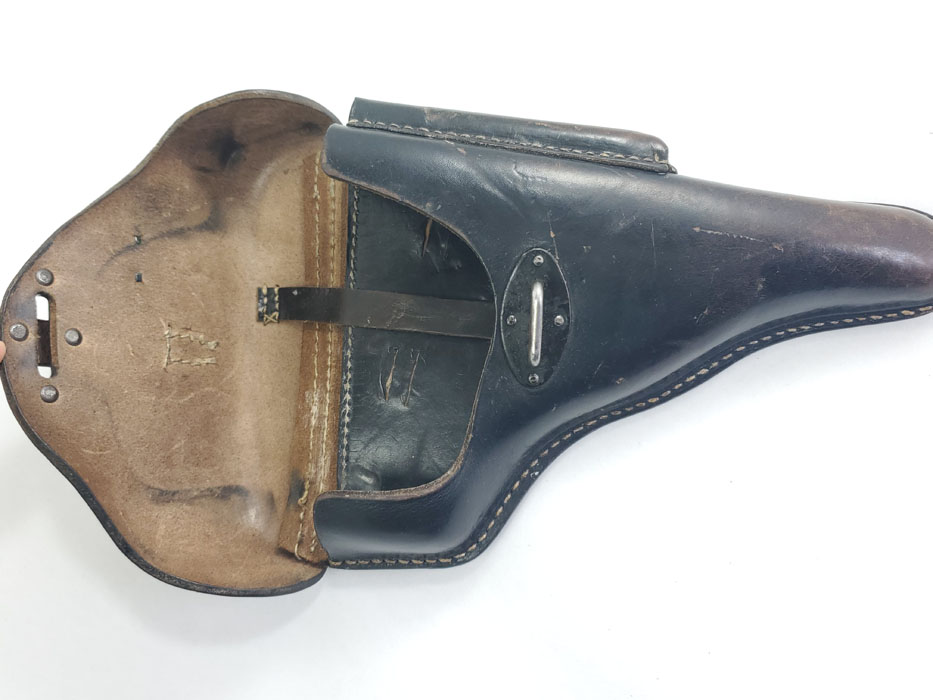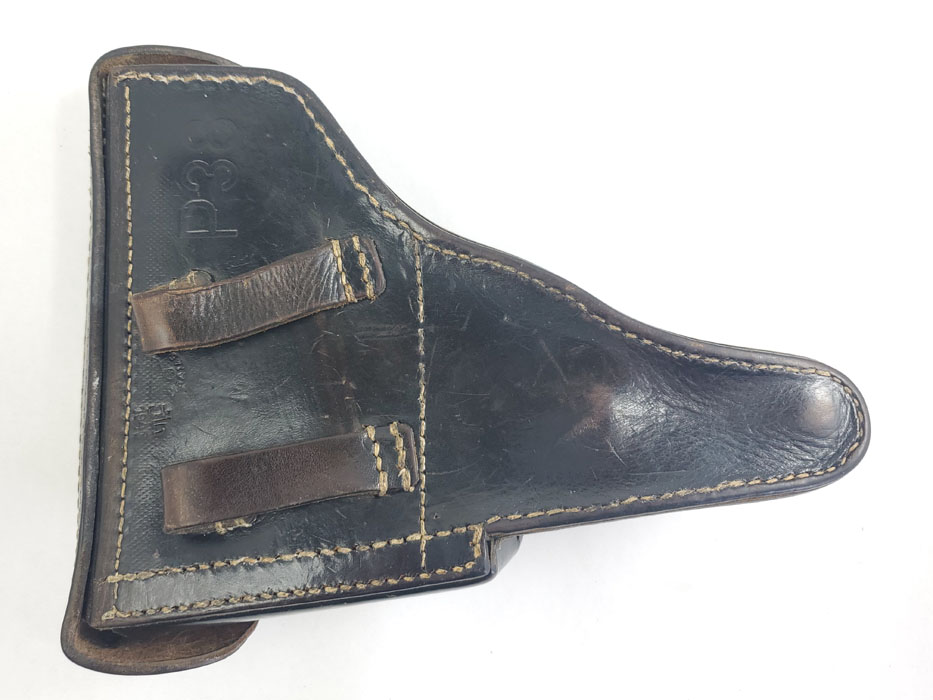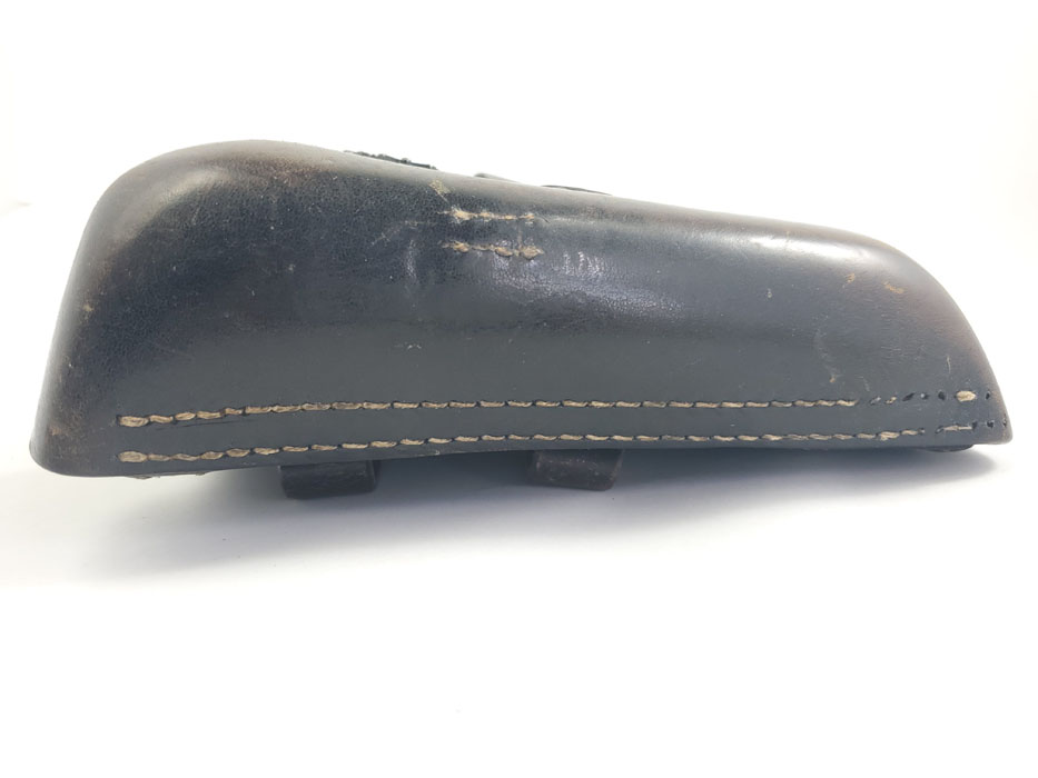5/28/20 – This is a 1943 dated P.38 holster from WW2. Great condition overall, and has been embellished with a unique “shooting prize” medal. The medal appears original and authentic, but it’s not like any other badge / medal we’ve seen. Appears original though, and makes this a unique holster. The leather is in great condition overall with normal pliability and some light black dye loss, but no major issues. All original stitching. The back of the holster is maker stamped, dated, and waffen proof stamped.