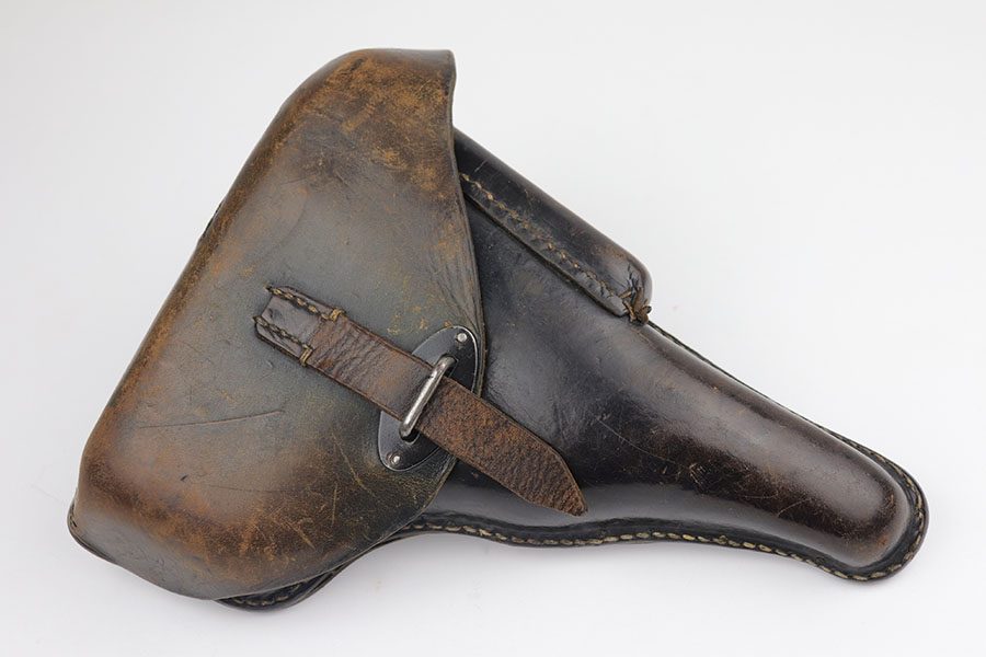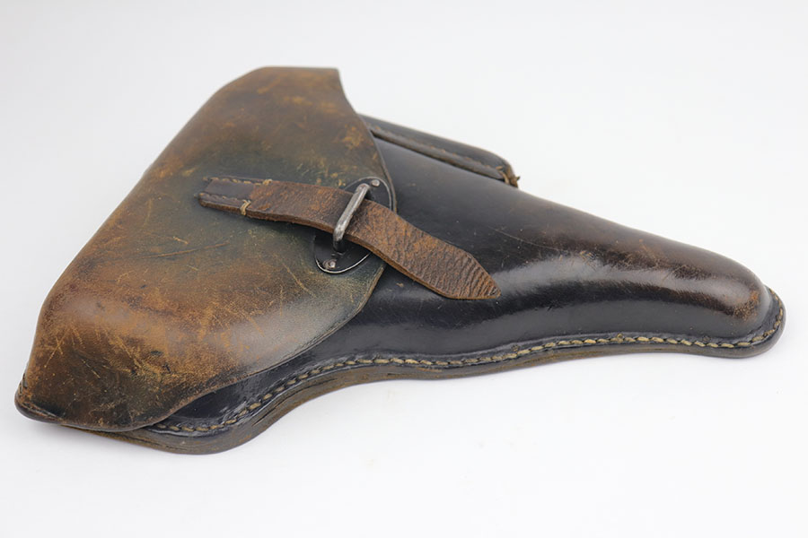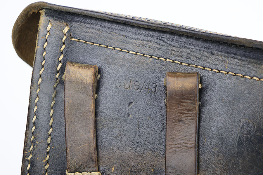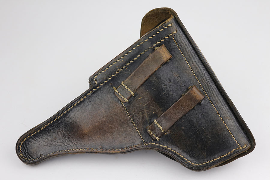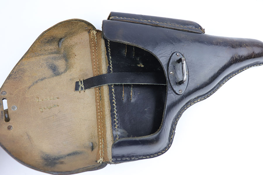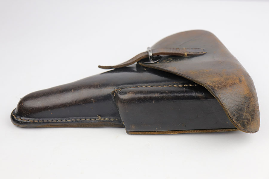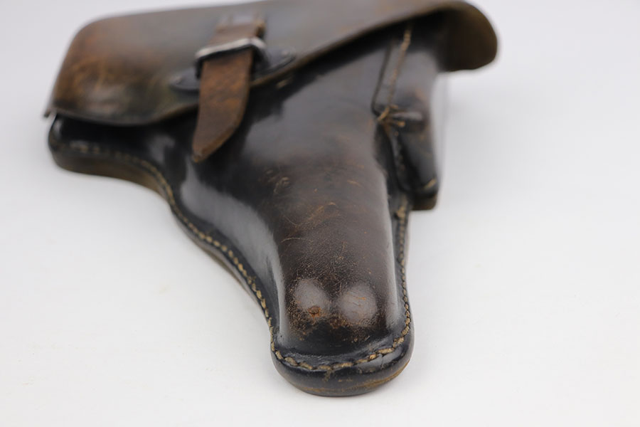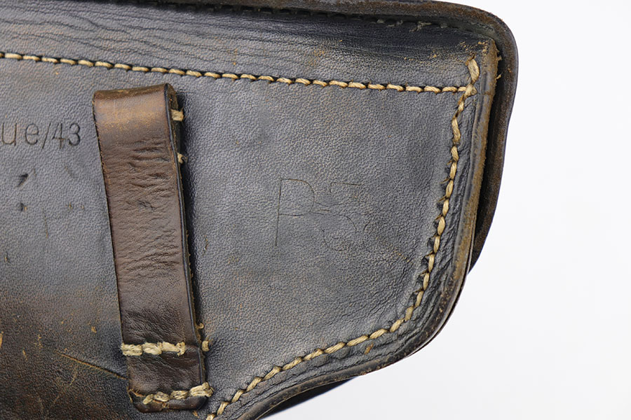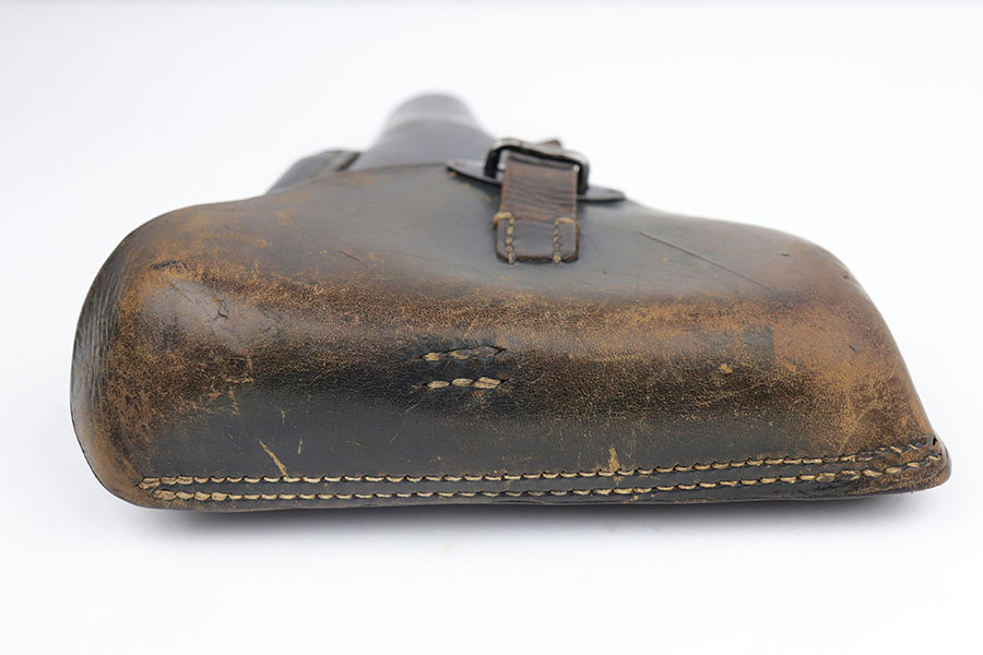 9/9/19 – This is an original 1943 dated P.38 holster from WW2. The back of the holster is maker stamped, dated, and waffen eagle military proof stamped. The leather was black but has worn down so it looks more brown now. Normal pliability. All original leather and stitching in tact. Interior leather is fairly clean. No major notable flaws.