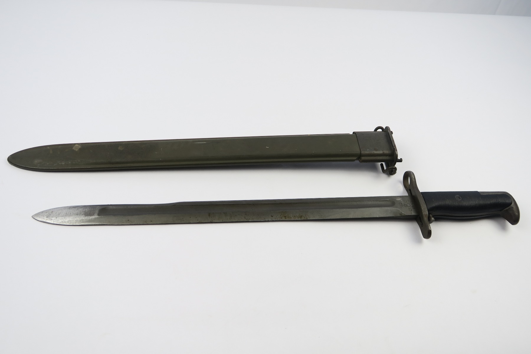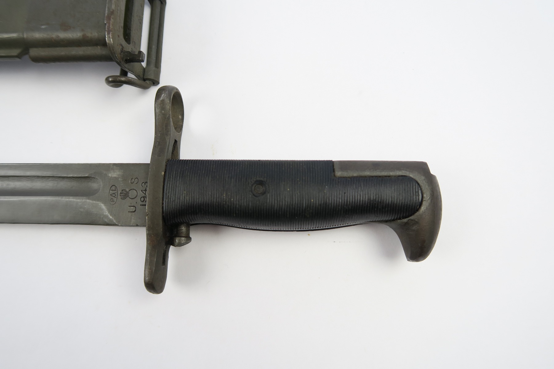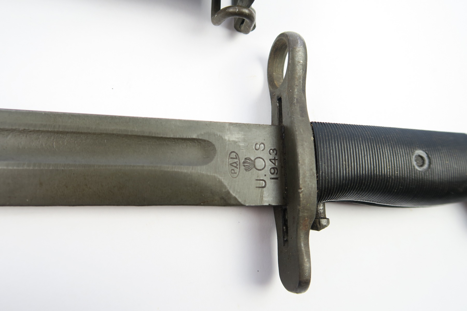 3/19/18 – This is an original WW2 PAL made rifle bayonet. The bayonet is dated 1943 and maker stamped on one side of the blade. The blade has some light speckling but no signs of sharpening nor any major flaws. The blade is excellent overall. The black handles and scabbard are also excellent. The scabbard is USN MK I stamped, but research tells me that these were used by the marines. Some research books claim that the USN stamped scabbards are not correct, but experts say that supply was short on scabbards so marines (and even some US army) were given these USN marked scabbards. Guaranteed original and authentic.
