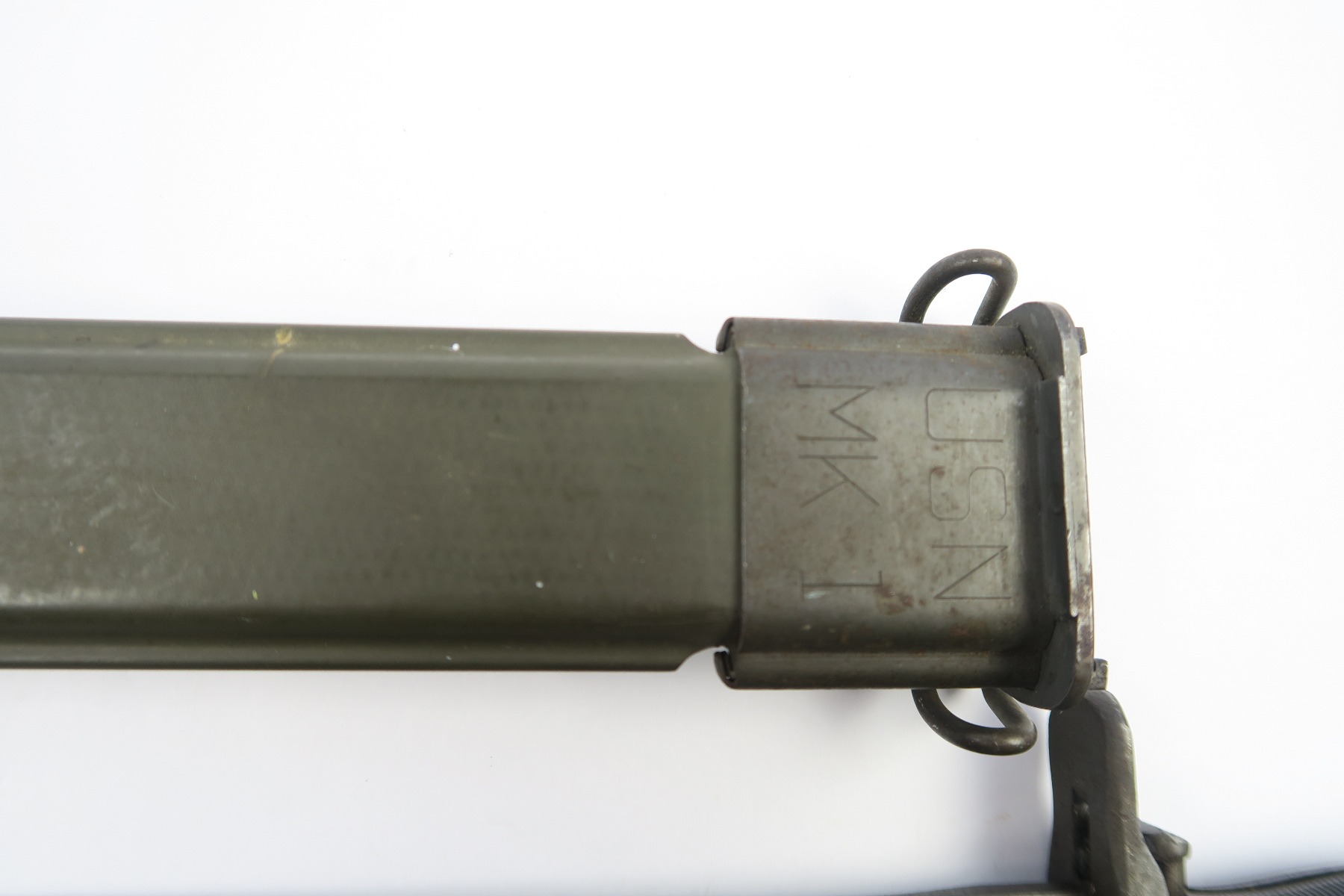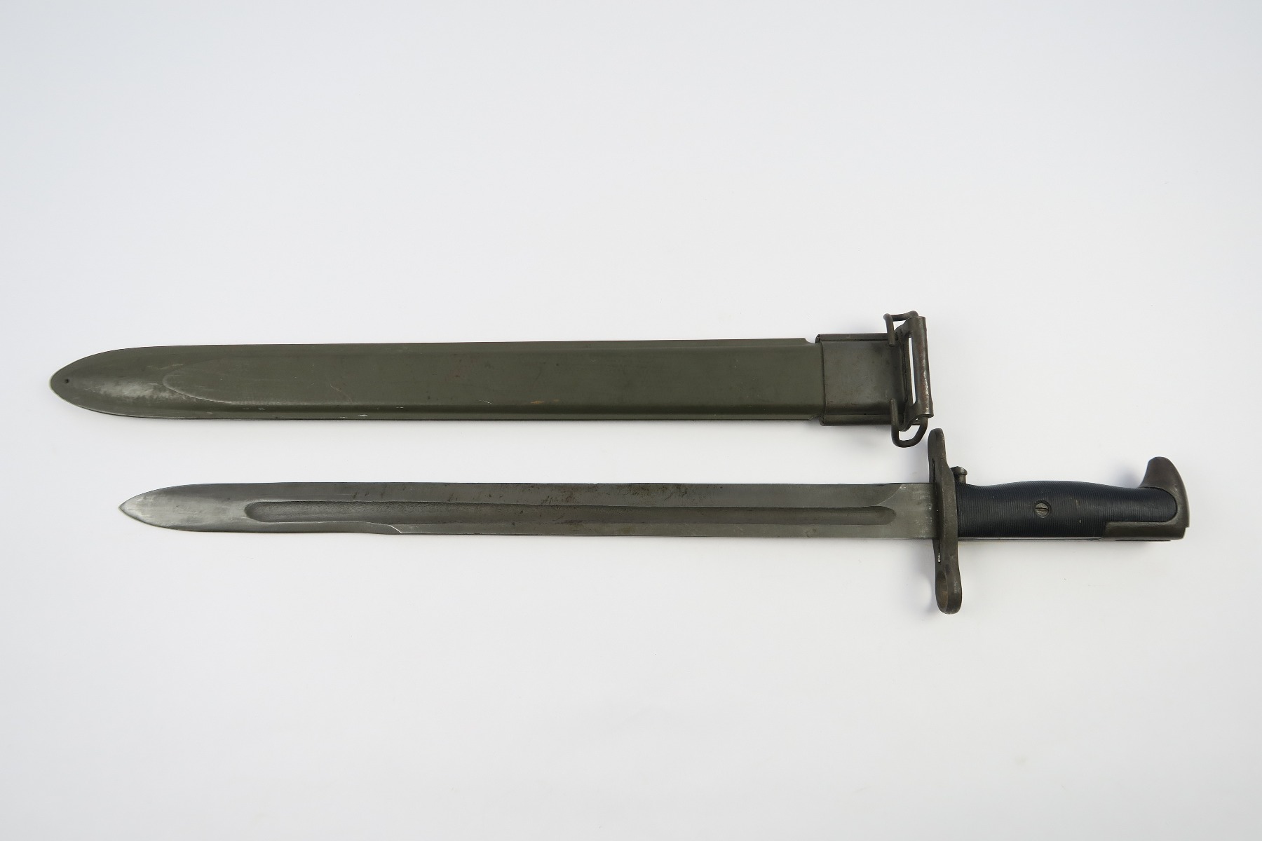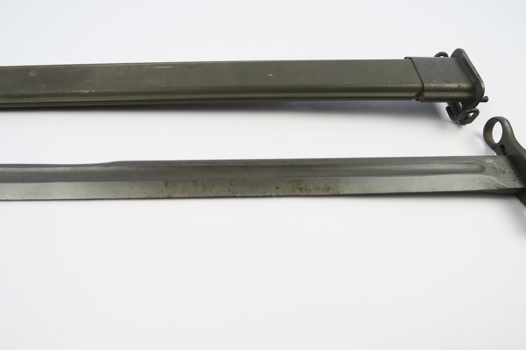 3/19/18 – This is an original WW2 PAL made rifle bayonet. The bayonet is dated 1943 and maker stamped on one side of the blade. The blade has some light speckling but no signs of sharpening nor any major flaws. The blade is excellent overall. The black handles and scabbard are also excellent. The scabbard is USN MK I stamped, but research tells me that these were used by the marines. Some research books claim that the USN stamped scabbards are not correct, but experts say that supply was short on scabbards so marines (and even some US army) were given these USN marked scabbards. Guaranteed original and authentic.