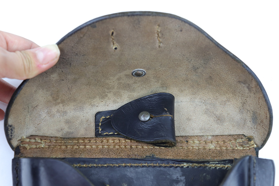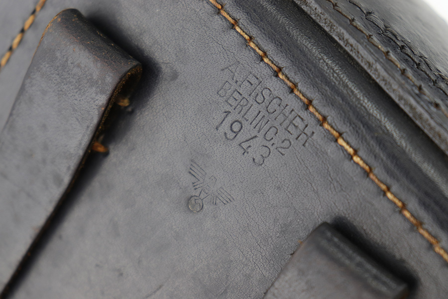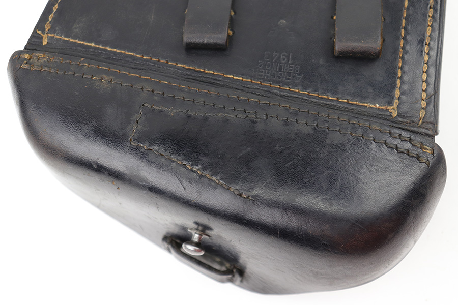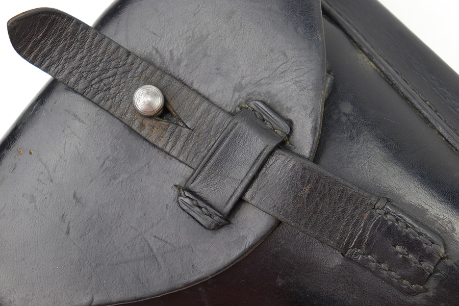 8/2/23 – This is an original, later WW2 production Luger holster issued to the German Police. The holster is typical police style, and is fairly scarce since Luger production mostly stopped in 1942. This holster likely went with a police reissued or reworked luger, but would also be appropriate for most WW2 production Police Lugers. The holster has very nice black leather with some mild surface imperfections but no major issues. There is evidence of some light polishing / added black dye to the front of the holster, which has turned some of the stitching black. There’s a small area of scuffing on the front leather near the toe, and typical wrinkling on the closure strap. No notable stitching flaws. Maker stamped, 1943 date stamped, and police proof stamped on the back leather. Clean interior leather.