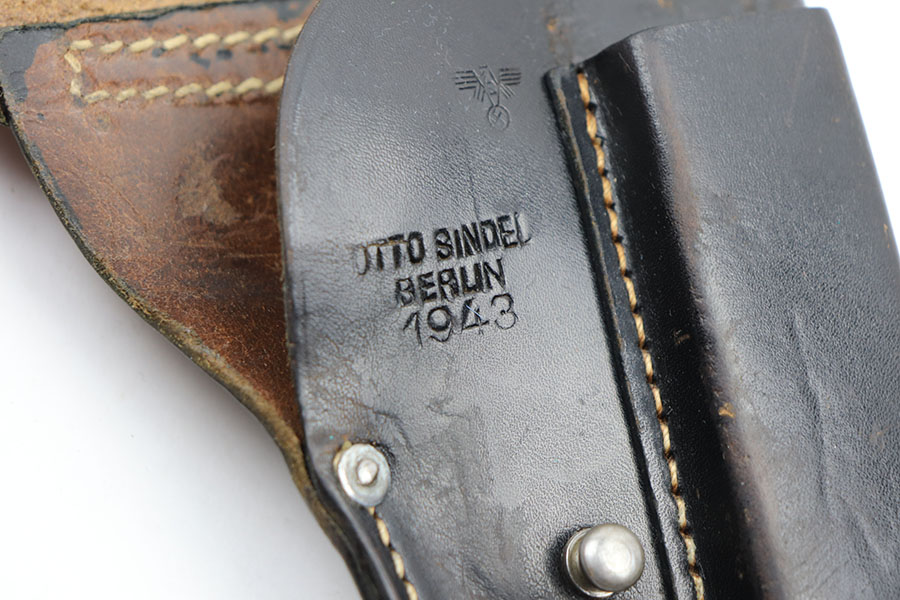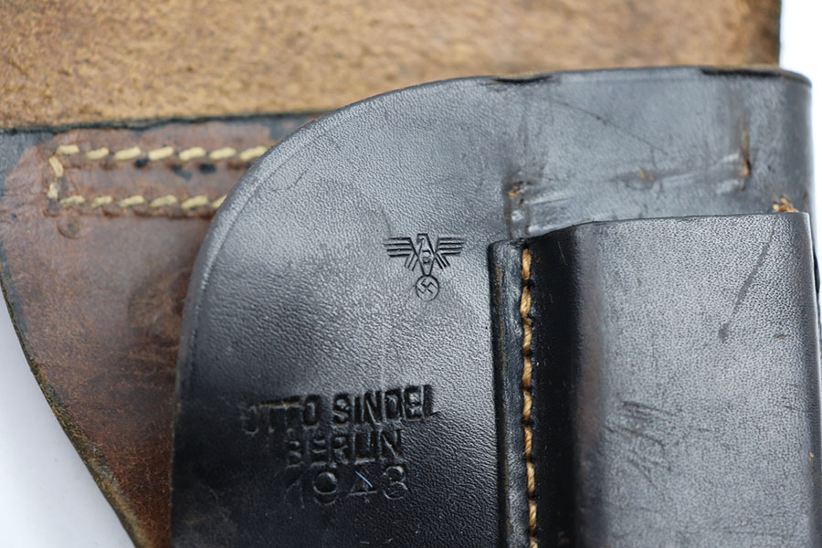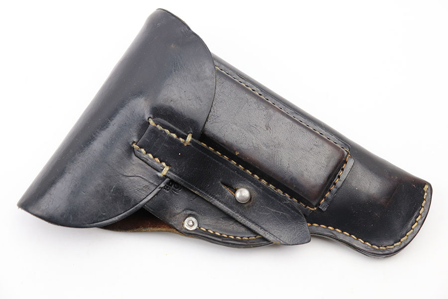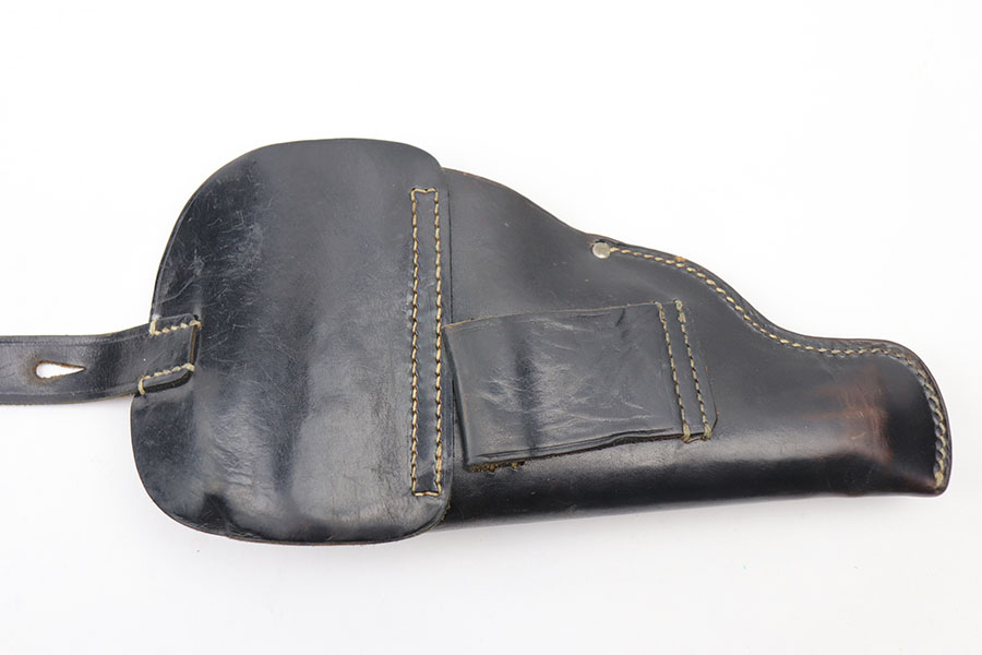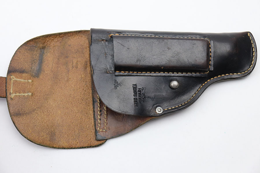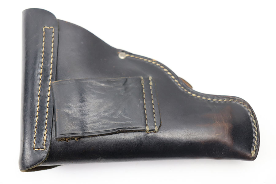 5/4/21 – This is a very nice black leather police holster for a Walther PPK or similar sized pistol. The leather shows typical signs of light use and aging but no major issues. Stitching is intact without issues as well. Maker stamped and dated under the closure strap.