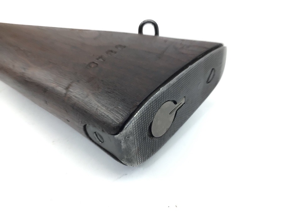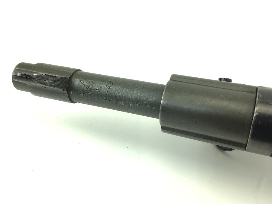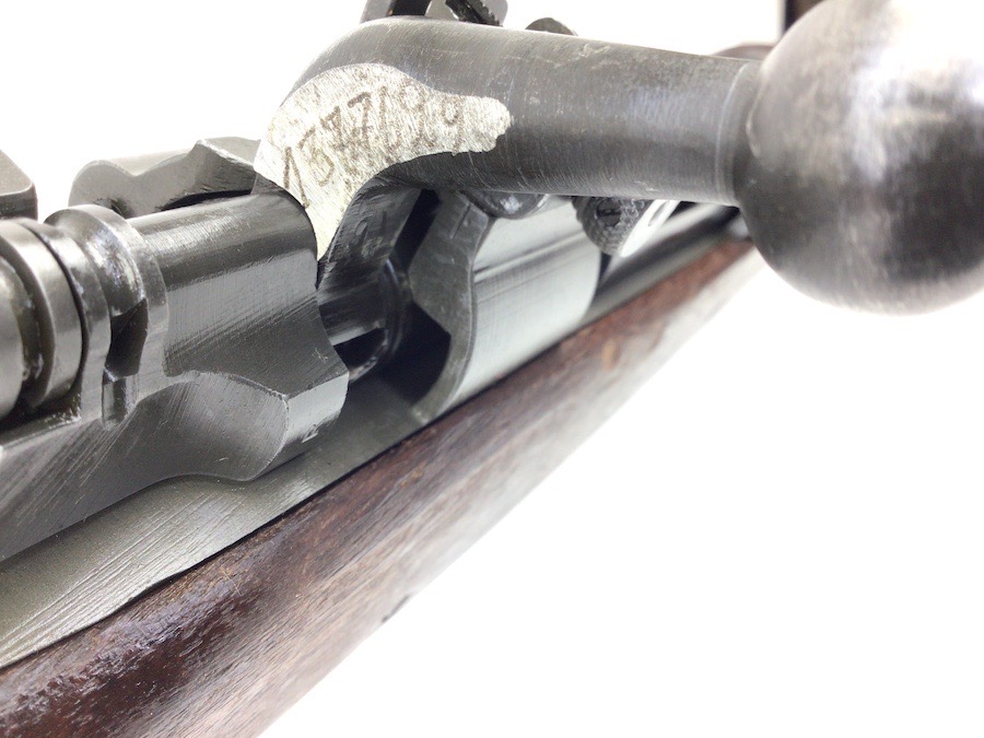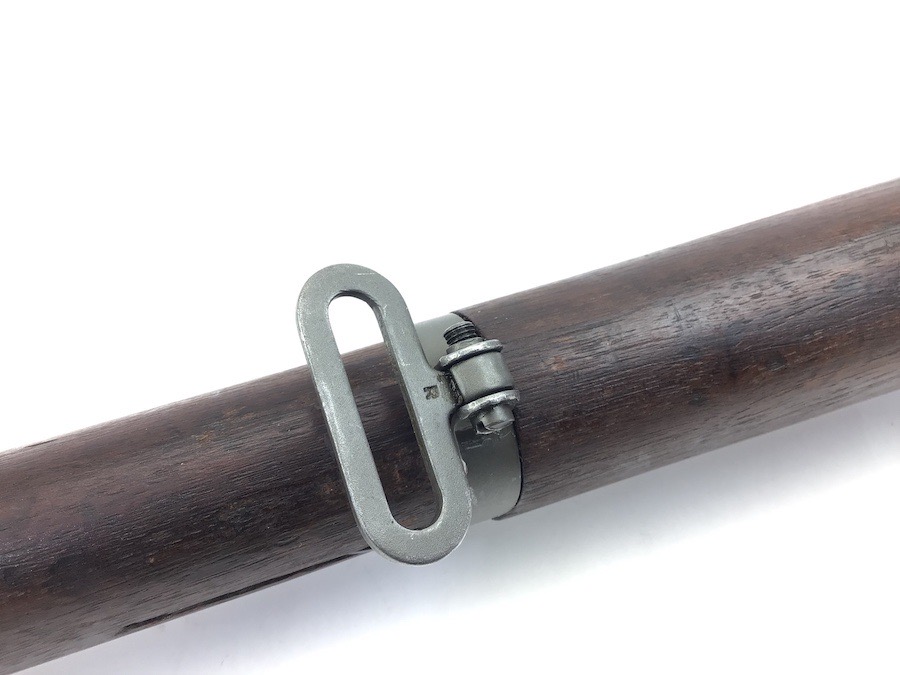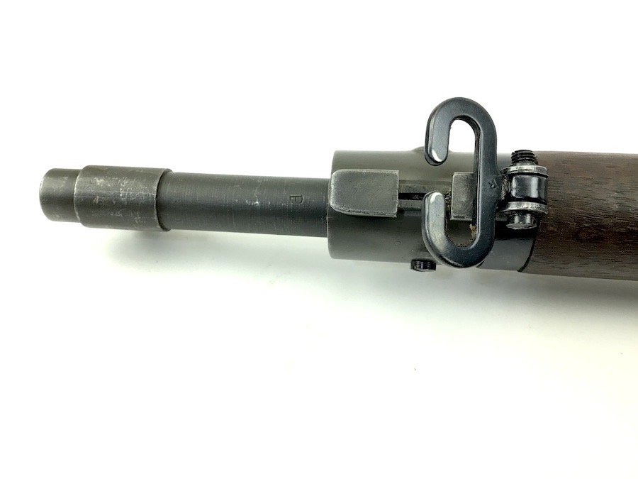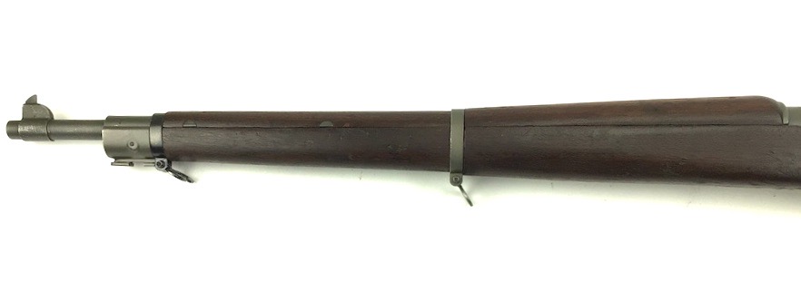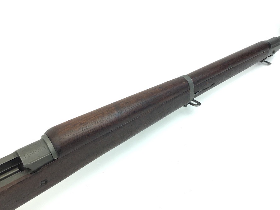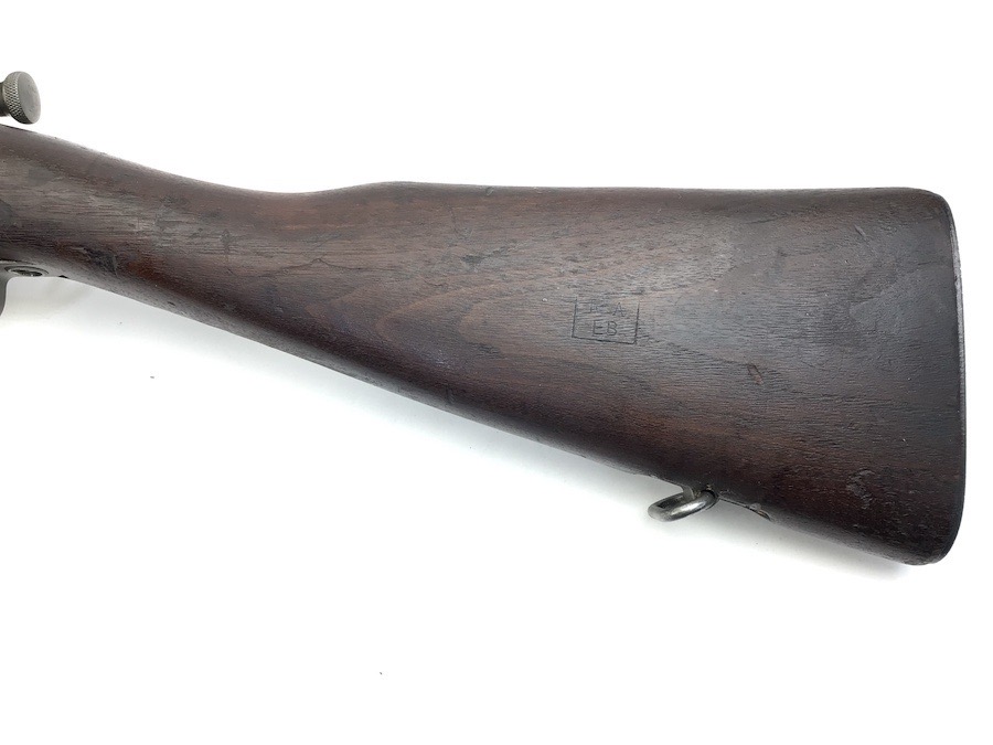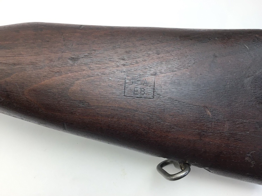 7/12/23 – This is a very nice example of a Remington Model 03-A3 rifle issued to the US military in November of 1943. The muzzle area is marked Remington and is dated September of 1943, along with the flaming bomb ordnance stamp. There is a “RIA EB” stamp on the left side of the stock, indicating the gun was re-worked at the Rock Island Arsenal. There is also a double stamp “P” proof on the grip area and the proper military inspection stamp “RA FJA” and cross-canon cartouche on the left of the stock. Overall, the gun is in very nice condition, with honest use wear on the stock. No cracks or significant chips in the wood. There isn’t much actual finish loss except for minor edge wear. We rate around 90-95% overall condition. The bore is very clean with great rifling. The serial number is pencil etched on the top part of the bolt and additional numbers etched on the back side of the bolt handle.