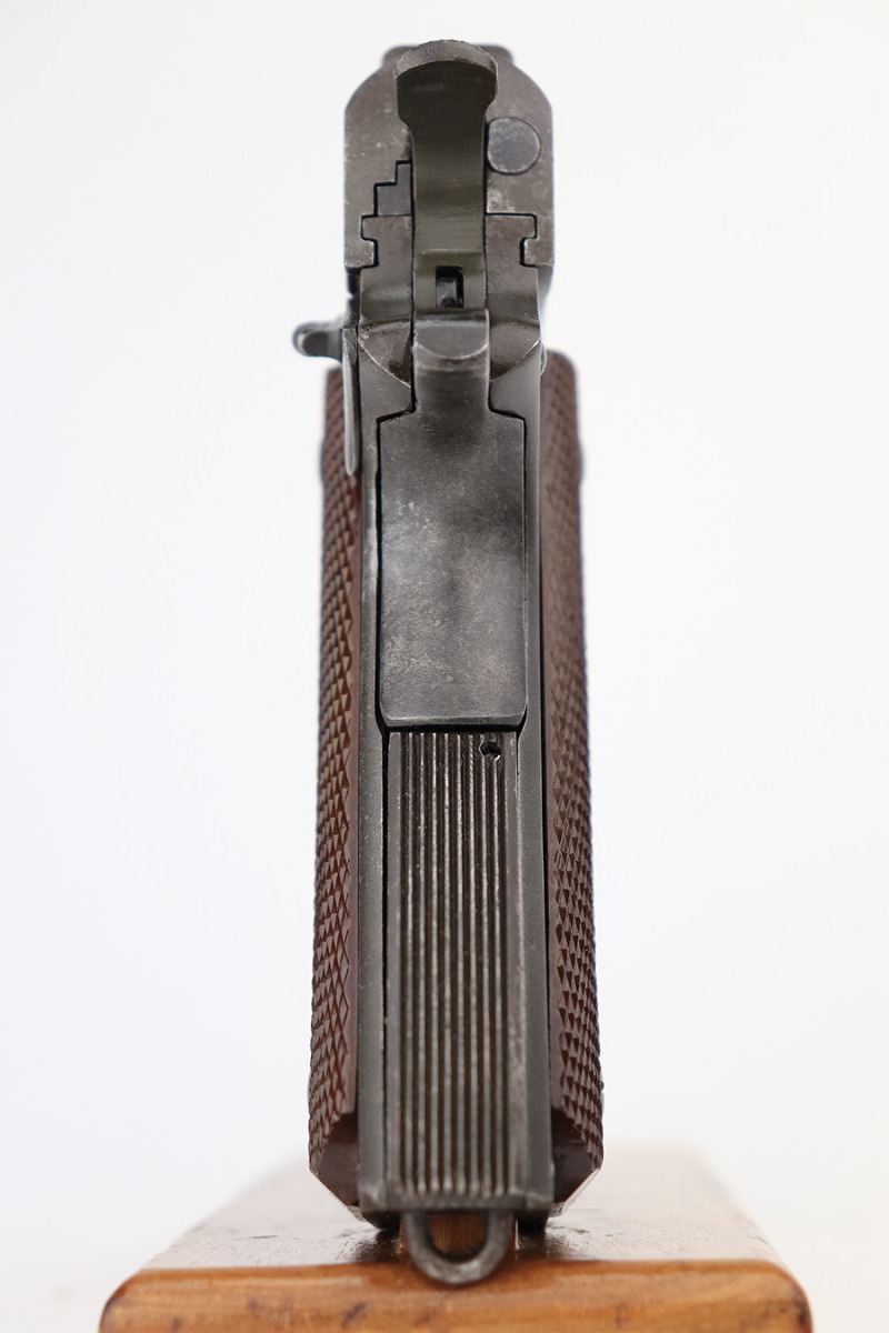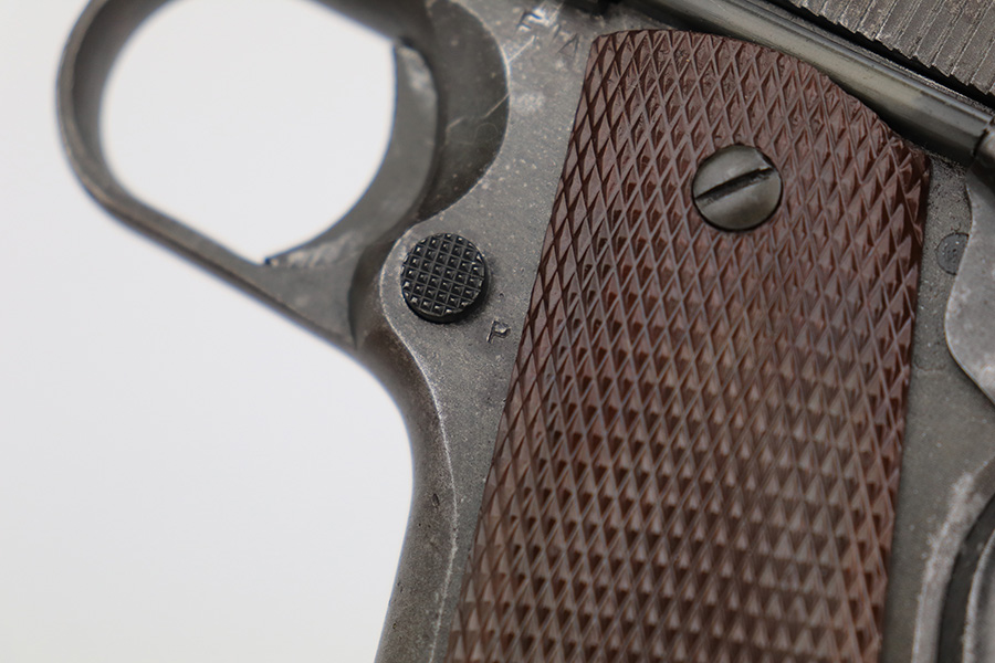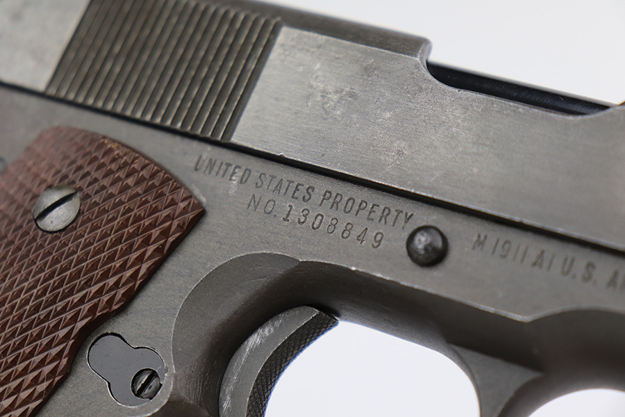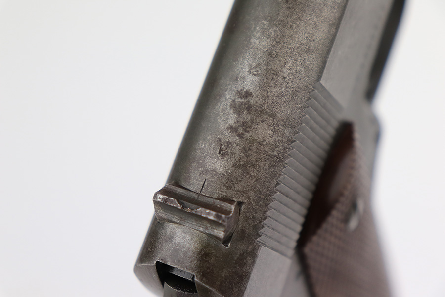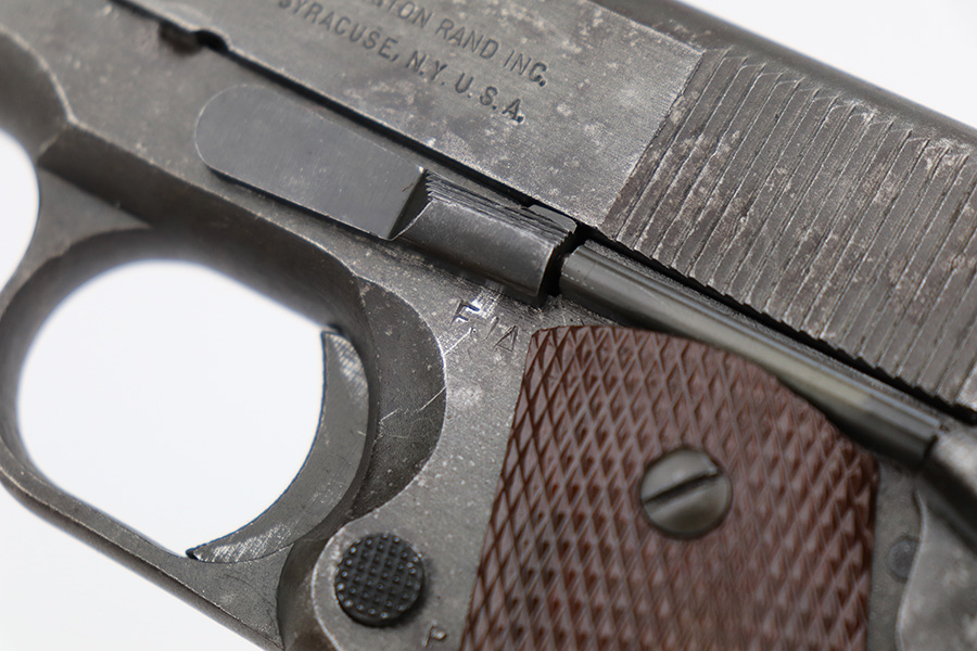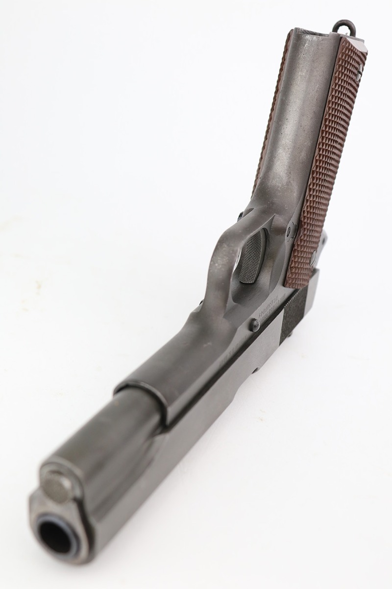 4/18/23 – This is a Remington Rand Model 1911A1 issued to the US military in early 1943. It is “United States Property” marked, has the proper “FJA” inspection stamp, and has a cross-cannon military cartouche on the right side of the frame. Proper High Standard barrel. The gun has retained roughly 85% of its original parkerized finish. There is thinning on the front strap, but the most obvious sign of wear is spotty discoloration and oxidation on most of the gun. There is a tiny ding in frame where it meets the slide on the left side. Fitted with correct reddish plastic grips. Comes with a period-correct “S” marked magazine. The bore has good rifling, but there is minor pitting around the muzzle end.