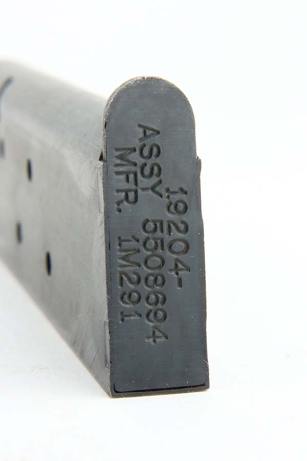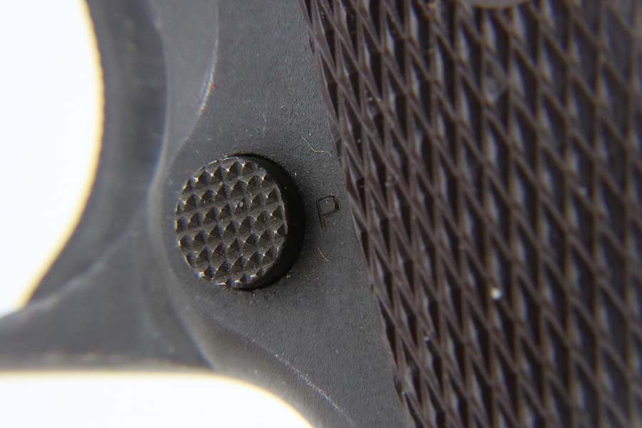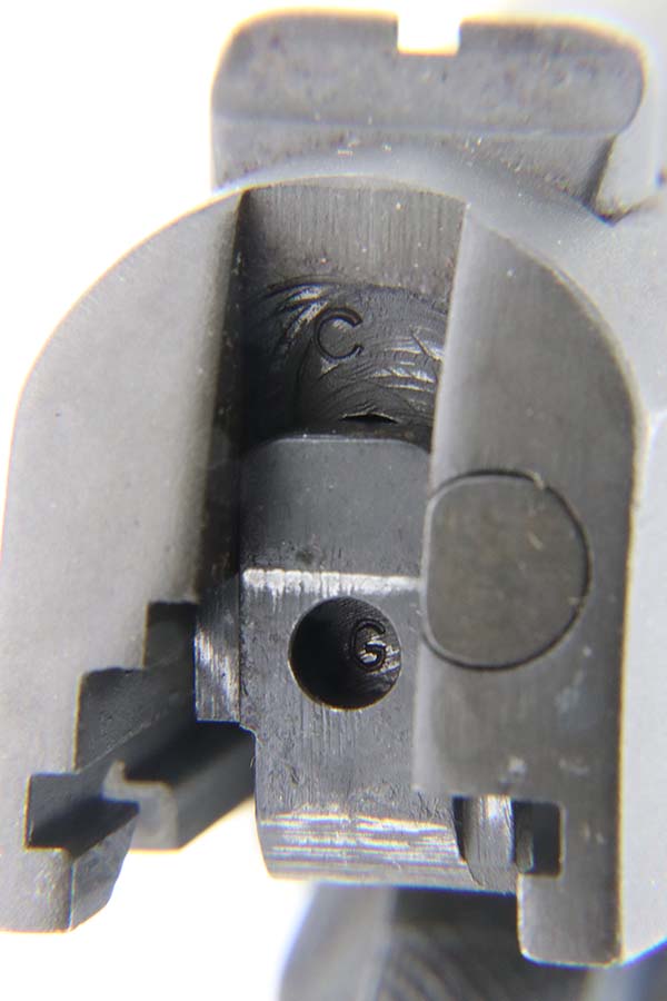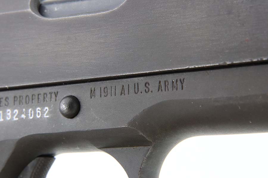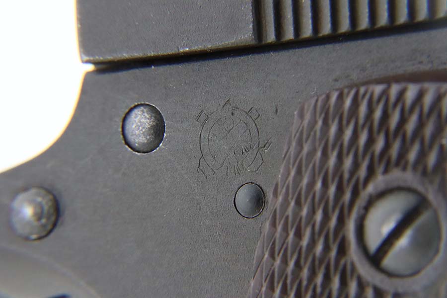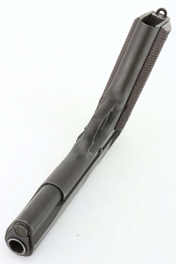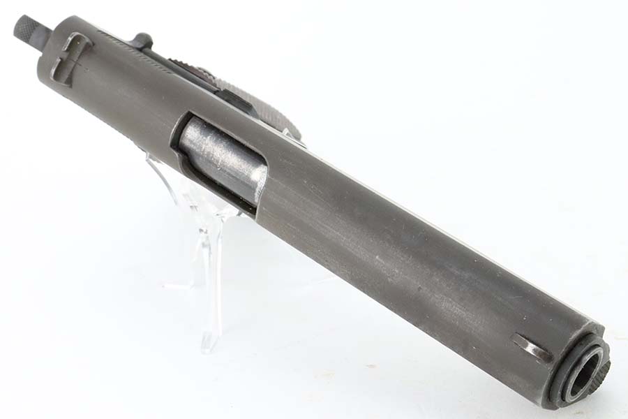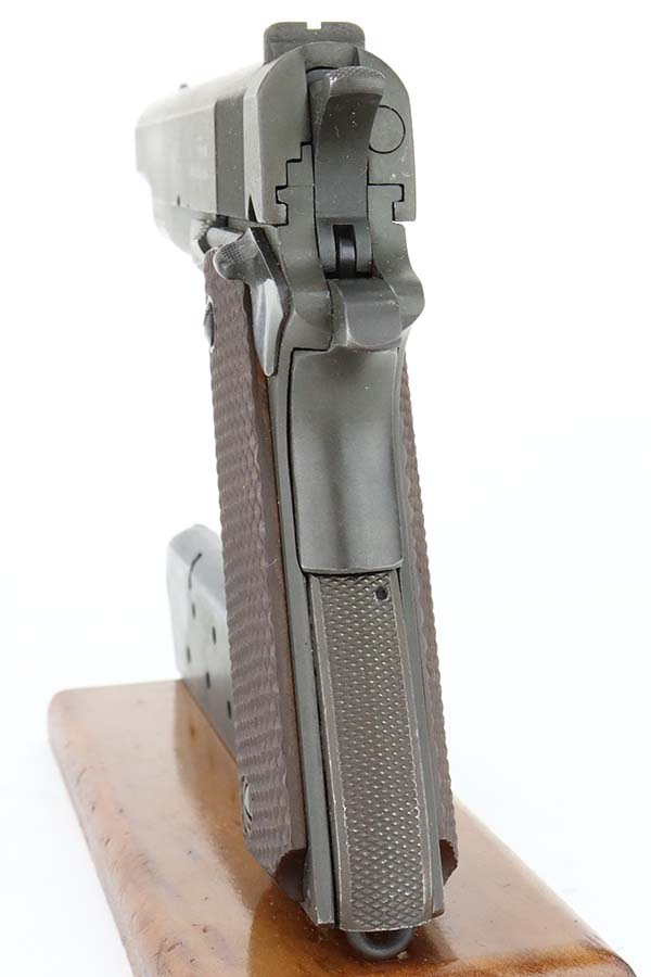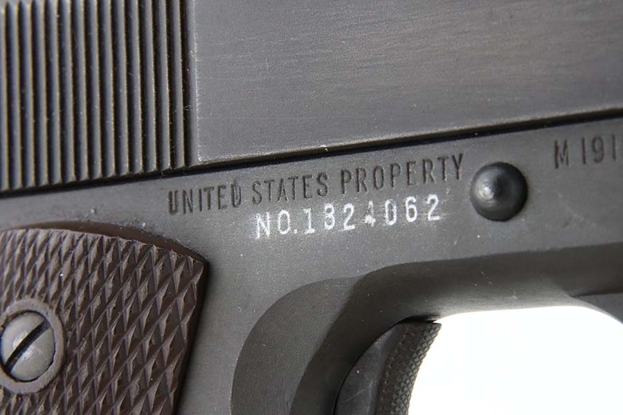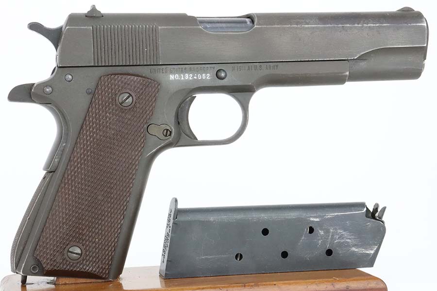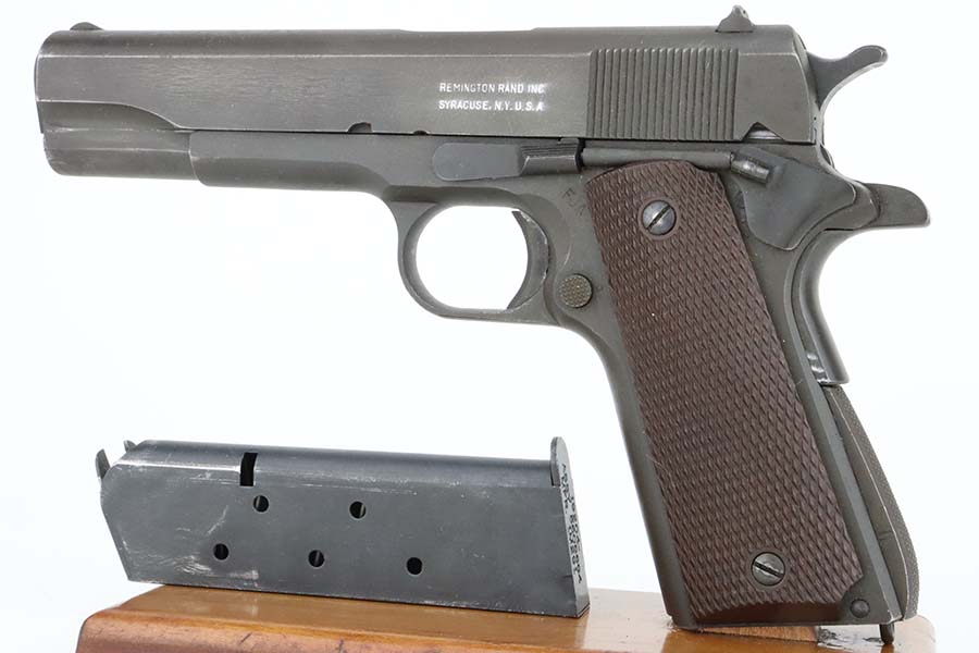 3/22/24 – This is an excellent example of a Remington Rand Model 1911A1 issued to the US military in 1943. It is all correct and has a proper “HS” High Standard barrel. It has retained nearly all of its parkerized finish, but there is an area of minor pitting on the right side of the slide. Fitted with period-correct reddish plastic grips and comes with one post-war magazine. The bore has decent rifling, but there is pin-pricking throughout.