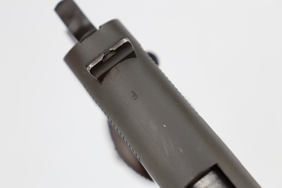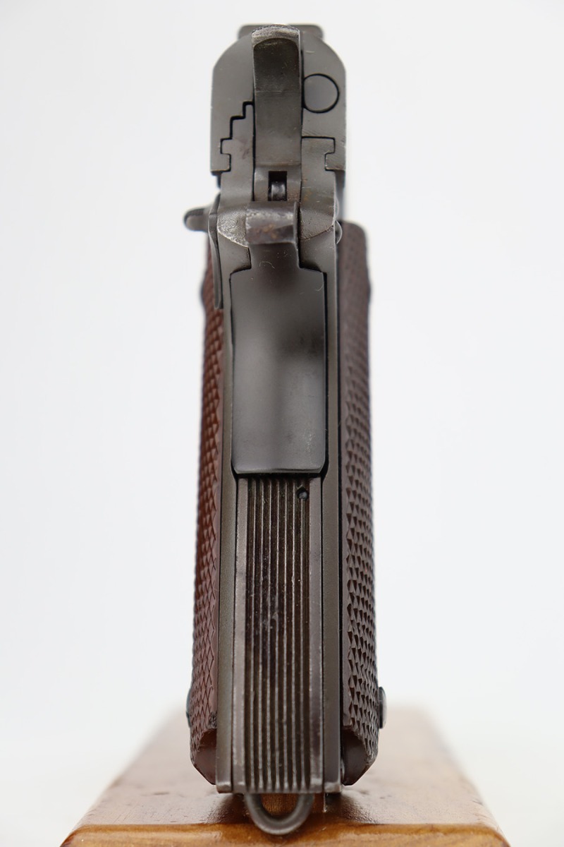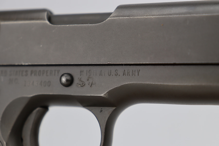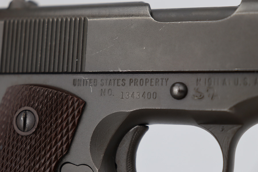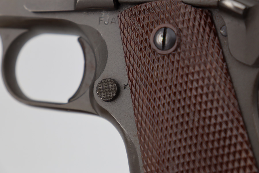 6/12/23 – This is an excellent example of a 1911A1 issued to the US military during WW2. The frame was made by Remington Rand and dates to 1943. The slide was made by Ithaca. It has a Springfield barrel that is marked “PX-4”. There is an “SA” marking on the right side of the frame, indicating it was reworked at the Springfield Armory. The entire gun has been arsenal-refurbished and refinished. As a result, the finish is really nice, and there is very little sign of wear. There are just some tiny dots of discoloration along the right side of the slide. Fitted with excellent period-correct reddish plastic grips. Comes with a period-correct “S” marked magazine. Minty bore.