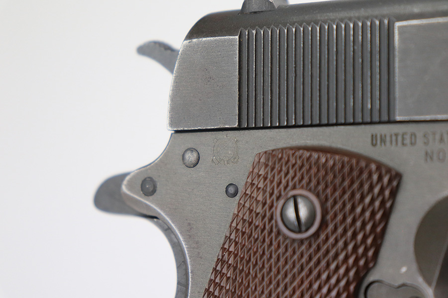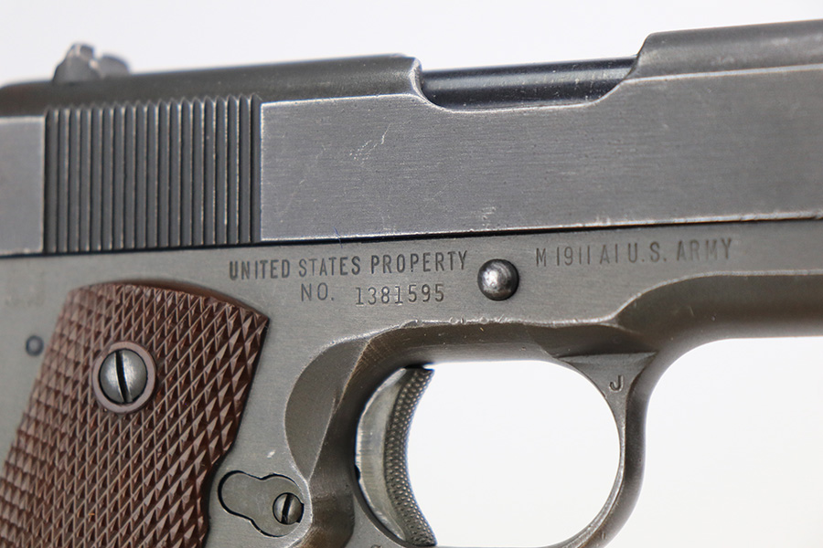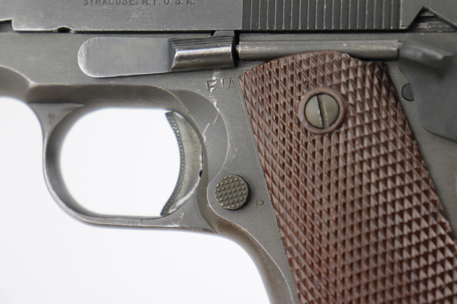 4/26/22 – This is a very nice example of a Remington Rand Model 1911A1 issued to the US military in 1943. The gun is “United States Property” marked, has the proper “FJA” inspection initials, and has a cross-canon military cartouche on the left side of the frame. High Standard barrel. The slide is the correct variation for this serial range, but the color does not match the frame exactly, so it’s likely the slide and frame were mated later. In any case, the gun has retained about 92-93% of its parkerized finish. The majority of the finish loss is on the front strap, but there is also minor wear on the high edges of the slide and around the muzzle. Comes with excellent period-correct plastic grips and a post-war magazine. Excellent bore with strong rifling.