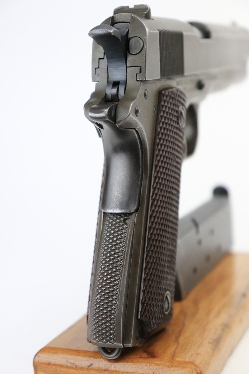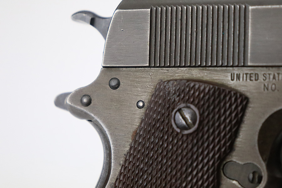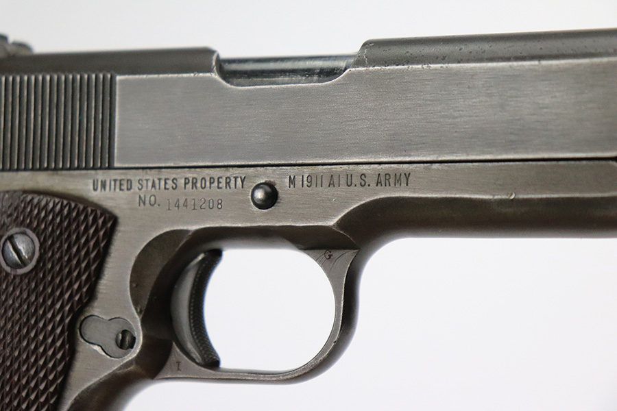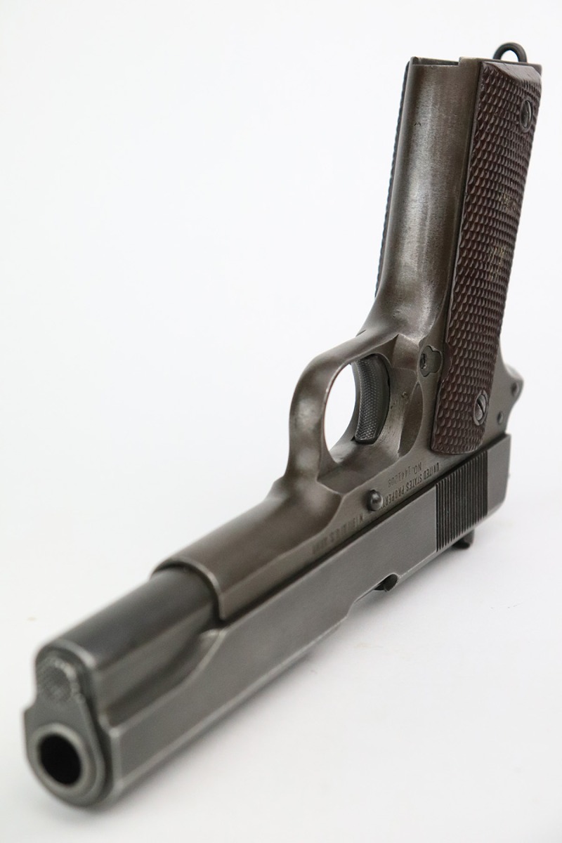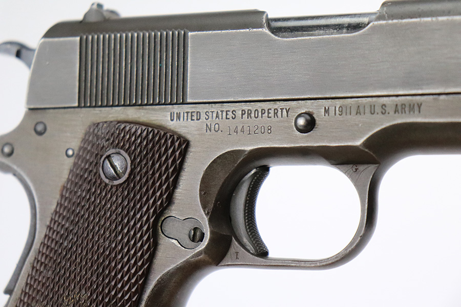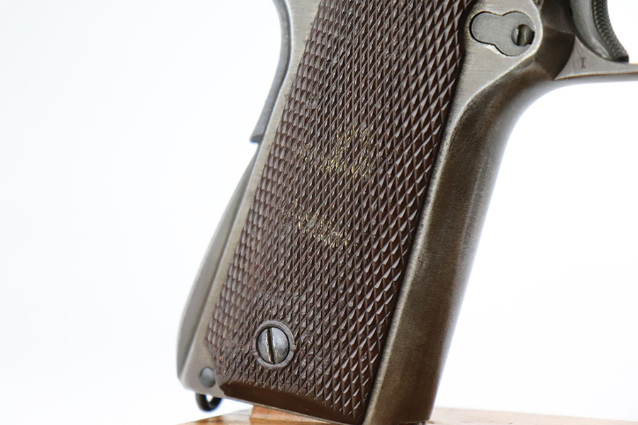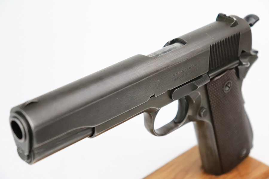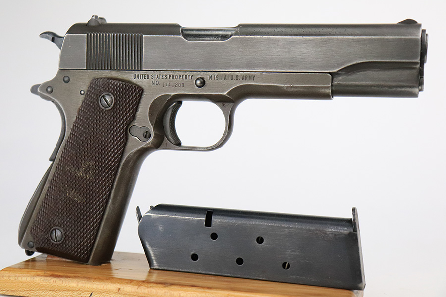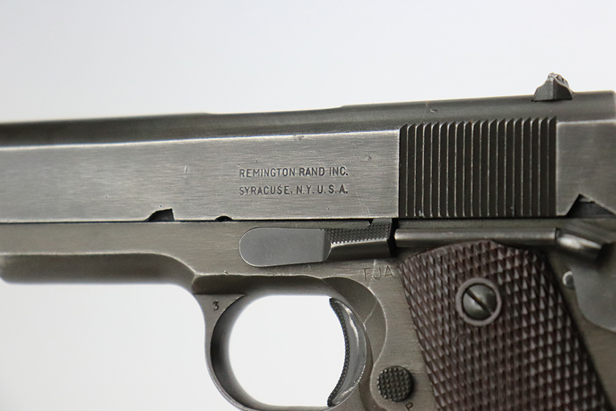 7/19/22 – This is a nice example of a Remington Rand Model 1911A1 issued to the US military in 1943. It is “United States Property” marked, has the proper “FJA” inspection initials, and has a cross-cannon military cartouche on the right side of the frame. Correct High Standard HS barrel. The gun has retained roughly 80% of its parkerized finish. There is minor wear on the high edges and general thinning throughout. There is an area of pitting on the top of the slide toward the muzzle. Comes with nice reddish plastic grips – the right panel has a faint “91” rack number. Also comes with a period-correct “R” marked magazine. Excellent bore with strong rifling.