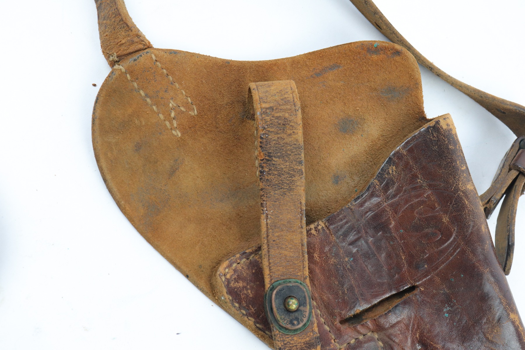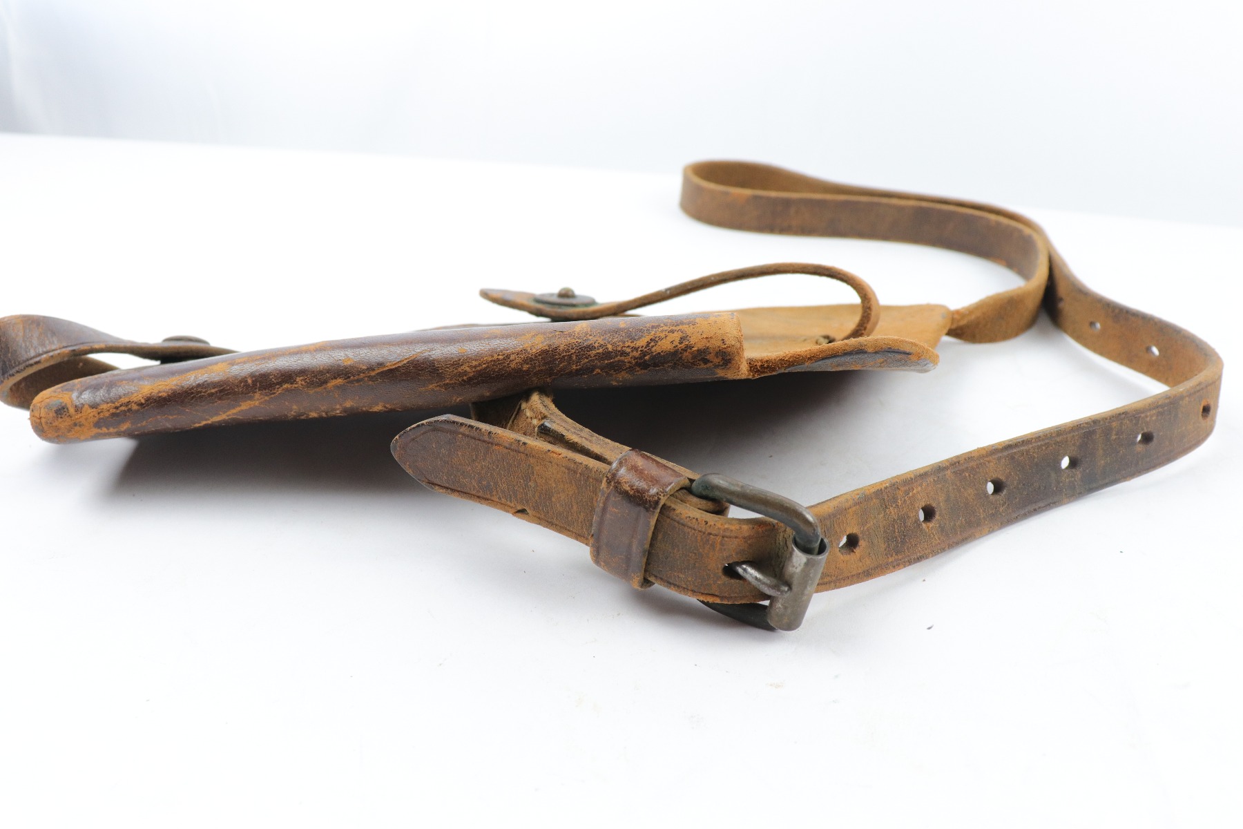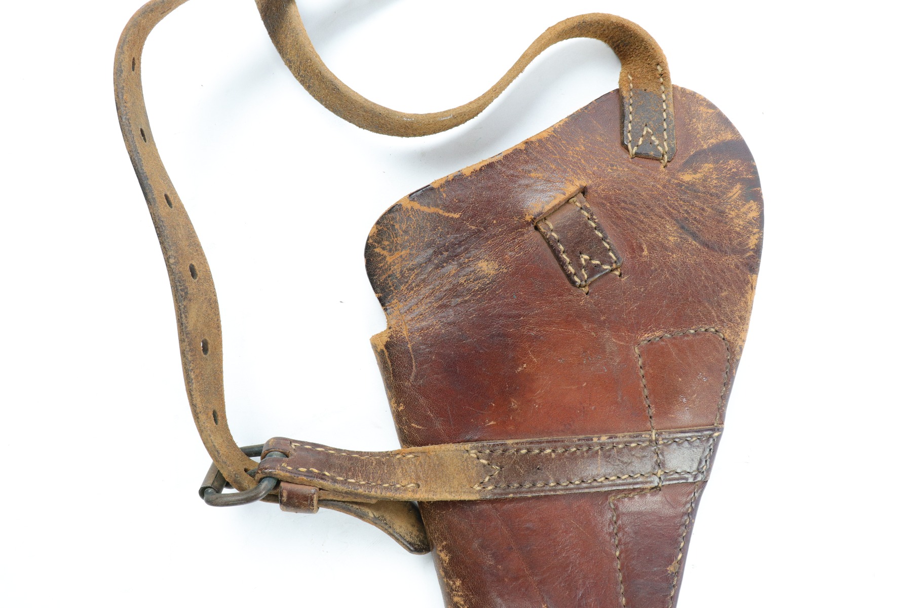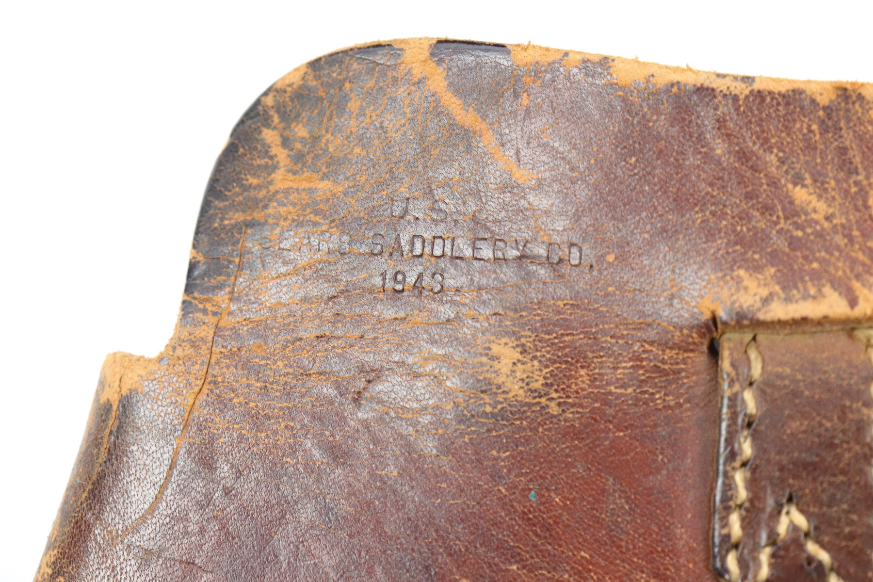 4/13/18 – This is an original 1943 dated Colt 1911A1 shoulder holster. The holster is stamped on the back by SEARS SADDLERY Co. and date stamped. The holster leather is pliable and worn, showing signs of use and aging throughout. The leather doesn’t have deep cracking or holes though and is in tact. The stitching is all original and in tact as well.