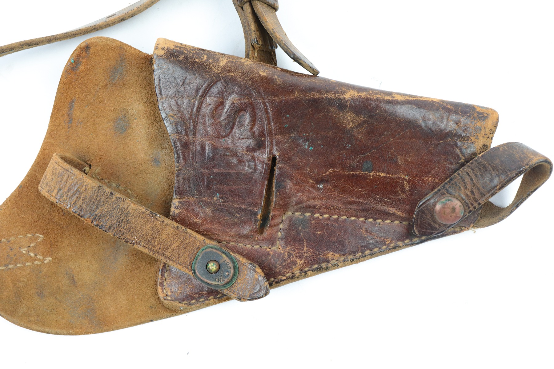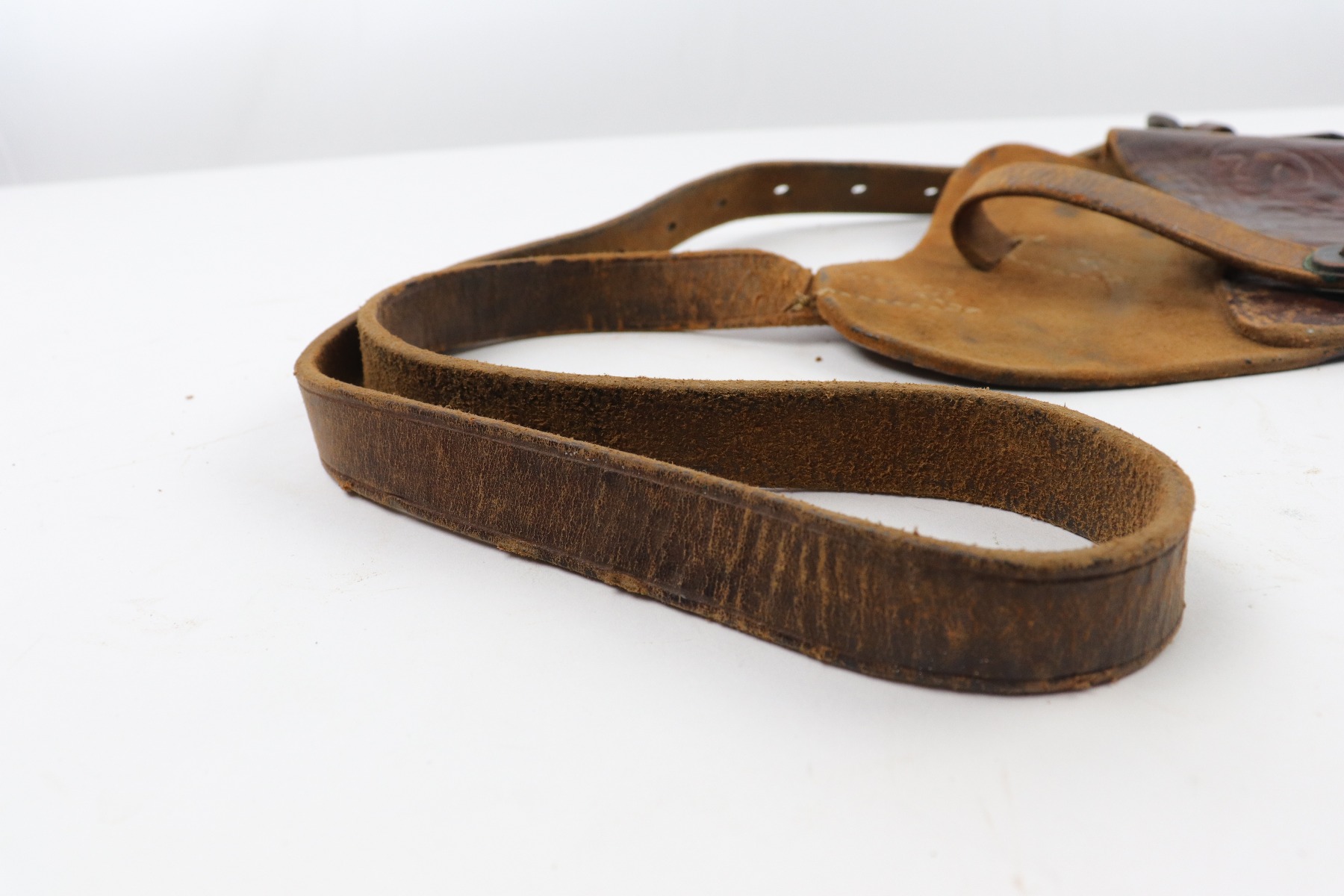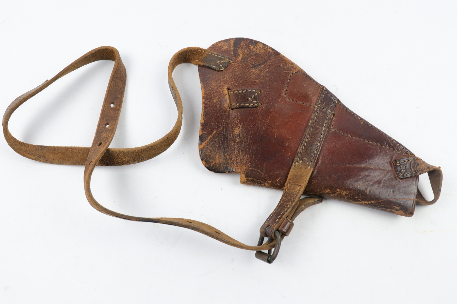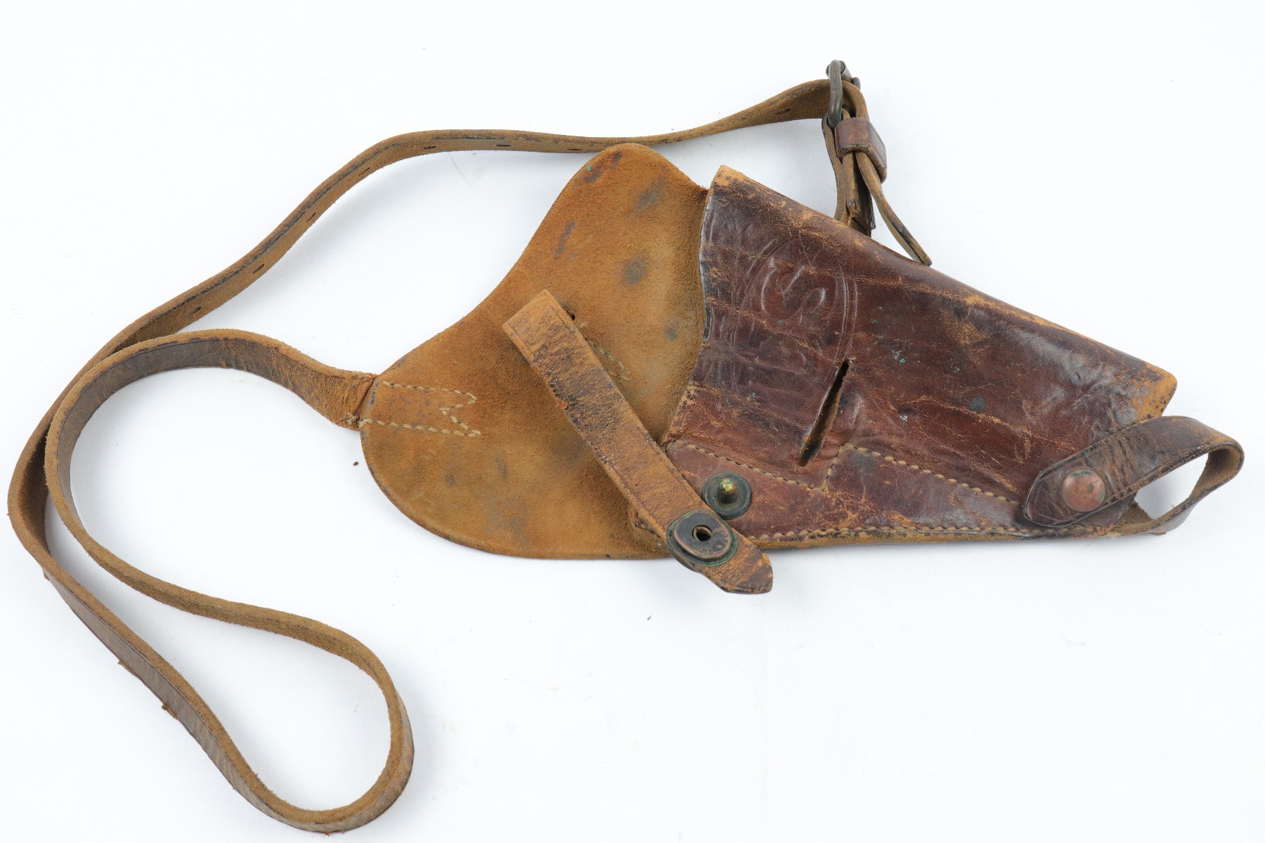 4/13/18 – This is an original 1943 dated Colt 1911A1 shoulder holster. The holster is stamped on the back by SEARS SADDLERY Co. and date stamped. The holster leather is pliable and worn, showing signs of use and aging throughout. The leather doesn’t have deep cracking or holes though and is in tact. The stitching is all original and in tact as well.