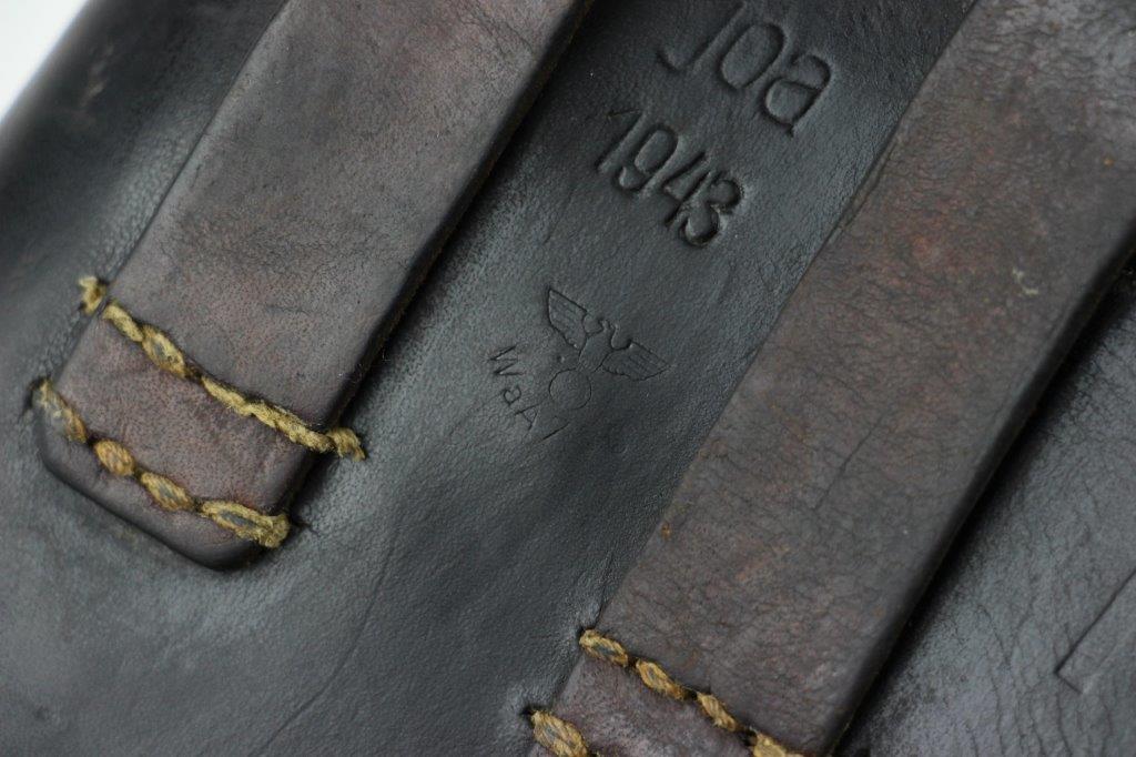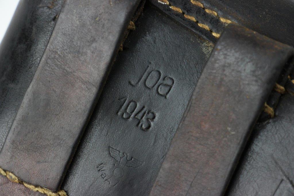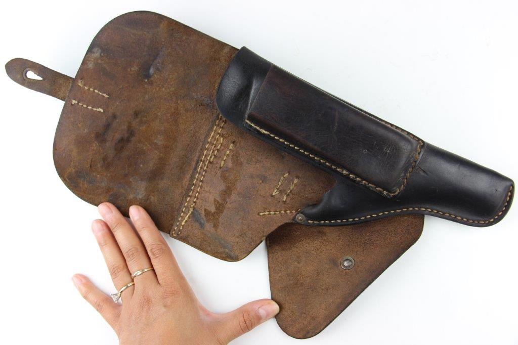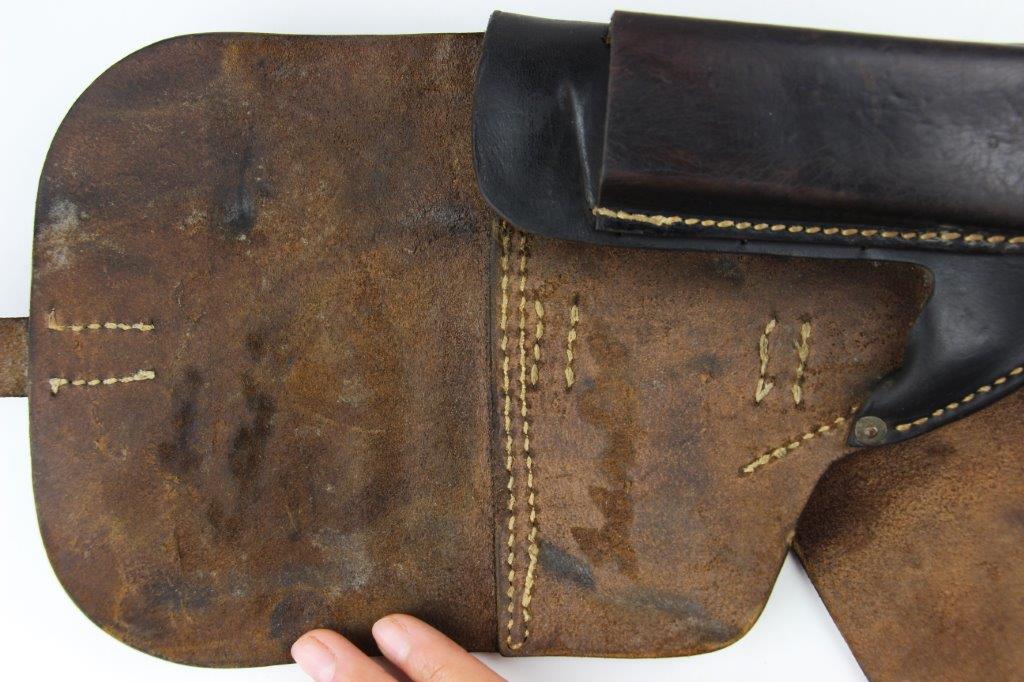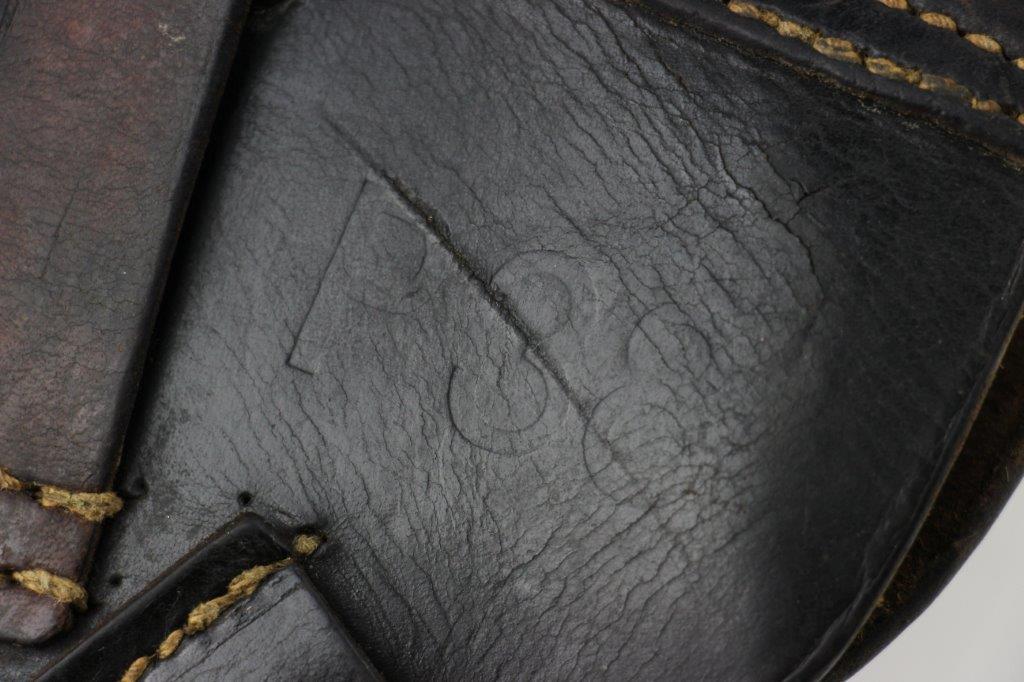 7/17/24 – This is a 1943 production soft-shell style P.38 holster from WW2. The holster is transitional in that the Germans switched from hard-shell to soft-shell style in 1943 due to time and supply constraints. This holster is in great overall condition with all original leather and stitching. The leather has some surface scratches and wrinkling on the front leather. Normal pliability and a distinct outline of a P.38 frame visible on the back leather (from having held a P.38 for some time, what we consider “honest wear”). The leather has a scuffed area on the back as well, shown in photos. The back leather is stamped with a maker code, date, waffen proof, and P.38 designation. The interior leather shows some scuffs and wear but no major issues.