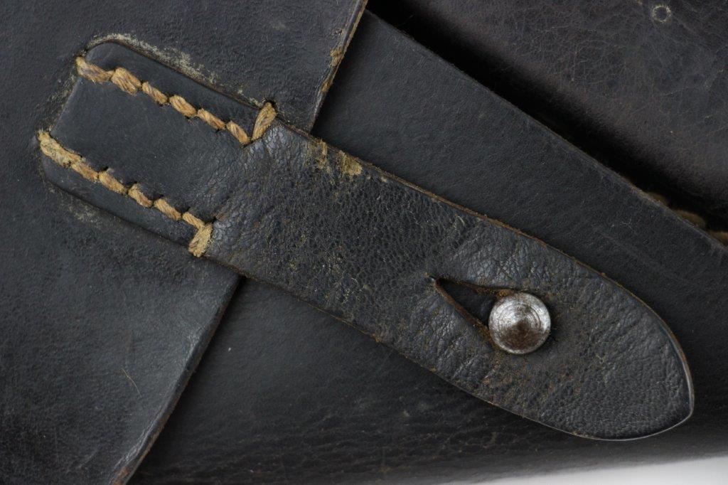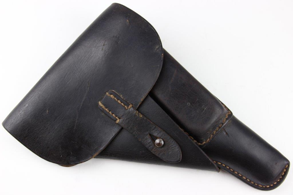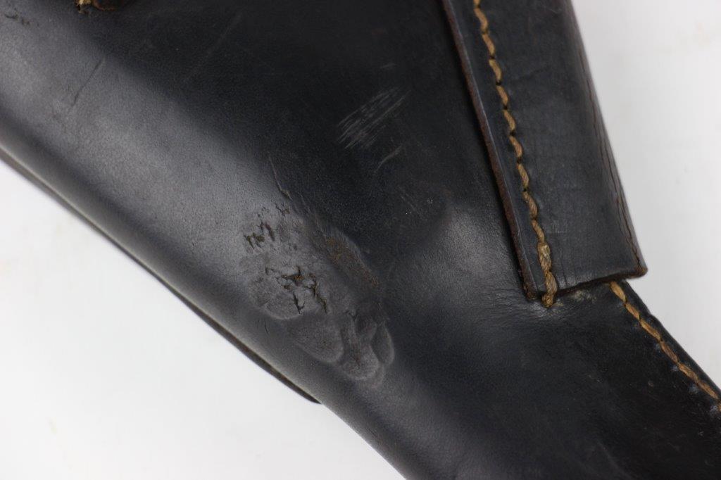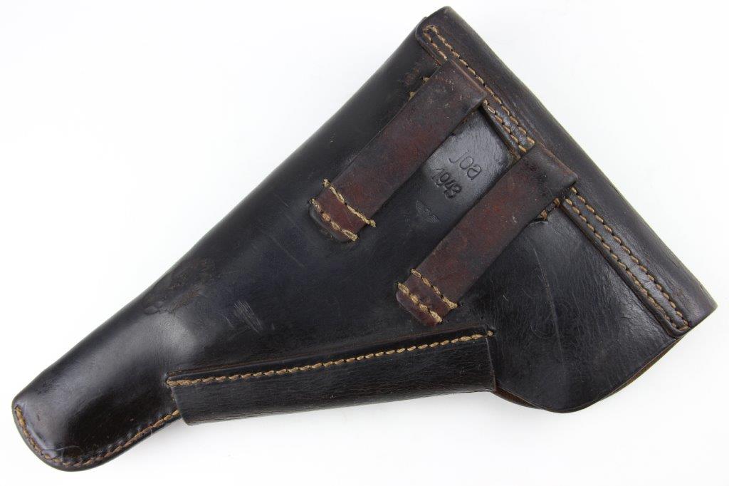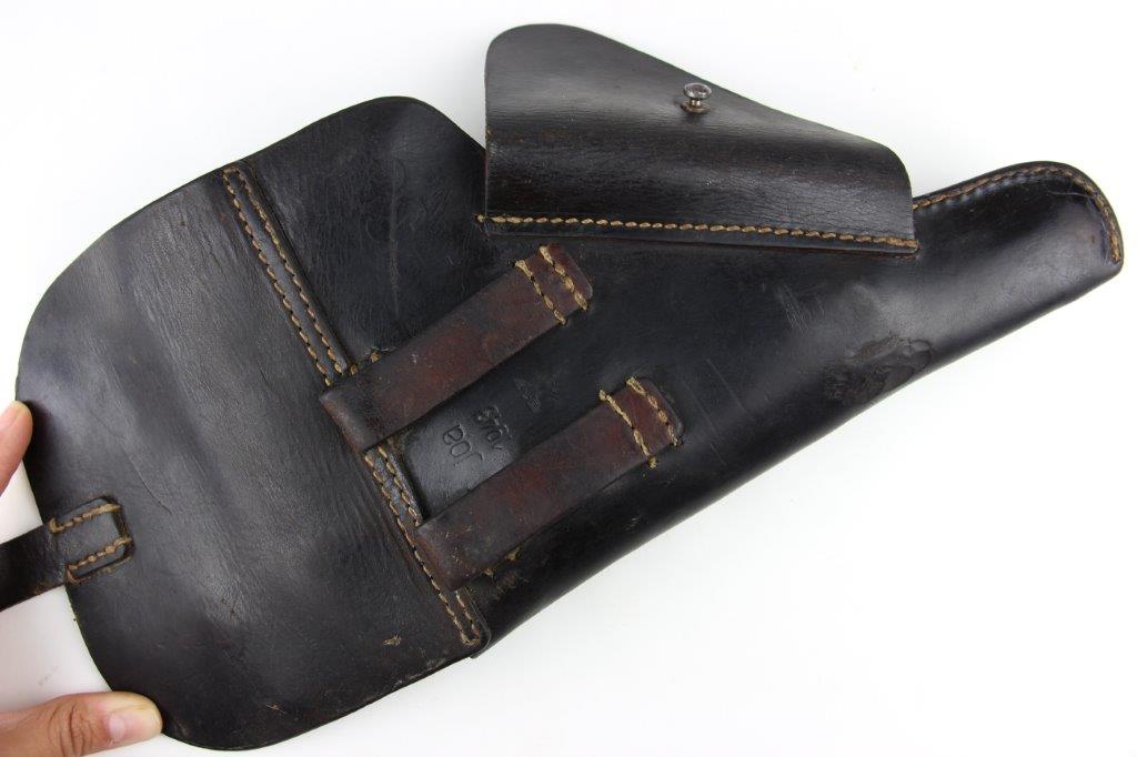 7/17/24 – This is a 1943 production soft-shell style P.38 holster from WW2. The holster is transitional in that the Germans switched from hard-shell to soft-shell style in 1943 due to time and supply constraints. This holster is in great overall condition with all original leather and stitching. The leather has some surface scratches and wrinkling on the front leather. Normal pliability and a distinct outline of a P.38 frame visible on the back leather (from having held a P.38 for some time, what we consider “honest wear”). The leather has a scuffed area on the back as well, shown in photos. The back leather is stamped with a maker code, date, waffen proof, and P.38 designation. The interior leather shows some scuffs and wear but no major issues.