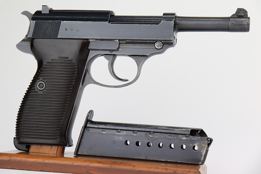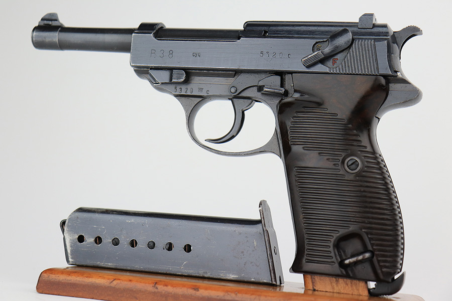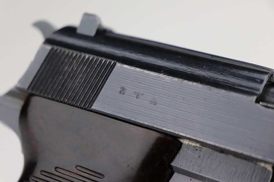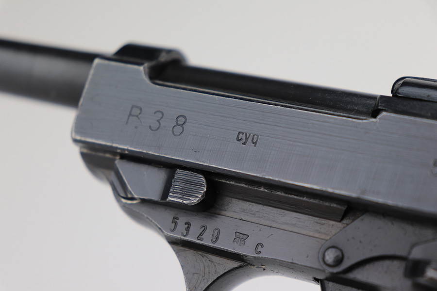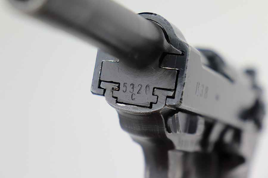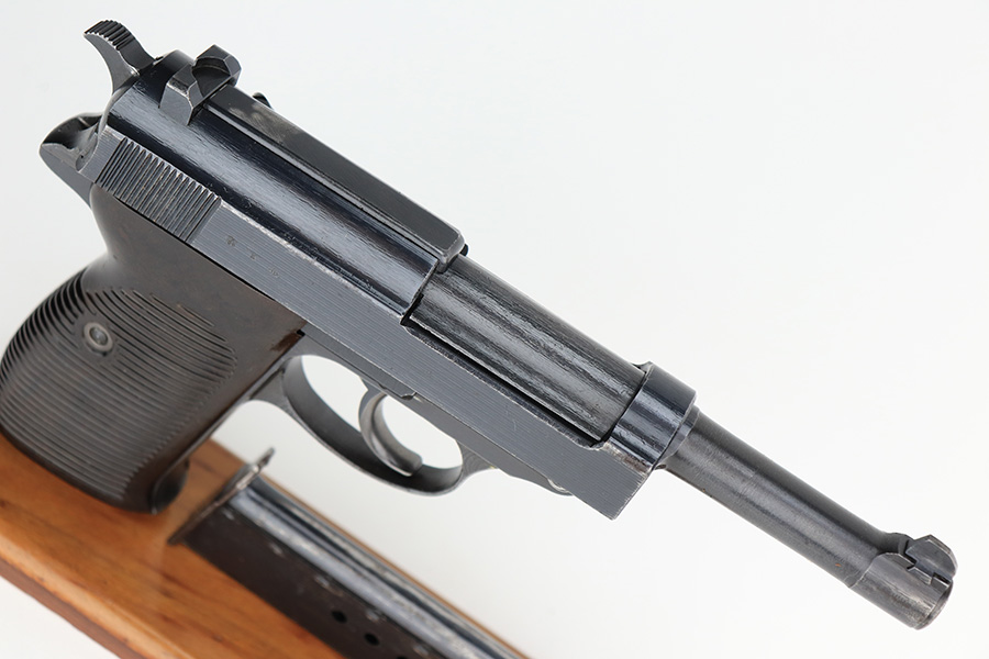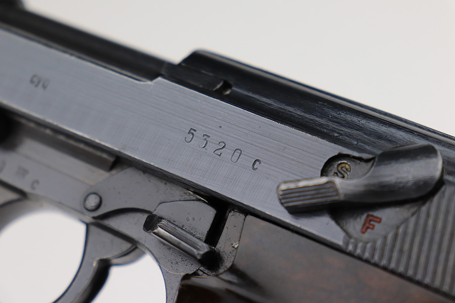 4/18/23 – This is a very nice example of a Spreewerk P.38 issued to the Nazi military in May of 1943. It is all matching and has the proper “Eagle 88” military acceptance proofs throughout. It has retained about 90% of its original finish. Almost all of the wear is on the front strap, but there is also one small area of wear on the top plate. Fitted with excellent blackish-brown bakelite grips. Comes with one period-correct jvd magazine. Excellent, shiny bore with strong rifling. De-cocker is functional.